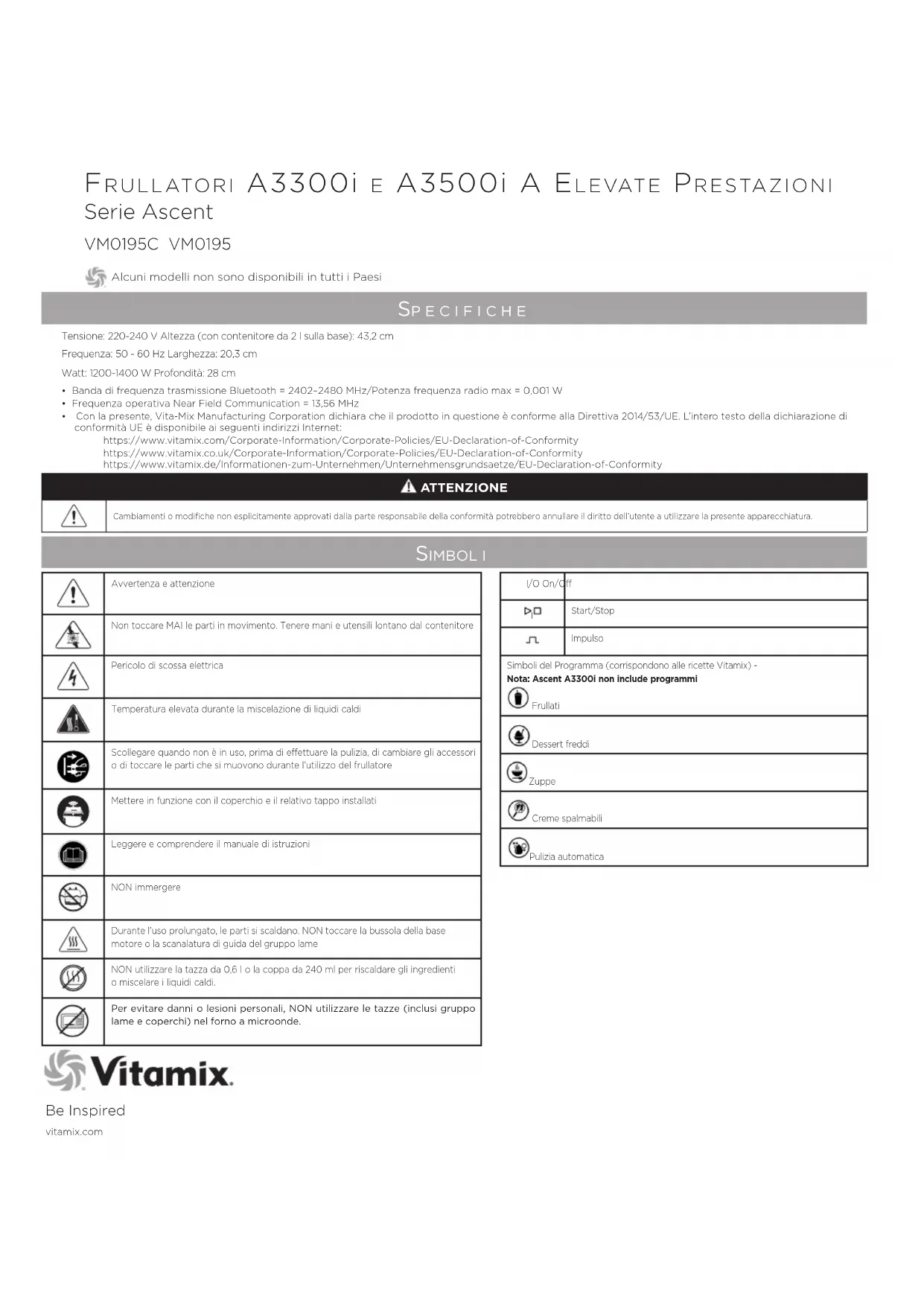 4Homes FZCO PO Box 61379, Dubaï EAU Tél.: +971 4 3807611 Fax: +971 4 387612 4homes@4homes.ae www.tavolashop.com ÉMIRATS ARABES UNIS Vitality General Trading LLC PO Box 73265 Dubaï Émirats Arabes Unis Tél.: +971 (0) 561089662 www.vitality.ae info@vitality.ae 4Homes FZCO PO Box 61379, Dubaï EAU Tél.: +971 4 3807611 Fax: +971 4 387612 4homes@4homes.ae www.tavolashop.com AUSTRALIE ET NOUVELLE-ZÉLANDE Vitamix ANZ Pty Limited 167 King St Newcastle NSW2300 Australie Tél.: 1-800-766437 (AUS) Tél.: 050-853-0697 (NZ) www.vitamix.com.au www.vitamix.co.nzfrullAtori A3300i e A3500i A elevAte PrestAzioni Serie Ascent Be Inspiredvitamix.com VM0185 Simbol i Sp e c i f i c h e Tensione: 220-240 V Altezza (con contenitore da 2 l sulla base): 43,2 cm Frequenza: 50 - 60 Hz Larghezza: 20,3 cmWatt: 1200-1400 W Profondità: 28 cmI/O On/Off Start/StopImpulsoSimboli del Programma (corrispondono alle ricette Vitamix) - Nota: Ascent A3300i non include programmi Frullati Dessert freddi Zuppe Creme spalmabiliPulizia automatica VM0195C VM0195 Alcuni modelli non sono disponibili in tutti i Paesi• Banda di frequenza trasmissione Bluetooth = 2402–2480 MHz/Potenza frequenza radio max = 0,001 W• Frequenza operativa Near Field Communication = 13,56 MHz