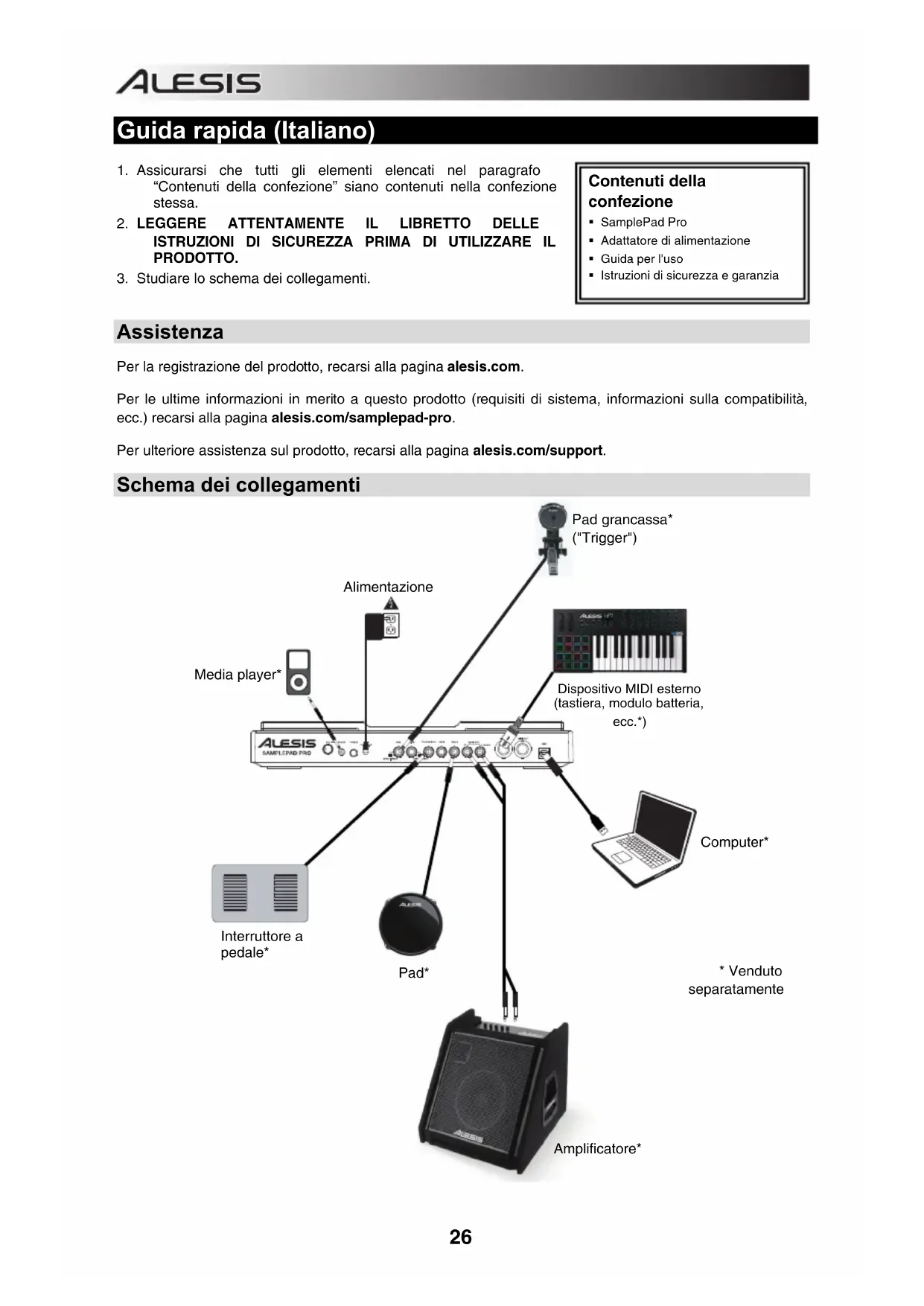 Assistenza Per la registrazione del prodotto, recarsi alla pagina alesis.com. Per le ultime informazioni in merito a questo prodotto (requisiti di sistema, informazioni sulla compatibilità, ecc.) recarsi alla pagina alesis.com/samplepad-pro. Per ulteriore assistenza sul prodotto, recarsi alla pagina alesis.com/support.