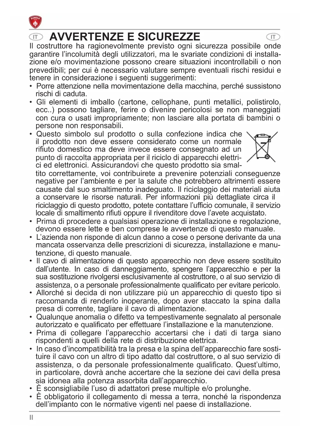 - Tale durata è condizionata da una opportuna pulizia e manutenzione. AVVERTENZE FONDAMENTALI