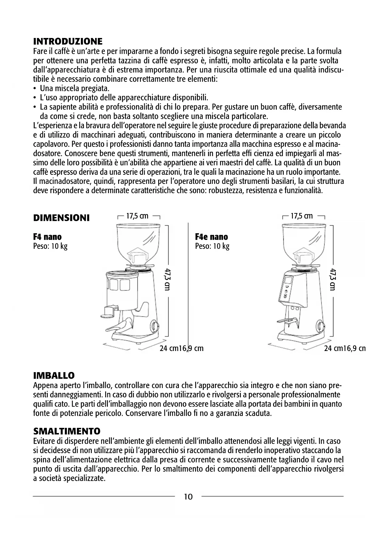 - La sapiente abilità e professionalità di chi lo prepara. Per gustare un buon caffè, diversamente da come si crede, non basta soltanto scegliere una miscela particolare. L’esperienza e la bravura dell’operatore nel seguire le giuste procedure di preparazione della bevanda e di utilizzo di macchinari adeguati, contribuiscono in maniera determinante a creare un piccolo capolavoro. Per questo i professionisti danno tanta importanza alla macchina espresso e al macina- dosatore. Conoscere bene questi strumenti, mantenerli in perfetta effi cienza ed impiegarli al mas- simo delle loro possibilità è un’abilità che appartiene ai veri maestri del caffè. La qualità di un buon caffè espresso deriva da una serie di operazioni, tra le quali la macinazione ha un ruolo importante. Il macinadosatore, quindi, rappresenta per l’operatore uno degli strumenti basilari, la cui struttura deve rispondere a determinate caratteristiche che sono: robustezza, resistenza e funzionalità. DIMENSIONI DESCRIZIONE GENERALE IMBALLO Appena aperto l’imballo, controllare con cura che l’apparecchio sia integro e che non siano pre- senti danneggiamenti. In caso di dubbio non utilizzarlo e rivolgersi a personale professionalmente qualifi cato. Le parti dell’imballaggio non devono essere lasciate alla portata dei bambini in quanto fonte di potenziale pericolo. Conservare l’imballo fi no a garanzia scaduta. SMALTIMENTO Evitare di disperdere nell’ambiente gli elementi dell’imballo attenendosi alle leggi vigenti. In caso si decidesse di non utilizzare più l’apparecchio si raccomanda di renderlo inoperativo staccando la spina dell’alimentazione elettrica dalla presa di corrente e successivamente tagliando il cavo nel punto di uscita dall’apparecchio. Per lo smaltimento dei componenti dell’apparecchio rivolgersi a società specializzate. F4 nano Peso: 10 kg F4e nano Peso: 10 kg 17,5 cm 47,3 cm 24 cm16,9 cm 17,5 cm 47,3 cm 24 cm16,9 cm11 DESCRIZIONE GENERALE IMBALLO Appena aperto l’imballo, controllare con cura che l’apparecchio sia integro e che non siano pre- senti danneggiamenti. In caso di dubbio non utilizzarlo e rivolgersi a personale professionalmente qualifi cato. Le parti dell’imballaggio non devono essere lasciate alla portata dei bambini in quanto fonte di potenziale pericolo. Conservare l’imballo fi no a garanzia scaduta. SMALTIMENTO Evitare di disperdere nell’ambiente gli elementi dell’imballo attenendosi alle leggi vigenti. In caso si decidesse di non utilizzare più l’apparecchio si raccomanda di renderlo inoperativo staccando la spina dell’alimentazione elettrica dalla presa di corrente e successivamente tagliando il cavo nel punto di uscita dall’apparecchio. Per lo smaltimento dei componenti dell’apparecchio rivolgersi a società specializzate. Coperchio campana Campana (contenitore del caffè in grani) Serranda Ghiera per regolazione macinatura Coperchio dosatore Gruppo dosatore Forchetta porta filtro Pressino Interruttore acceso / spento Leva dosatore per prelievo caffè in grani F4 nano F4e nano Coperchio campana Campana (contenitore del caffè in grani) Serranda Ghiera per regolazione macinatura Forchetta porta filtro Interruttore acceso / spento Macinatura singola Display Macinatura manuale continua Macinatura doppia12 IMPIEGO Questo apparecchio è stato concepito esclusi- vamente per macinare caffè in grani. Ogni altro uso è da considerarsi improprio e pertanto pe- ricoloso. Il costruttore declina ogni responsa- bilità per eventuali danni dovuti ad uso impro- prio od errato. Non utilizzare l’apparecchio per macinare altri tipi di alimenti o altro. I maci- nadosatori e macinacaffè di nostra produzione sono apparecchi destinati a personale tecnico qualificato per un utilizzo esclusivamente pro- fessionale e non per un uso domestico. AVVERTENZE
