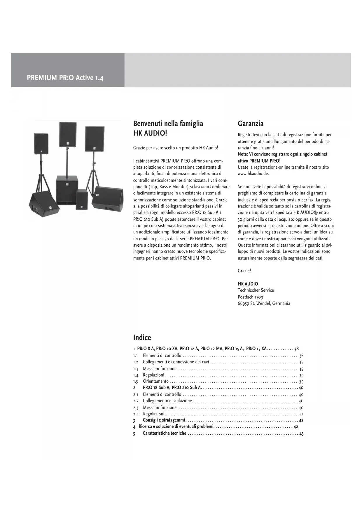 - PR:O 12 MA + PR:O 12 M active, stereo active/passive, mono Monitoring Systems 4 x PR:O 8 A + 2 x PR:O 210 Sub A 4 x PR:O 8 A + 2 x PR:O 18 Sub A35 Español 5 Datos técnicos Denominación PR:O 8 A PR:O 10 XA PR:O 12 A PR:O 12 MA PR:O 15 A PR:O 15 XA PR:O 18 Sub A PR:O 210 Sub A Respuesta de frecuencia: +/- 3dB: 89 Hz - 19 kHz 89 Hz - 19 kHz 85 Hz - 19 kHz 85 Hz - 19 kHz 55 Hz - 19 kHz 55 Hz - 19 kHz 48 Hz - fx 60 Hz - fx -10 dB: 63 Hz - 19 kHz 67 Hz - 19 kHz 78 Hz - 19 kHz 78 Hz - 19 kHz 48 Hz - 19 kHz 48 Hz - 19 kHz 38 Hz - fx 40 Hz - fx Max SPL (medio espacio): 118 dB 121 dB 123 dB 123 dB 123 dB 123 dB 125 dB 123 dB Altavoces: Bass / Mid: 8" 10" 12" 12" 15" 15" 18" 2x 10" Driver de agudos: 1" 1" 1" 1" 1" 1" - - Protección de tonos agudos: (pasiva) Circuito protector Dyn Circuito protector Dyn Circuito protector Dyn Circuito protector Dyn Circuito protector Dyn Circuito protector Dyn Circuito protector Dyn Circuito protector Dyn Característica de bocina: 80° x 80 CD bocina 90° x 60° CD bocina 60° x 40 CD bocina 60° x 40° CD bocina 60° x 40° CD bocina 60° x 40° CD bocina - - Etapas finales: 1x 600 vatios 1x 600 vatios 1x 600 vatios 1x 600 vatios 1x 600 vatios 1x 600 vatios 1x 600 vatios 1x 600 vatios Class D - 4 Ohmios Class D - 4 Ohmios Class D - 4 Ohmios Class D - 4 Ohmios Class D - 4 Ohmios Class D - 4 Ohmios Class D - 4 Ohmios Class D - 4 Ohmios Limitador: Limitador de sonido RMS: si si si si si si no no Limitador protector de picos: si si si si si si si si Filtro subsónico: 35 Hz 35 Hz 35 Hz 68 Hz 35 Hz 35 Hz 35 Hz 35 Hz Frecuencia de separación - - - - - - 75-150 Hz seleccionable 75-150 Hz seleccionable de crossover: (12 dB octavo) Regulación de sonido: Regulador de tonos Regulador de tonos Regulador de tonos - Regulador de tonos Regulador de tonos - - Conexiones: Line/Mic In: 1x Con.hembra combin. 1x Con.hembra combin. 1x Con.hembra combin. 1x Con.hembra combin. 1x Con.hembra combin. 1x Con.hembra combin. 2x Con.hembra combin. 2x Con.hembra combin. simétrica Through, simétrica: 1x XLR Through 1x XLR Through 1x XLR Through 1x XLR Through 1x XLR Through 1x XLR Through 2x XLR Through 2x XLR Through Out, simétrica: - - - - - - 2x XLR L/R Out Mid/High 2x XLR L/R Out Mid/High Parallel Speaker Out* 1x Speakon 1x Speakon 1x Speakon 1x Speakon 1x Speakon 1x Speakon - - Brida para soporte en altura: MonoTilt™ DuoTilt 3/7 DuoTilt 3/7 - DuoTilt 3/7 DuoTilt 3/7 Brida roscada M20 2x Brida roscada M20 Puntos de sujeción 2x M8 3x M8 3x M8 3x M8 3x M8 3x M8 - - Peso: 11 kg / 24.3 lbs. 13,9 kg / 30.6 lbs. 19,5 kg / 43 lbs. 17,1 kg / 37,7 lbs. 23,5 kg / 51,8 lbs. 22,4 kg / 49,4 lbs. 39,8 kg / 87,8 lbs. 27,2 kg / 55 lbs. Dimensiones (axAxP): 27 x 42 x 27 cm 32 x 48 x 29 cm 39 x 57 x 36 cm 39 x 55,5 x 38 cm 47 x 61,5 x 41,5 cm 47 x 61,5 x 44,5 cm 53 x 61 x 64 cm 36 x 61 x 53 cm *) impedancia 8 Ohmios, 300 VatiosPREMIUM PR:O Active 1.4 Benvenuti nella famiglia HK AUDIO! Grazie per avere scelto un prodotto HK Audio! I cabinet attivi PREMIUM PR:O offrono una com- pleta soluzione di sonorizzazione consistente di altoparlanti, finali di potenza e una elettronica di controllo meticolosamente sintonizzata. I vari com- ponenti (Top, Bass e Monitor) si lasciano combinare o facilmente integrare in un esistente sistema di sonorizzazione come soluzione stand-alone. Grazie alla possibilità di collegare altoparlanti passivi in parallela (ogni modello eccesso PR:O 18 Sub A / PR:O 210 Sub A) potete estendere il vostro cabinet in un piccolo sistema attivo senza aver bisogno di un addizionale amplificatore utilizzando idealmente un modello passivo della serie PREMIUM PR:O. Per avere a disposizione un rendimento ottimo, i nostri ingegneri hanno creato nuove tecnologie specifica- mente per i cabinet attivi PREMIUM PR:O. Garanzia Registratevi con la carta di registrazione fornita per ottenere gratis un allungamento del periodo di ga- ranzia fino a 5 anni! Nota: Vi conviene registrare ogni singolo cabinet attivo PREMIUM PR:O! Usate la registrazione-online tramite il nostro sito www.hkaudio.de. Se non avete la possibilità di registrarvi online vi preghiamo di completare la cartolina di garanzia inclusa e di spedircela per posta o per fax. La regis- trazione è valida soltanto se la cartolina di registra- zione riempita verrà spedita a HK AUDIO® entro 30 giorni dalla data di acquisto oppure se in questo periodo avverrà la registrazione online. Oltre a scopi di garanzia, la registrazione serve a darci un’idea su come e dove i nostri apparecchi vengono utilizzati. Queste informazioni ci saranno utili riguardo al svi- luppo di nuovi prodotti. Le vostre indicazioni sono naturalmente coperte dalla segretezza dei dati. Grazie! HK AUDIO Technischer Service Postfach 1509 66959 St. Wendel, Germania Indice 1 PR:O 8 A, PR:O 10 XA, PR:O 12 A, PR:O 12 MA, PR:O 15 A, PR:O 15 XA p. 38