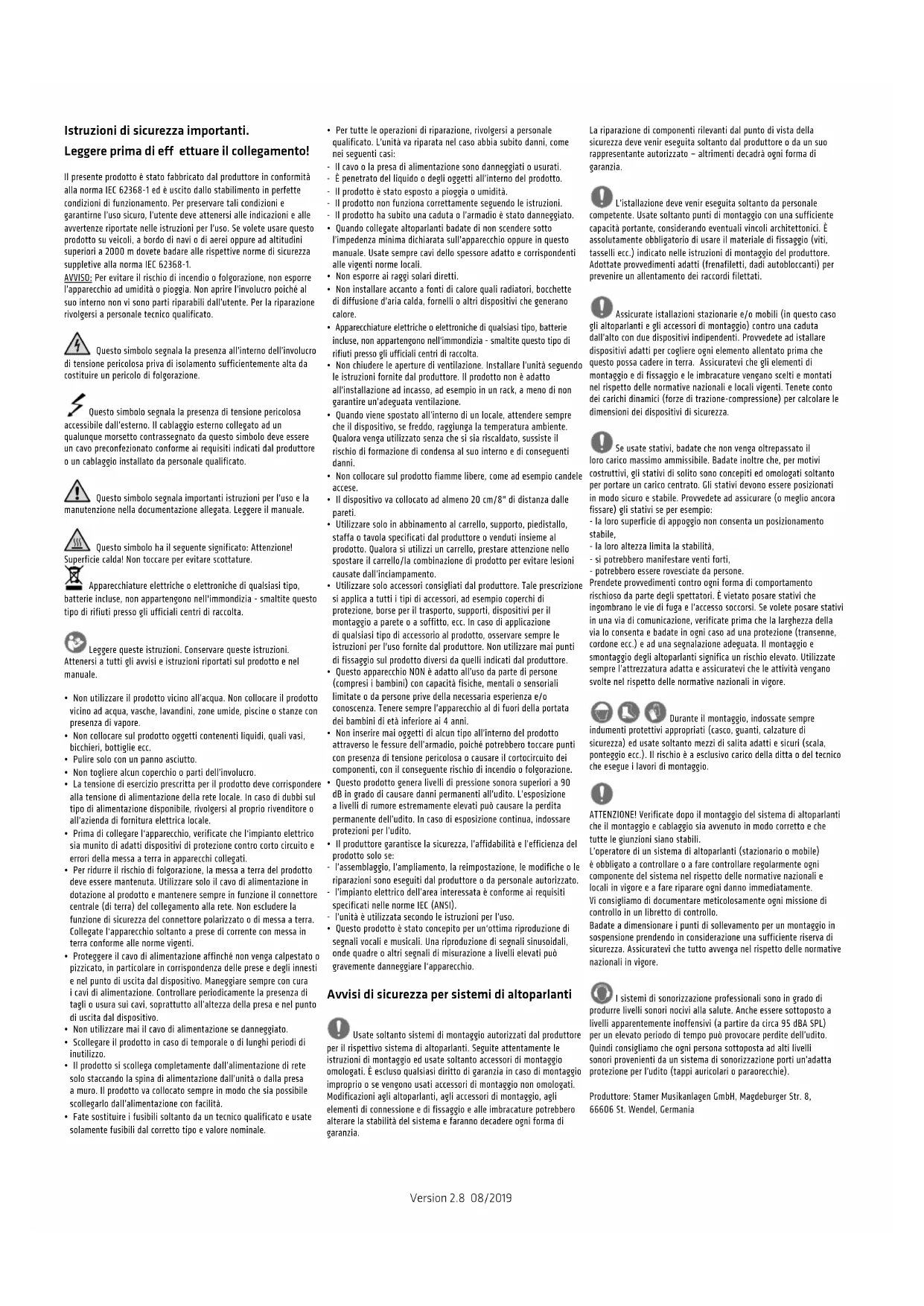 - Questo prodotto è stato concepito per un‘ottima riproduzione di segnali vocali e musicali. Una riproduzione di segnali sinusoidali, onde quadre o altri segnali di misurazione a livelli elevati può gravemente danneggiare l‘apparecchio. Avvisi di sicurezza per sistemi di altoparlanti Usate soltanto sistemi di montaggio autorizzati dal produttore per il rispettivo sistema di altoparlanti. Seguite attentamente le istruzioni di montaggio ed usate soltanto accessori di montaggio omologati. È escluso qualsiasi diritto di garanzia in caso di montaggio improprio o se vengono usati accessori di montaggio non omologati. Modificazioni agli altoparlanti, agli accessori di montaggio, agli elementi di connessione e di fissaggio e alle imbracature potrebbero alterare la stabilità del sistema e faranno decadere ogni forma di garanzia. La riparazione di componenti rilevanti dal punto di vista della sicurezza deve venir eseguita soltanto dal produttore o da un suo rappresentante autorizzato – altrimenti decadrà ogni forma di garanzia. L’istallazione deve venir eseguita soltanto da personale competente. Usate soltanto punti di montaggio con una sufficiente capacità portante, considerando eventuali vincoli architettonici. È assolutamente obbligatorio di usare il materiale di fissaggio (viti, tasselli ecc.) indicato nelle istruzioni di montaggio del produttore. Adottate provvedimenti adatti (frenafiletti, dadi autobloccanti) per prevenire un allentamento dei raccordi filettati. Assicurate istallazioni stazionarie e/o mobili (in questo caso gli altoparlanti e gli accessori di montaggio) contro una caduta dall’alto con due dispositivi indipendenti. Provvedete ad istallare dispositivi adatti per cogliere ogni elemento allentato prima che questo possa cadere in terra. Assicuratevi che gli elementi di montaggio e di fissaggio e le imbracature vengano scelti e montati nel rispetto delle normative nazionali e locali vigenti. Tenete conto dei carichi dinamici (forze di trazione-compressione) per calcolare le dimensioni dei dispositivi di sicurezza. Se usate stativi, badate che non venga oltrepassato il loro carico massimo ammissibile. Badate inoltre che, per motivi costruttivi, gli stativi di solito sono concepiti ed omologati soltanto per portare un carico centrato. Gli stativi devono essere posizionati in modo sicuro e stabile. Provvedete ad assicurare (o meglio ancora fissare) gli stativi se per esempio: - la loro superficie di appoggio non consenta un posizionamento stabile, - la loro altezza limita la stabilità, - si potrebbero manifestare venti forti, - potrebbero essere rovesciate da persone. Prendete provvedimenti contro ogni forma di comportamento rischioso da parte degli spettatori. È vietato posare stativi che ingombrano le vie di fuga e l’accesso soccorsi. Se volete posare stativi in una via di comunicazione, verificate prima che la larghezza della via lo consenta e badate in ogni caso ad una protezione (transenne, cordone ecc.) e ad una segnalazione adeguata. Il montaggio e smontaggio degli altoparlanti significa un rischio elevato. Utilizzate sempre l’attrezzatura adatta e assicuratevi che le attività vengano svolte nel rispetto delle normative nazionali in vigore. Durante il montaggio, indossate sempre indumenti protettivi appropriati (casco, guanti, calzature di sicurezza) ed usate soltanto mezzi di salita adatti e sicuri (scala, ponteggio ecc.). Il rischio è a esclusivo carico della ditta o del tecnico che esegue i lavori di montaggio. ATTENZIONE! Verificate dopo il montaggio del sistema di altoparlanti che il montaggio e cablaggio sia avvenuto in modo corretto e che tutte le giunzioni siano stabili. L’operatore di un sistema di altoparlanti (stazionario o mobile) è obbligato a controllare o a fare controllare regolarmente ogni componente del sistema nel rispetto delle normative nazionali e locali in vigore e a fare riparare ogni danno immediatamente. Vi consigliamo di documentare meticolosamente ogni missione di controllo in un libretto di controllo. Badate a dimensionare i punti di sollevamento per un montaggio in sospensione prendendo in considerazione una sufficiente riserva di sicurezza. Assicuratevi che tutto avvenga nel rispetto delle normative nazionali in vigore. I sistemi di sonorizzazione professionali sono in grado di produrre livelli sonori nocivi alla salute. Anche essere sottoposto a livelli apparentemente inoffensivi (a partire da circa 95 dBA SPL) per un elevato periodo di tempo può provocare perdite dell’udito. Quindi consigliamo che ogni persona sottoposta ad alti livelli sonori provenienti da un sistema di sonorizzazione porti un’adatta protezione per l’udito (tappi auricolari o paraorecchie). Produttore: Stamer Musikanlagen GmbH, Magdeburger Str. 8, 66606 St. Wendel, GermaniaPREMIUM PR:O D2 1.0