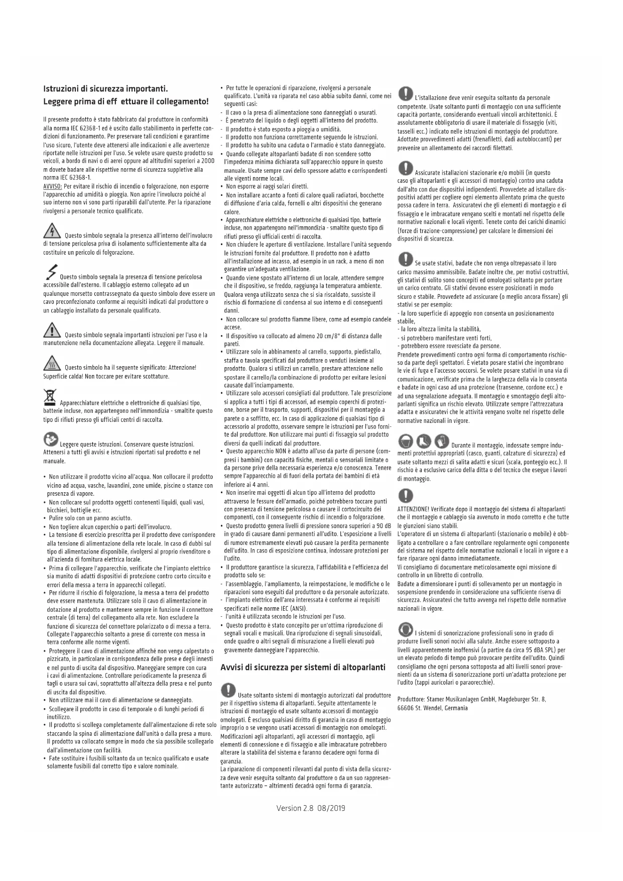 - Questo prodotto è stato concepito per un‘ottima riproduzione di segnali vocali e musicali. Una riproduzione di segnali sinusoidali, onde quadre o altri segnali di misurazione a livelli elevati può gravemente danneggiare l‘apparecchio. Avvisi di sicurezza per sistemi di altoparlanti Usate soltanto sistemi di montaggio autorizzati dal produttore per il rispettivo sistema di altoparlanti. Seguite attentamente le istruzioni di montaggio ed usate soltanto accessori di montaggio omologati. È escluso qualsiasi diritto di garanzia in caso di montaggio improprio o se vengono usati accessori di montaggio non omologati. Modificazioni agli altoparlanti, agli accessori di montaggio, agli elementi di connessione e di fissaggio e alle imbracature potrebbero alterare la stabilità del sistema e faranno decadere ogni forma di garanzia. La riparazione di componenti rilevanti dal punto di vista della sicurez- za deve venir eseguita soltanto dal produttore o da un suo rappresen- tante autorizzato – altrimenti decadrà ogni forma di garanzia. L’istallazione deve venir eseguita soltanto da personale competente. Usate soltanto punti di montaggio con una sufficiente capacità portante, considerando eventuali vincoli architettonici. È assolutamente obbligatorio di usare il materiale di fissaggio (viti, tasselli ecc.) indicato nelle istruzioni di montaggio del produttore. Adottate provvedimenti adatti (frenafiletti, dadi autobloccanti) per prevenire un allentamento dei raccordi filettati. Assicurate istallazioni stazionarie e/o mobili (in questo caso gli altoparlanti e gli accessori di montaggio) contro una caduta dall’alto con due dispositivi indipendenti. Provvedete ad istallare dis- positivi adatti per cogliere ogni elemento allentato prima che questo possa cadere in terra. Assicuratevi che gli elementi di montaggio e di fissaggio e le imbracature vengano scelti e montati nel rispetto delle normative nazionali e locali vigenti. Tenete conto dei carichi dinamici (forze di trazione-compressione) per calcolare le dimensioni dei dispositivi di sicurezza. Se usate stativi, badate che non venga oltrepassato il loro carico massimo ammissibile. Badate inoltre che, per motivi costruttivi, gli stativi di solito sono concepiti ed omologati soltanto per portare un carico centrato. Gli stativi devono essere posizionati in modo sicuro e stabile. Provvedete ad assicurare (o meglio ancora fissare) gli stativi se per esempio: - la loro superficie di appoggio non consenta un posizionamento stabile, - la loro altezza limita la stabilità, - si potrebbero manifestare venti forti, - potrebbero essere rovesciate da persone. Prendete provvedimenti contro ogni forma di comportamento rischio- so da parte degli spettatori. È vietato posare stativi che ingombrano le vie di fuga e l’accesso soccorsi. Se volete posare stativi in una via di comunicazione, verificate prima che la larghezza della via lo consenta e badate in ogni caso ad una protezione (transenne, cordone ecc.) e ad una segnalazione adeguata. Il montaggio e smontaggio degli alto- parlanti significa un rischio elevato. Utilizzate sempre l’attrezzatura adatta e assicuratevi che le attività vengano svolte nel rispetto delle normative nazionali in vigore. Durante il montaggio, indossate sempre indu- menti protettivi appropriati (casco, guanti, calzature di sicurezza) ed usate soltanto mezzi di salita adatti e sicuri (scala, ponteggio ecc.). Il rischio è a esclusivo carico della ditta o del tecnico che esegue i lavori di montaggio. ATTENZIONE! Verificate dopo il montaggio del sistema di altoparlanti che il montaggio e cablaggio sia avvenuto in modo corretto e che tutte le giunzioni siano stabili. L’operatore di un sistema di altoparlanti (stazionario o mobile) è obb- ligato a controllare o a fare controllare regolarmente ogni componente del sistema nel rispetto delle normative nazionali e locali in vigore e a fare riparare ogni danno immediatamente. Vi consigliamo di documentare meticolosamente ogni missione di controllo in un libretto di controllo. Badate a dimensionare i punti di sollevamento per un montaggio in sospensione prendendo in considerazione una sufficiente riserva di sicurezza. Assicuratevi che tutto avvenga nel rispetto delle normative nazionali in vigore. I sistemi di sonorizzazione professionali sono in grado di produrre livelli sonori nocivi alla salute. Anche essere sottoposto a livelli apparentemente inoffensivi (a partire da circa 95 dBA SPL) per un elevato periodo di tempo può provocare perdite dell’udito. Quindi consigliamo che ogni persona sottoposta ad alti livelli sonori prove- nienti da un sistema di sonorizzazione porti un’adatta protezione per l’udito (tappi auricolari o paraorecchie). Produttore: Stamer Musikanlagen GmbH, Magdeburger Str. 8, 66606 St. Wendel, GermaniaMOVE 8 1.1