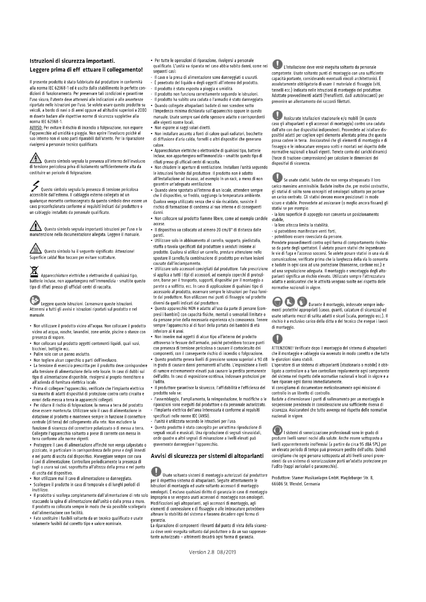 - English • Deutsch • Français • Italiano • EspañolVersion 2.8 08/2019 Istruzioni di sicurezza importanti. Leggere prima di e ettuare il collegamento! Il presente prodotto è stato fabbricato dal produttore in conformità alla norma IEC 62368-1 ed è uscito dallo stabilimento in perfette con- dizioni di funzionamento. Per preservare tali condizioni e garantirne l’uso sicuro, l’utente deve attenersi alle indicazioni e alle avvertenze riportate nelle istruzioni per l’uso. Se volete usare questo prodotto su veicoli, a bordo di navi o di aerei oppure ad altitudini superiori a 2000 m dovete badare alle rispettive norme di sicurezza suppletive alla norma IEC 62368-1. AVVISO: Per evitare il rischio di incendio o folgorazione, non esporre l’apparecchio ad umidità o pioggia. Non aprire l’involucro poiché al suo interno non vi sono parti riparabili dall’utente. Per la riparazione rivolgersi a personale tecnico qualificato. Questo simbolo segnala la presenza all’interno dell’involucro di tensione pericolosa priva di isolamento sufficientemente alta da costituire un pericolo di folgorazione. Questo simbolo segnala la presenza di tensione pericolosa accessibile dall’esterno. Il cablaggio esterno collegato ad un qualunque morsetto contrassegnato da questo simbolo deve essere un cavo preconfezionato conforme ai requisiti indicati dal produttore o un cablaggio installato da personale qualificato. Questo simbolo segnala importanti istruzioni per l’uso e la manutenzione nella documentazione allegata. Leggere il manuale. Questo simbolo ha il seguente significato: Attenzione! Superficie calda! Non toccare per evitare scottature. Apparecchiature elettriche o elettroniche di qualsiasi tipo, batterie incluse, non appartengono nell'immondizia - smaltite questo tipo di rifiuti presso gli ufficiali centri di raccolta. Leggere queste istruzioni. Conservare queste istruzioni. Attenersi a tutti gli avvisi e istruzioni riportati sul prodotto e nel manuale.