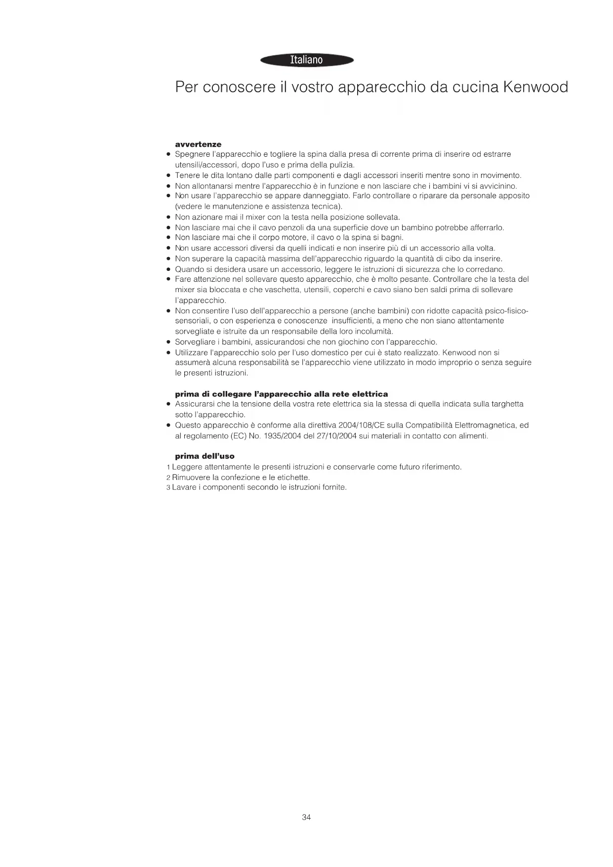 Questo apparecchio è conforme alla direttiva 2004/108/CE sulla Compatibilità Elettromagnetica, ed al regolamento (EC) No. 1935/2004 del 27/10/2004 sui materiali in contatto con alimenti. prima dell’uso 1 Leggere attentamente le presenti istruzioni e conservarle come futuro riferimento. 2 Rimuovere la confezione e le etichette. 3 Lavare i componenti secondo le istruzioni fornite. Per conoscere il vostro apparecchio da cucina Kenwood