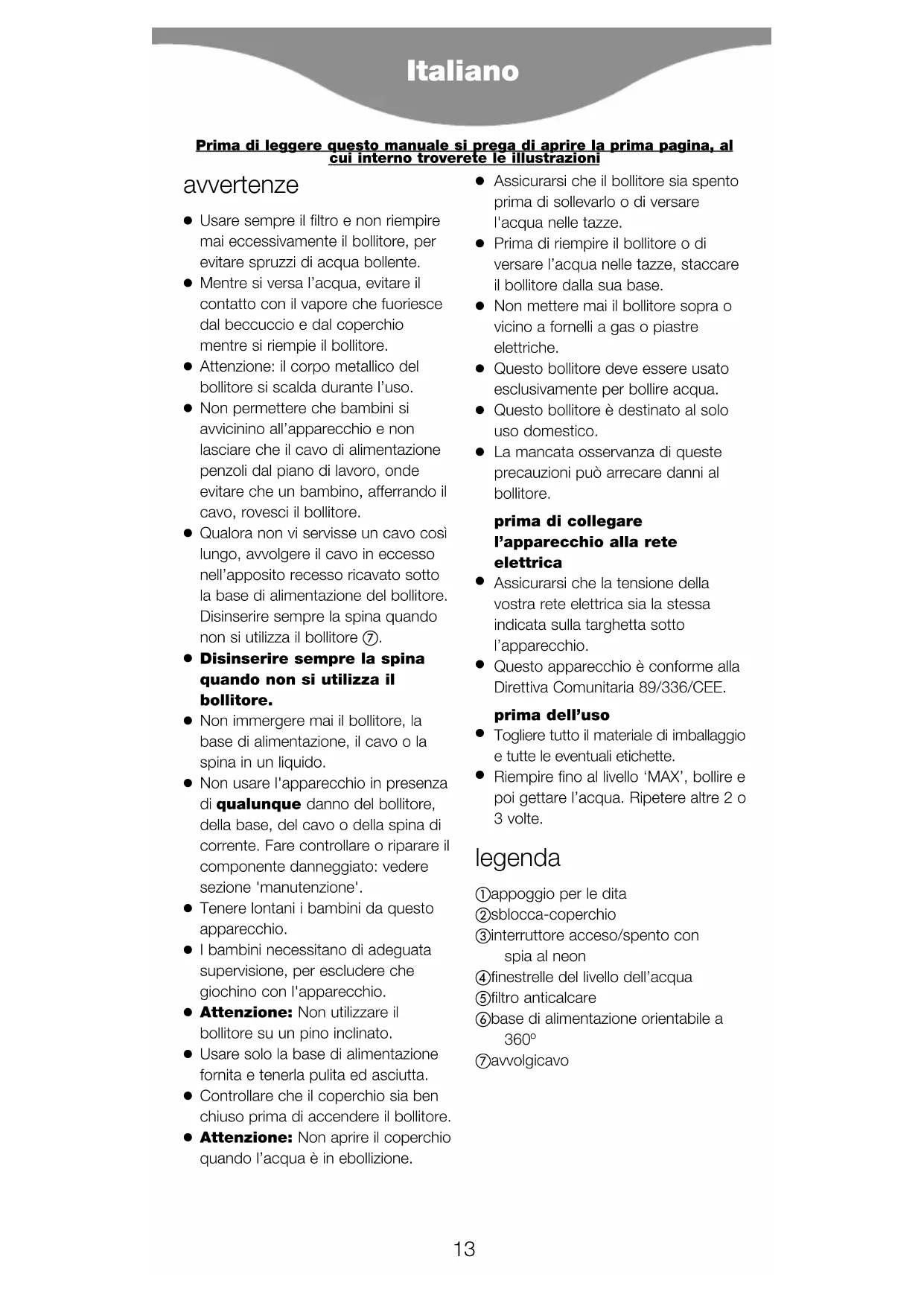 Riempire fino al livello ‘MAX’, bollire e poi gettare l’acqua. Ripetere altre 2 o 3 volte. legenda appoggio per le dita sblocca-coperchio interruttore acceso/spento con spia al neon finestrelle del livello dell’acqua filtro anticalcare base di alimentazione orientabile a 360º avvolgicavo