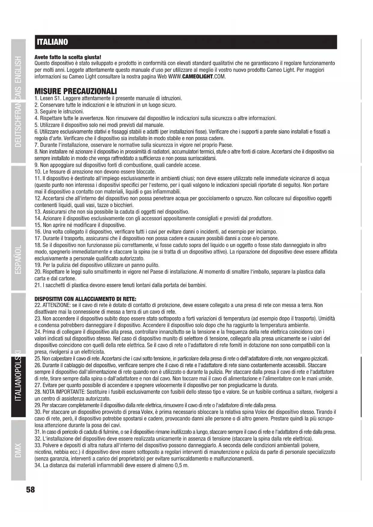 4. In alcuni casi, in persone sensibili gli effetti stroboscopici possono causare attacchi epilettici! Le persone affette da epilessia devono perciò assolutamente evitare luoghi in cui vengono impiegati effetti stroboscopici. INTRODUZIONE Cameo MovoBeam 100 è una testa mobile ultrarapida a movimento orizzontale (pan) e verticale (tilt) continuo, risoluzione 16bit e frequenza di ripetizione 3.000Hz. Un LED COB a quattro colori da 60W genera intensi colori RGBW, fresche tonalità pastello e vivaci gradazioni di bianco con angolo del fascio di 5,5° e angolo di campo di 8,5° e una potenza di illuminazione di 157.700lux. FUNZIONI DI COMANDO: Controllo DMX a 4canali, 15canali, 35canali Funzionamento master/slave Funzioni standalone CARATTERISTICHE 1 x LED RGBW COB alta potenza da 60 W, mix di colori RGBW, 6° angolo di dispersione, 2motori ultrarapidi per pan e tilt, movimento pan e tilt continuo, adatto per TV e video con frequenza di ripetizione di 3.000Hz, controllo DMX512, funzionamento master/slave, programmi standalone, tensione di esercizio 100 - 240V AC, 50/60Hz, potenza assorbita 130W, staffa di montaggio Omega inclusa.60 DEUTSCHFRANCAIS ESPAÑOL ENGLISH ITALIANO POLSKI DMX