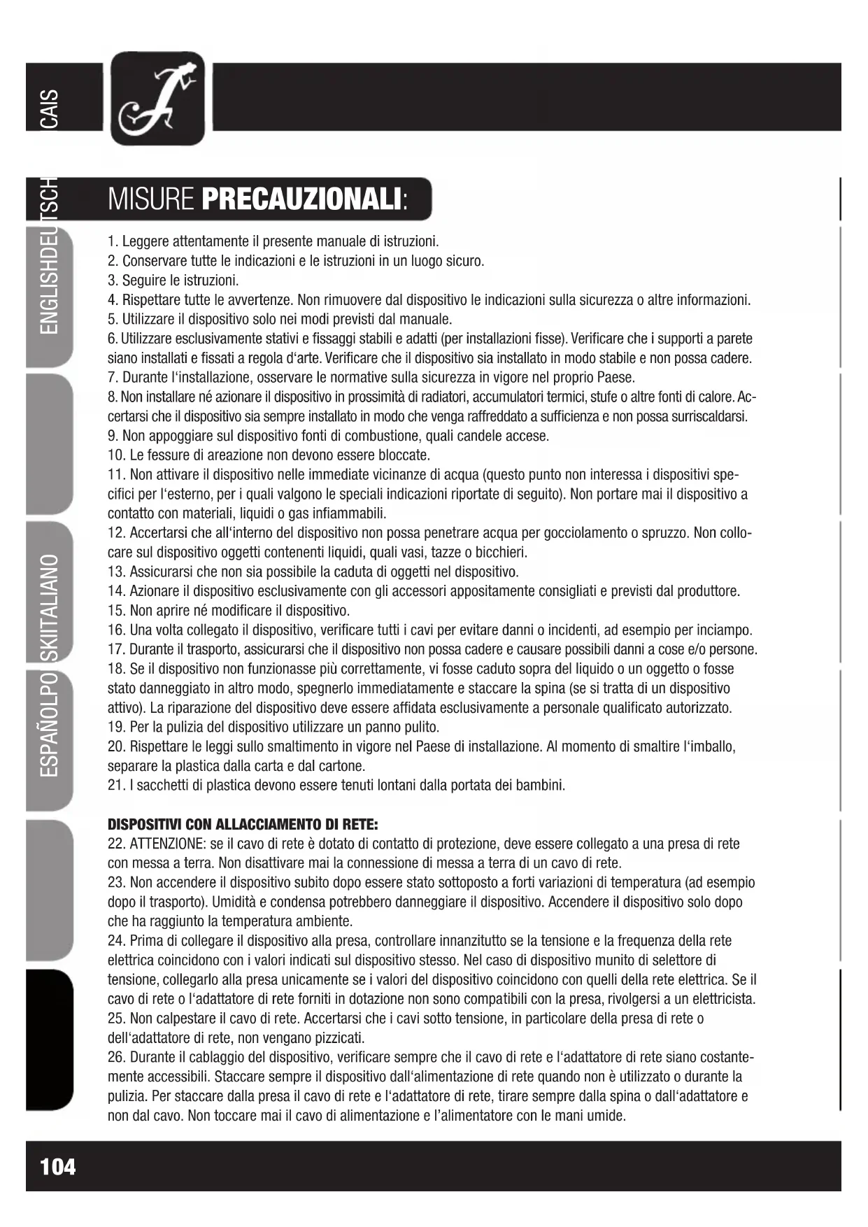 mente accessibili. Staccare sempre il dispositivo dall‘alimentazione di rete quando non è utilizzato o durante la pulizia. Per staccare dalla presa il cavo di rete e l‘adattatore di rete, tirare sempre dalla spina o dall‘adattatore e non dal cavo. Non toccare mai il cavo di alimentazione e l’alimentatore con le mani umide.ITALIANO POLSKI ESPAÑOL FRANCAIS FRANCAIS FRANCAIS FRANCAIS FRANCAIS DEUTSCH ENGLISH