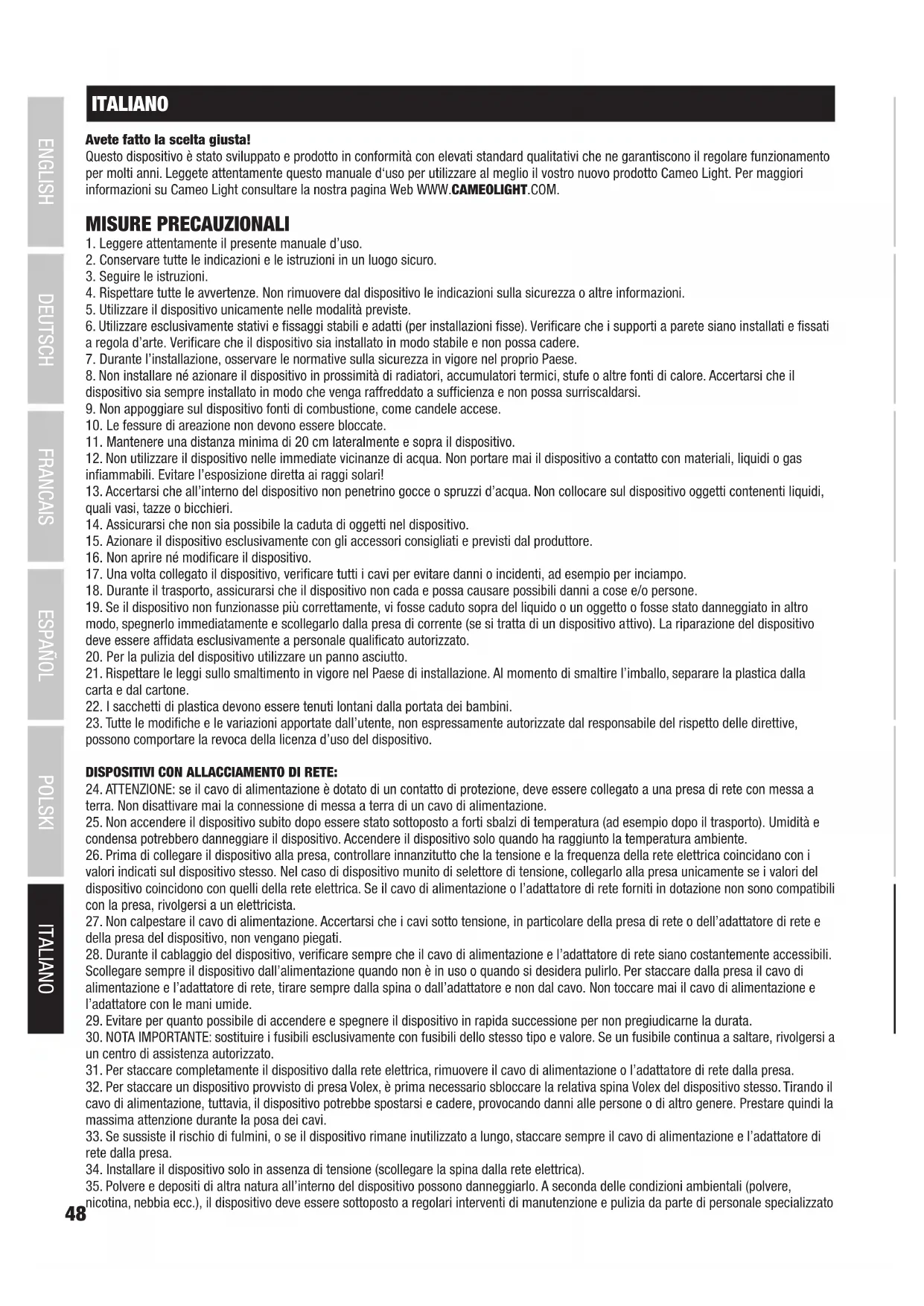 35. Polvere e depositi di altra natura all’interno del dispositivo possono danneggiarlo. A seconda delle condizioni ambientali (polvere, nicotina, nebbia ecc.), il dispositivo deve essere sottoposto a regolari interventi di manutenzione e pulizia da parte di personale specializzato49 DEUTSCHFRANCAIS ESPAÑOL ENGLISH ITALIANO POLSKI ITALIANO POLSKI ESPAÑOL FRANCAIS DEUTSCH ENGLISH (senza garanzia, interventi a carico del proprietario) per evitare surriscaldamento e malfunzionamenti.
