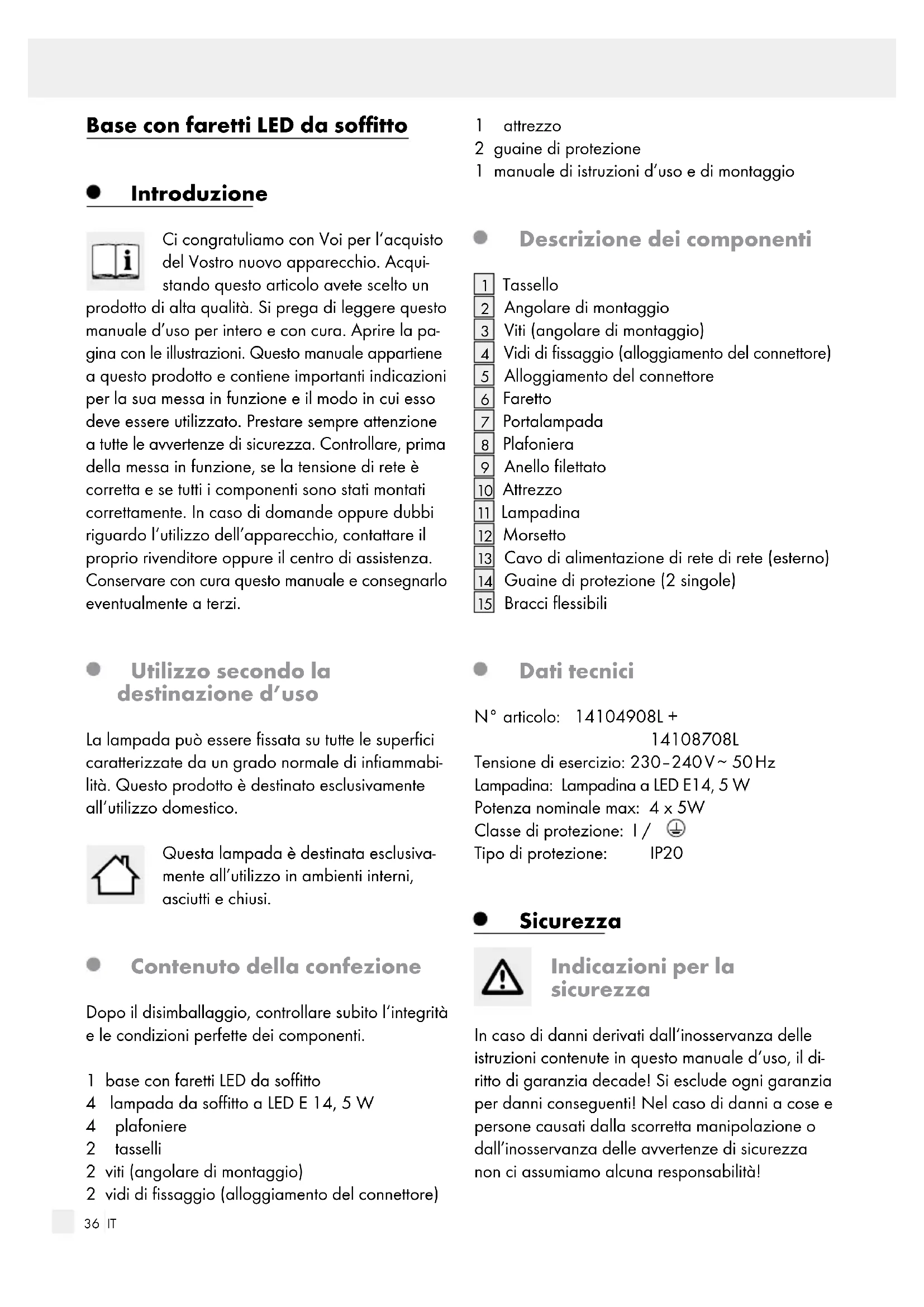 Bracci flessibili Dati tecnici N° articolo: 14104908L + 14108708L Tensione di esercizio: 230–240 V ∼ 50 Hz Lampadina: Lampadina a LED E14, 5 W Potenza nominale max: 4 x 5W Classe di protezione: I / Tipo di protezione: IP20 Sicurezza Indicazioni per la sicurezza In caso di danni derivati dall‘inosservanza delle istruzioni contenute in questo manuale d‘uso, il di- ritto di garanzia decade! Si esclude ogni garanzia per danni conseguenti! Nel caso di danni a cose e persone causati dalla scorretta manipolazione o dall’inosservanza delle avvertenze di sicurezza non ci assumiamo alcuna responsabilità!37 IT Sicurezza Introduzione / Sicurezza Evitate il pericolo di vita causato da scosse elettriche Far eseguire l‘installazione elettrica soltanto da un elettricista esperto o da una persona competente in materia. Prima di ogni collegamento alla rete elettrica controllare la lampada e il cavo di collegamento a rete per verificare l‘eventuale presenza di danni. Non utilizzare mai la lampada, qualora si constatassero dei danni. ATTENZIONE! In presenza di cavi di alimen- tazione danneggiati sussiste il pericolo di morte a causa di scossa elettrica. In caso di danni, necessità di riparazioni o altri problemi nell’uti- lizzo della lampada, rivolgersi al Centro di As- sistenza o a un elettricista. Prima di eseguire il montaggio, rimuovere il fusibile oppure disattivare l’interruttore di sicu- rezza nella scatola dei fusibili (posizione 0). Prima del montaggio, assicurarsi che la tensione di rete disponibile coincida con la tensione di funzionamento necessaria della lampada (230–240 V∼). Evitare il contatto della lampada con acqua o altri liquidi. Non aprire mai nessuno dei componenti elet- trici e non inserirvi alcun oggetto. Interventi di questo tipo possono mettere a rischio a vita per scossa elettrica. Non fissare la lampada su un suolo umido o conduttore di elettricità! Evitate situazioni pericolose che possano causare incendi o lesioni PERICOLO DI LESIONE! Controllare subito la presenza di danni su ogni lampadina e sul vetro della lampada, dopo aver tolto dall‘im- ballaggio. Non montare la lampada con lampadine e/o vetro della lampada danneggiati. In tal caso mettersi in contatto con un centro di assistenza per la sostituzione. PERICOLO DI USTIONI! Per evitare ustioni, assicurarsi prima di toccare la lampada che questa sia spenta e si sia raffreddata. Le lampadine gene- rano un surriscaldamento della zona superiore della lampada. Lasciare raffreddare completamente la lam- pada. Sostituire immediatamente le lampadine difet- tose con lampadine nuove. Prima di sostituire la lampadina, rimuovere il fusibile o disattivare l‘interruttore di sicurezza della lampada. 0,5 m PERICOLO DI INCENDIO! Mon- tare la lampada a una distanza di almeno 0,5 m dai materiali illuminati. Un eccessivo riscaldamento della lampada può provocare un incendio. Non lasciare la lampada o l‘imballaggio incu- stoditi. I sacchetti e le pellicole di plastica, i pezzi in plastica ecc. possono essere un giocattolo pericoloso per i bambini. ATTENZIONE! Non fissare i LED da una distanza ravvicinata durante l‘utilizzo. Non esaminare i LED con strumenti ottici (ad es. lente). La lampadina integrata non è adatta per reostati o interruttori elettronici. Come comportarsi correttamente Utilizzare solamente lampadine LED da 230–240 V∼ con uno zoccolo tipo E14 e una potenza massima di 5 Watt. Montare la lampada in modo tale che sia protetta da umidità, vento e sporcizia. Preparare con cura il montaggio e prendersi tutto il tempo necessario. Disporre a portata di mano tutti i componenti ed eventuali attrezzi o materiali necessari. Lavorare sempre con la massima attenzione! Prestare sempre attenzione a ciò che si fa ed essere prudenti. Non montare la lampada, nel caso in cui non si sia concentrati oppure non ci si senta bene.38 IT ... / Manutenzione e pulizia / Smaltimento / Garanzia e assistenza Preparazione / Prima dell‘installazione / Messa in funzione Preparazione Attrezzi e materiali necessari Gli attrezzi e materiali indicati non sono inclusi nella confezione. Si tratta in questo caso di dati e valori non vincolanti, forniti a titolo orientativo. Le caratteristiche dei materiali dipendono dalle condizioni individuali in loco. - Matita / strumento di marcatura - Indicatore di tensione - Cacciavite - Trapano - Trapano (ø ca. 0,6 cm) - Tronchese laterale - Conduttore Prima dell‘installazione Importante: il collegamento elettrico deve essere eseguito da un elettricista qualificato o da una persona competente in materia. Quest‘ultimo deve conoscere le caratteristiche della lampada e le modalità di collegamento. Leggere le istruzioni e osservare le illustrazioni attentamente, nonché familiarizzare con la lampada, prima di installarla. Prima dell‘installazione, assicurarsi che non ci sia tensione nel cavo di alimentazione di rete al quale deve essere collegata la lampada. Rimuovere perciò il fusibile oppure disattivare l‘interruttore di sicurezza nella scatola dei fusibili (posizione 0). Verificare l‘assenza di tensione con un rilevatore di tensione. Messa in funzione Montaggio della lampada Prima di eseguire il montaggio, rimuovere il fusibile oppure disattivare l’interruttore di sicu- rezza nella scatola dei fusibili (posizione 0). Rimuovere le viti