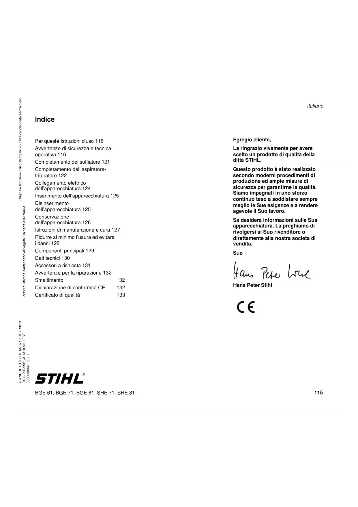 Indice Egregio cliente, La ringrazio vivamente per avere scelto un prodotto di qualità della ditta STIHL. Questo prodotto è stato realizzato secondo moderni procedimenti di produzione ed ampie misure di sicurezza per garantirne la qualità. Siamo impegnati in uno sforzo continuo teso a soddisfare sempre meglio le Sue esigenze e a rendere agevole il Suo lavoro. Se desidera informazioni sulla Sua apparecchiatura, La preghiamo di rivolgersi al Suo rivenditore o direttamente alla nostra società di vendita. Suo Hans Peter Stihl Per queste Istruzioni d’uso 116 Avvertenze di sicurezza e tecnica operativa 116 Completamento del soffiatore 121 Completamento dell’aspiratore- trituratore 122 Collegamento elettrico dell’apparecchiatura 124 Inserimento dell’apparecchiatura 125 Disinserimento dell’apparecchiatura 125 Conservazione dell’apparecchiatura 126 Istruzioni di manutenzione e cura 127 Ridurre al minimo l’usura ed evitare i danni 128 Componenti principali 129 Dati tecnici 130 Accessori a richiesta 131 Avvertenze per la riparazione 132 Smaltimento 132 Dichiarazione di conformità CE 132 Certificato di qualità 133BGE 61, BGE 71, BGE 81, SHE 71, SHE 81 italiano