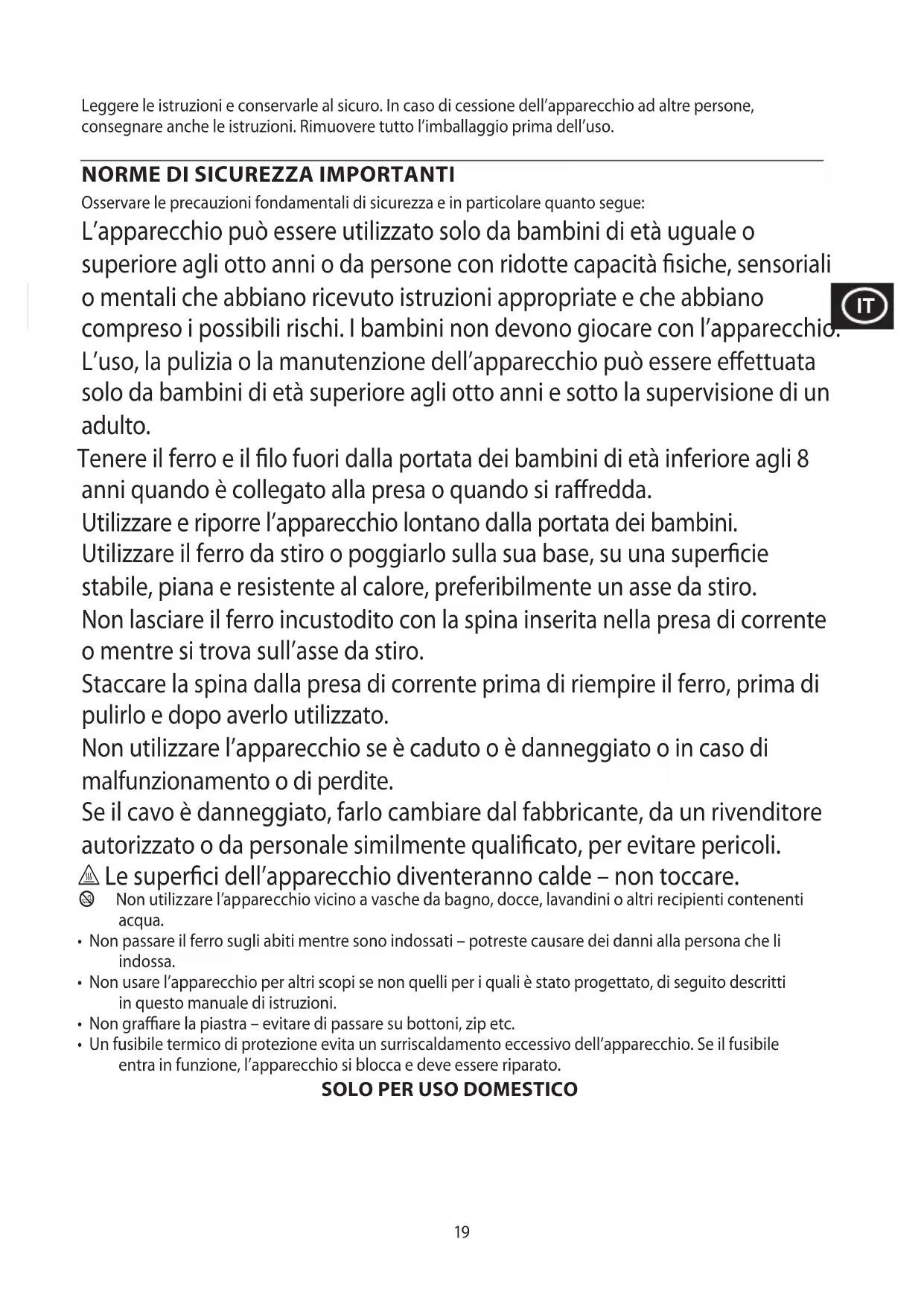 Osservare le precauzioni fondamentali di sicurezza e in particolare quanto segue: L’apparecchio può essere utilizzato solo da bambini di età uguale o superiore agli otto anni o da persone con ridotte capacità siche, sensoriali o mentali che abbiano ricevuto istruzioni appropriate e che abbiano compreso i possibili rischi. I bambini non devono giocare con l’apparecchio. L’uso, la pulizia o la manutenzione dell’apparecchio può essere eettuata solo da bambini di età superiore agli otto anni e sotto la supervisione di un adulto. Tenere il ferro e il lo fuori dalla portata dei bambini di età inferiore agli 8 anni quando è collegato alla presa o quando si raredda. Utilizzare e riporre l’apparecchio lontano dalla portata dei bambini. Utilizzare il ferro da stiro o poggiarlo sulla sua base, su una supercie stabile, piana e resistente al calore, preferibilmente un asse da stiro. Non lasciare il ferro incustodito con la spina inserita nella presa di corrente o mentre si trova sull’asse da stiro. Staccare la spina dalla presa di corrente prima di riempire il ferro, prima di pulirlo e dopo averlo utilizzato. Non utilizzare l’apparecchio se è caduto o è danneggiato o in caso di malfunzionamento o di perdite. Se il cavo è danneggiato, farlo cambiare dal fabbricante, da un rivenditore autorizzato o da personale similmente qualicato, per evitare pericoli. h Le superci dell’apparecchio diventeranno calde – non toccare. b Non utilizzare l’apparecchio vicino a vasche da bagno, docce, lavandini o altri recipienti contenenti acqua.
