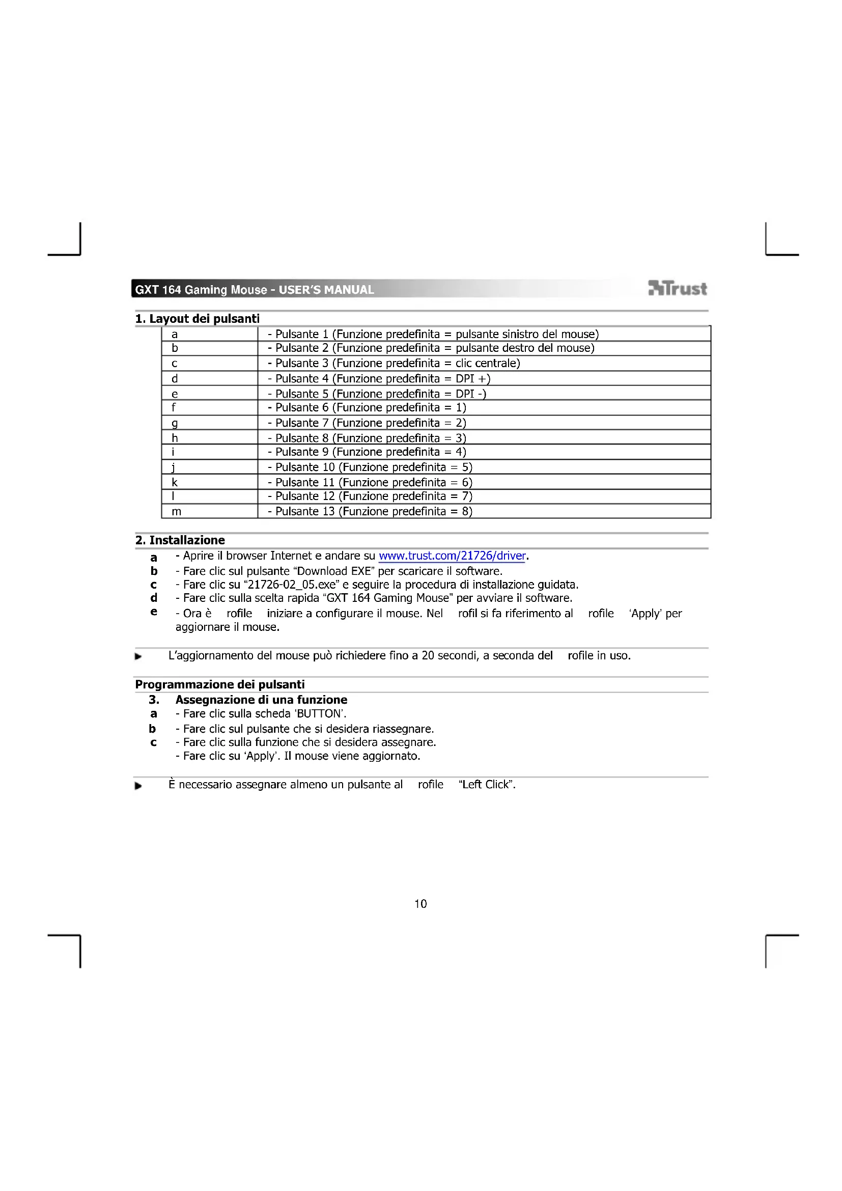- Aprire il browser Internet e andare su www.trust.com/21726/driver. - Fare clic sul pulsante “Download EXE” per scaricare il software. - Fare clic su “21726-02_05.exe” e seguire la procedura di installazione guidata. - Fare clic sulla scelta rapida “GXT 164 Gaming Mouse” per avviare il software. - Ora è rofile iniziare a configurare il mouse. Nel rofil si fa riferimento al rofile ‘Apply’ per aggiornare il mouse. L’aggiornamento del mouse può richiedere fino a 20 secondi, a seconda del rofile in uso. Programmazione dei pulsanti