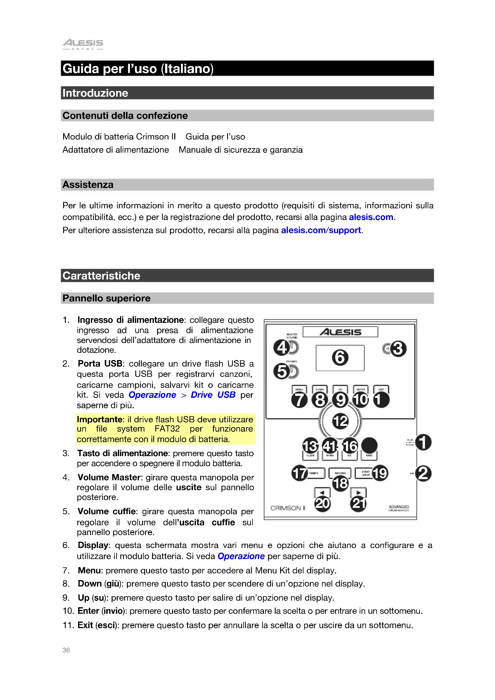 Assistenza Per le ultime informazioni in merito a questo prodotto (requisiti di sistema, informazioni sulla compatibilità, ecc.) e per la registrazione del prodotto, recarsi alla pagina alesis.com. Per ulteriore assistenza sul prodotto, recarsi alla pagina alesis.com/support.