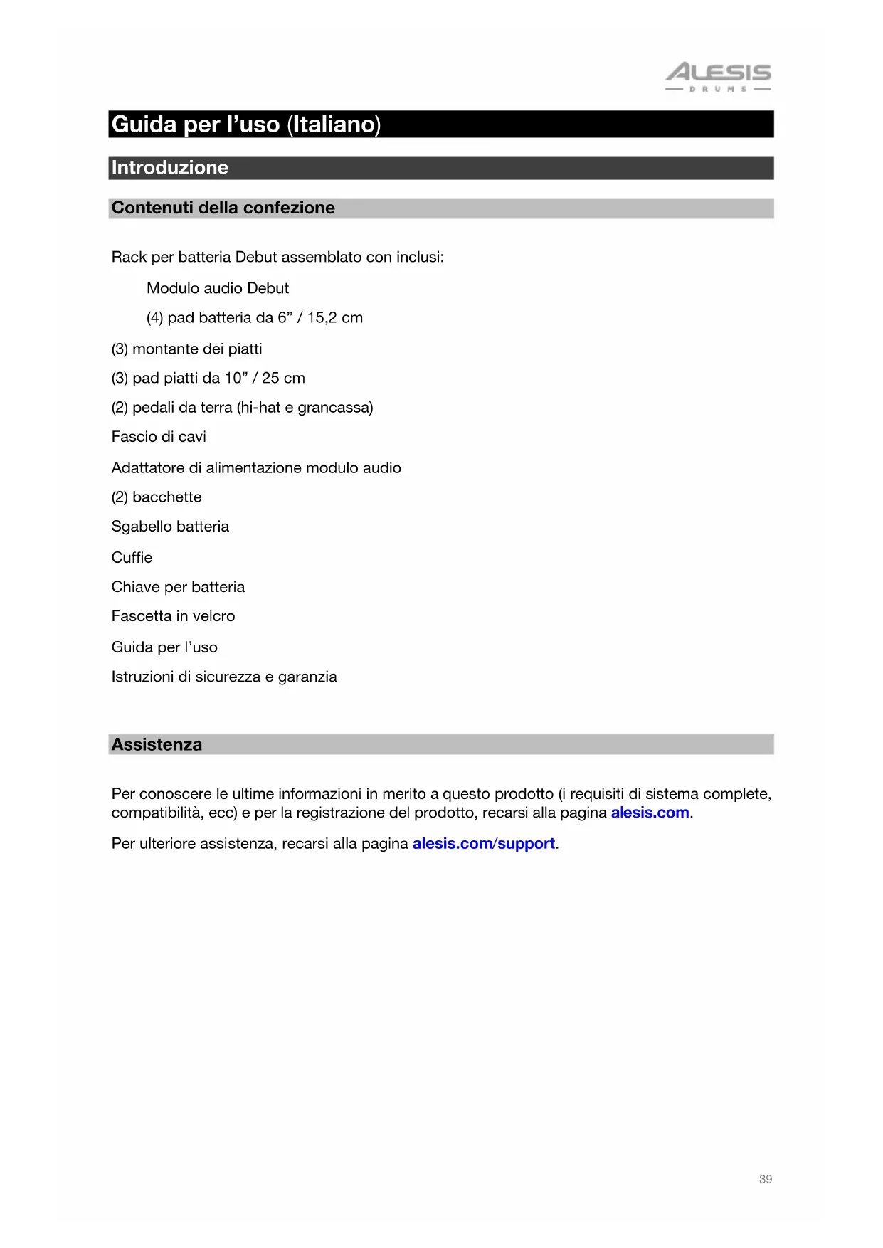 Scarica le istruzioni per il tuo Tamburo per computer in formato PDF gratuitamente! Trova il tuo manuale Debut Kit - ALESIS e riprendi in mano il tuo dispositivo elettronico. In questa pagina sono pubblicati tutti i documenti necessari per l'utilizzo del tuo dispositivo. Debut Kit del marchio ALESIS.
