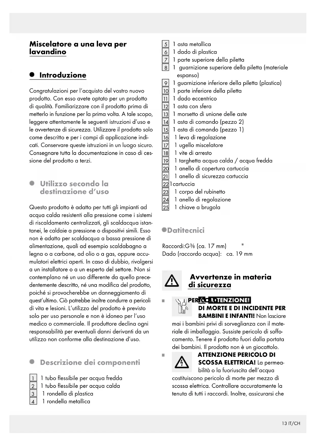 1 chiave a brugola Dati tecnici Raccordi: G⅜ (ca. 17 mm) Dado (raccordo acqua): ca. 19 mm Avvertenze in materia di sicurezza PERICOLO