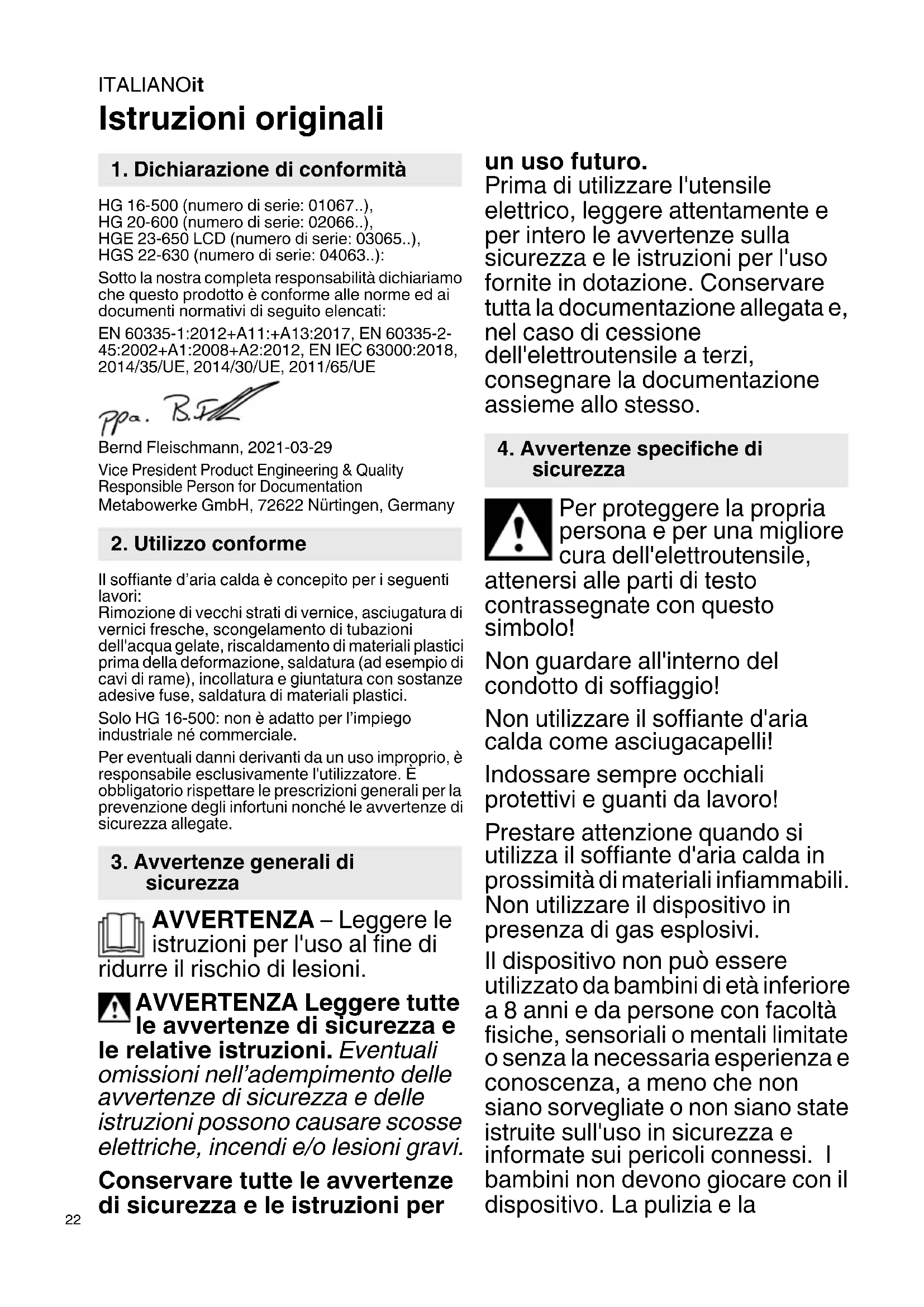 Istruzioni originali HG 16-500 (numero di serie: 01067..), HG 20-600 (numero di serie: 02066..), HGE 23-650 LCD (numero di serie: 03065..), HGS 22-630 (numero di serie: 04063..): Sotto la nostra completa responsabilità dichiariamo che questo prodotto è conforme alle norme ed ai documenti normativi di seguito elencati: EN 60335-1:2012+A11:+A13:2017, EN 60335-2- 45:2002+A1:2008+A2:2012, EN IEC 63000:2018, 2014/35/UE, 2014/30/UE, 2011/65/UE Bernd Fleischmann, 2021-03-29 Vice President Product Engineering & Quality Responsible Person for Documentation Metabowerke GmbH, 72622 Nürtingen, Germany Il soffiante d’aria calda è concepito per i seguenti lavori: Rimozione di vecchi strati di vernice, asciugatura di vernici fresche, scongelamento di tubazioni dell'acqua gelate, riscaldamento di materiali plastici prima della deformazione, saldatura (ad esempio di cavi di rame), incollatura e giuntatura con sostanze adesive fuse, saldatura di materiali plastici. Solo HG 16-500: non è adatto per l’impiego industriale né commerciale. Per eventuali danni derivanti da un uso improprio, è responsabile esclusivamente l'utilizzatore. È obbligatorio rispettare le prescrizioni generali per la prevenzione degli infortuni nonché le avvertenze di sicurezza allegate. AVVERTENZA – Leggere le istruzioni per l'uso al fine di ridurre il rischio di lesioni. AVVERTENZA Leggere tutte le avvertenze di sicurezza e le relative istruzioni. Eventuali omissioni nell’adempimento delle avvertenze di sicurezza e delle istruzioni possono causare scosse elettriche, incendi e/o lesioni gravi. Conservare tutte le avvertenze di sicurezza e le istruzioni per un uso futuro. Prima di utilizzare l'utensile elettrico, leggere attentamente e per intero le avvertenze sulla sicurezza e le istruzioni per l'uso fornite in dotazione. Conservare tutta la documentazione allegata e, nel caso di cessione dell'elettroutensile a terzi, consegnare la documentazione assieme allo stesso. Per proteggere la propria persona e per una migliore cura dell'elettroutensile, attenersi alle parti di testo contrassegnate con questo simbolo! Non guardare all'interno del condotto di soffiaggio! Non utilizzare il soffiante d'aria calda come asciugacapelli! Indossare sempre occhiali protettivi e guanti da lavoro! Prestare attenzione quando si utilizza il soffiante d'aria calda in prossimità di materiali infiammabili. Non utilizzare il dispositivo in presenza di gas esplosivi. Il dispositivo non può essere utilizzato da bambini di età inferiore a 8 anni e da persone con facoltà fisiche, sensoriali o mentali limitate o senza la necessaria esperienza e conoscenza, a meno che non siano sorvegliate o non siano state istruite sull'uso in sicurezza e informate sui pericoli connessi. I bambini non devono giocare con il dispositivo. La pulizia e la
