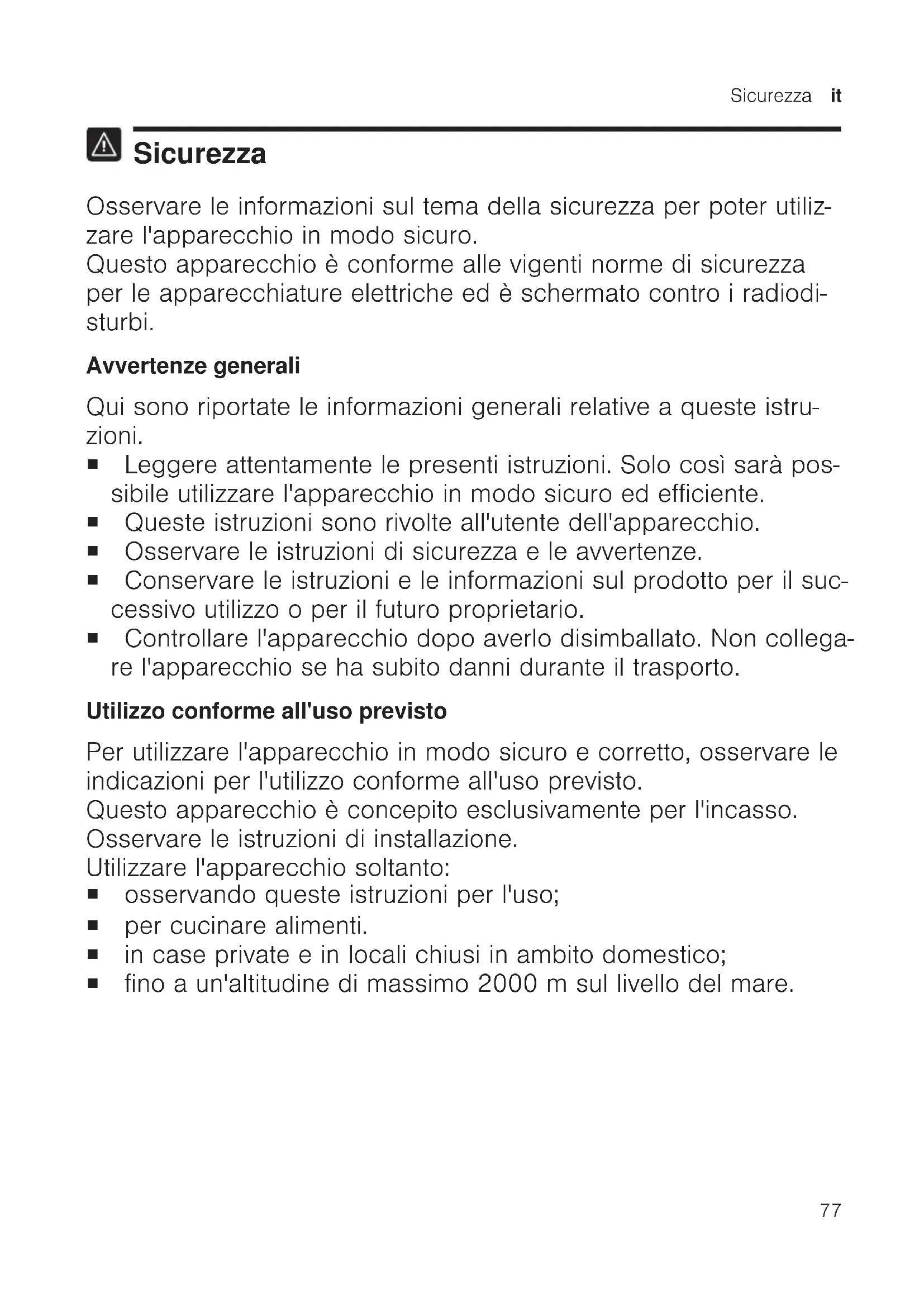 Sicurezza Osservare le informazioni sul tema della sicurezza per poter utiliz- zare l'apparecchio in modo sicuro. Questo apparecchio èconforme alle vigenti norme disicurezza per leapparecchiature elettriche ed èschermato contro iradiodi- sturbi. Avvertenze generali Qui sono riportate le informazioni generali relative a queste istru- zioni. ¡ Leggere attentamente le presenti istruzioni. Solo così sarà pos- sibile utilizzare l'apparecchio in modo sicuro ed efficiente. ¡ Queste istruzioni sono rivolte all'utente dell'apparecchio. ¡ Osservare le istruzioni di sicurezza e le avvertenze. ¡ Conservare le istruzioni e le informazioni sul prodotto per il suc- cessivo utilizzo o per il futuro proprietario. ¡ Controllare l'apparecchio dopo averlo disimballato. Non collega- re l'apparecchio se ha subito danni durante il trasporto. Utilizzo conforme all'uso previsto Per utilizzare l'apparecchio in modo sicuro e corretto, osservare le indicazioni per l'utilizzo conforme all'uso previsto. Questo apparecchio è concepito esclusivamente per l'incasso. Osservare le istruzioni di installazione. Utilizzare l'apparecchio soltanto: ¡ osservando queste istruzioni per l'uso; ¡ per cucinare alimenti. ¡ in case private e in locali chiusi in ambito domestico; ¡ fino a un'altitudine di massimo 2000m sul livello del mare.it Sicurezza