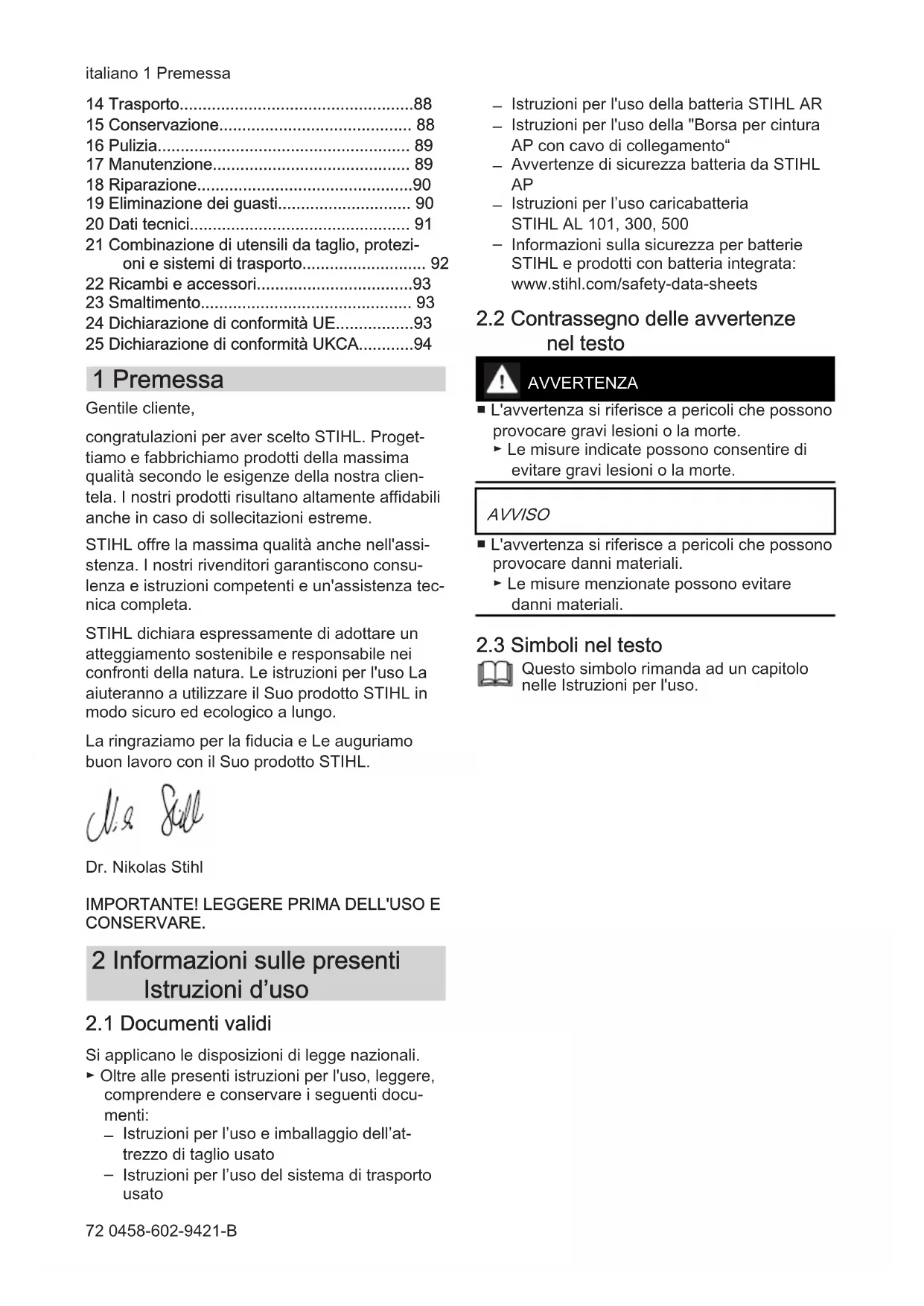 - 25 Dichiarazione di conformità UKCA 1 Premessa Gentile cliente, congratulazioni per aver scelto STIHL. Proget‐ tiamo e fabbrichiamo prodotti della massima qualità secondo le esigenze della nostra clien‐ tela. I nostri prodotti risultano altamente affidabili anche in caso di sollecitazioni estreme. STIHL offre la massima qualità anche nell'assi‐ stenza. I nostri rivenditori garantiscono consu‐ lenza e istruzioni competenti e un'assistenza tec‐ nica completa. STIHL dichiara espressamente di adottare un atteggiamento sostenibile e responsabile nei confronti della natura. Le istruzioni per l'uso La aiuteranno a utilizzare il Suo prodotto STIHL in modo sicuro ed ecologico a lungo. La ringraziamo per la fiducia e Le auguriamo buon lavoro con il Suo prodotto STIHL. Dr. Nikolas Stihl p. 94