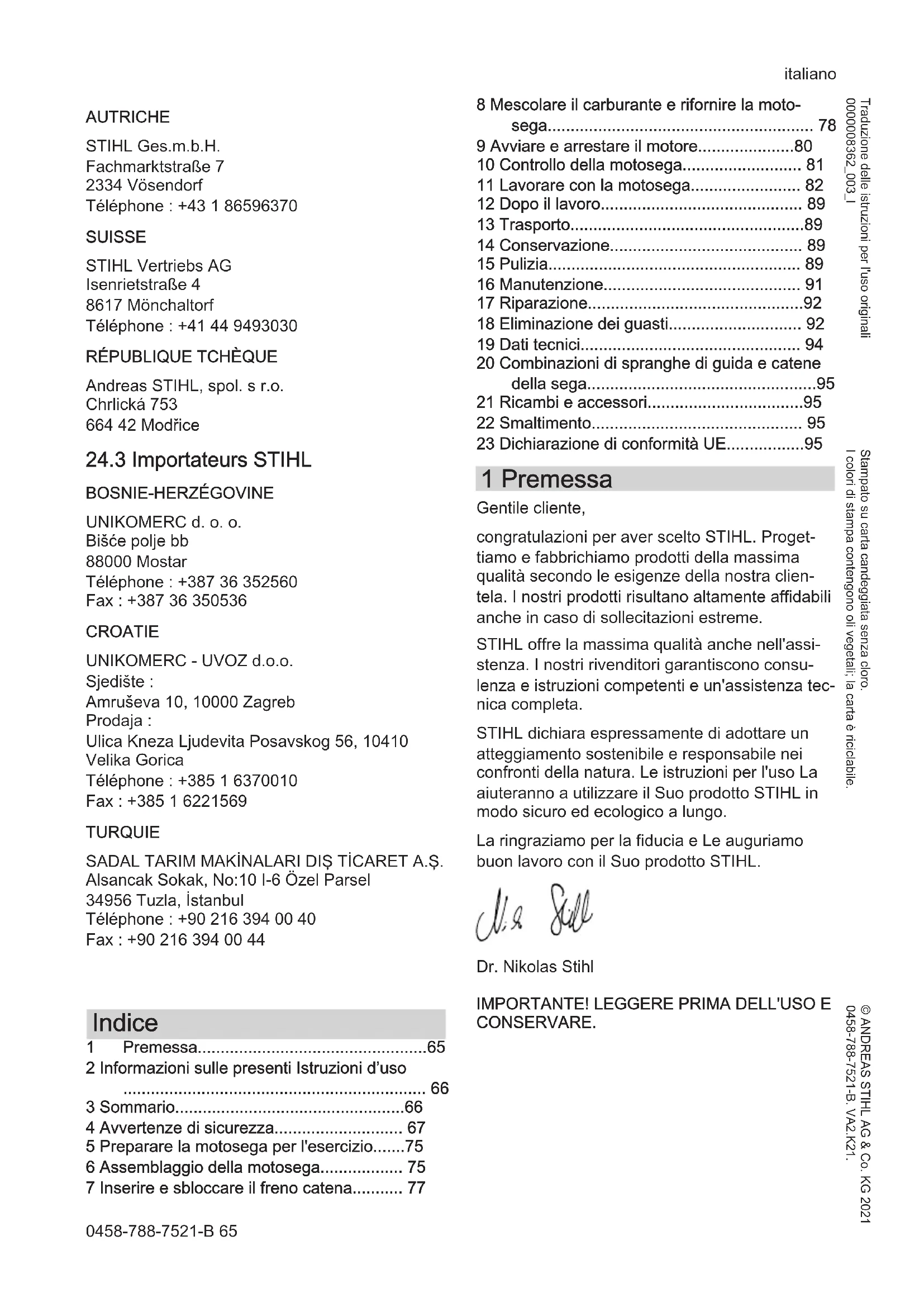 - 23 Dichiarazione di conformità UE 1 Premessa Gentile cliente, congratulazioni per aver scelto STIHL. Proget‐ tiamo e fabbrichiamo prodotti della massima qualità secondo le esigenze della nostra clien‐ tela. I nostri prodotti risultano altamente affidabili anche in caso di sollecitazioni estreme. STIHL offre la massima qualità anche nell'assi‐ stenza. I nostri rivenditori garantiscono consu‐ lenza e istruzioni competenti e un'assistenza tec‐ nica completa. STIHL dichiara espressamente di adottare un atteggiamento sostenibile e responsabile nei confronti della natura. Le istruzioni per l'uso La aiuteranno a utilizzare il Suo prodotto STIHL in modo sicuro ed ecologico a lungo. La ringraziamo per la fiducia e Le auguriamo buon lavoro con il Suo prodotto STIHL. Dr. Nikolas Stihl p. 95
