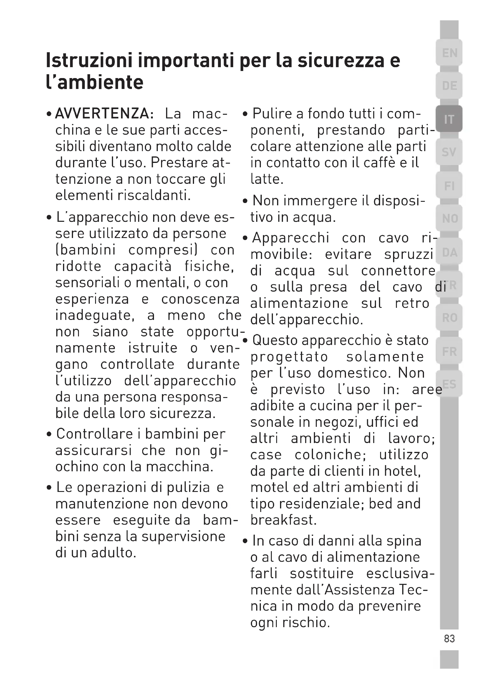 - Questo apparecchio può essereutilizzatodabam- biniapartiredagli8anni edapersonecon capac- ità fisiche, sensoriali o mentali ridotte o prive di esperienza e/o con- oscenze, qualora siano poste sotto supervisione oppurevenganoistruitein merito all’uso sicuro del dispositivo, comprenden- done i pericoli implicati. La pulizia elamanuten- zionedellamacchinanon devono essere effettuate dai bambini a meno che nonsianodietàsuperiore agli8anniesorvegliati.Te- nerel’apparecchioeilsuo cavodialimentazionefuori dallaportatadeibambini dietàinferioreagli8anni. Istruzioni importanti per la sicurezza e l’ambiente