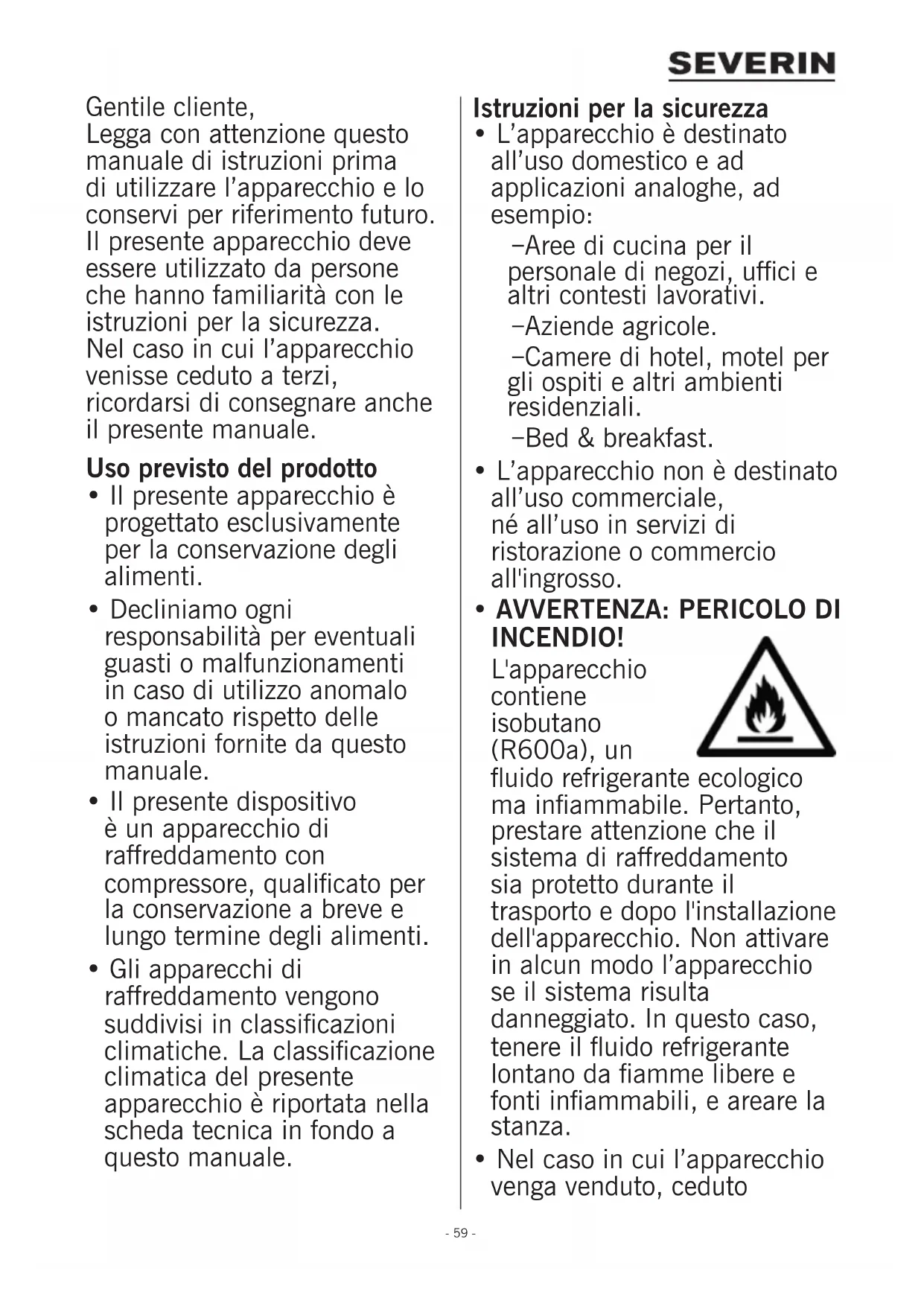 - Nel caso in cui l’apparecchio venga venduto, ceduto- 60 - a terzi o sottoposto al riciclaggio, fare riferimento al propellente inammabile ciclopentano (C