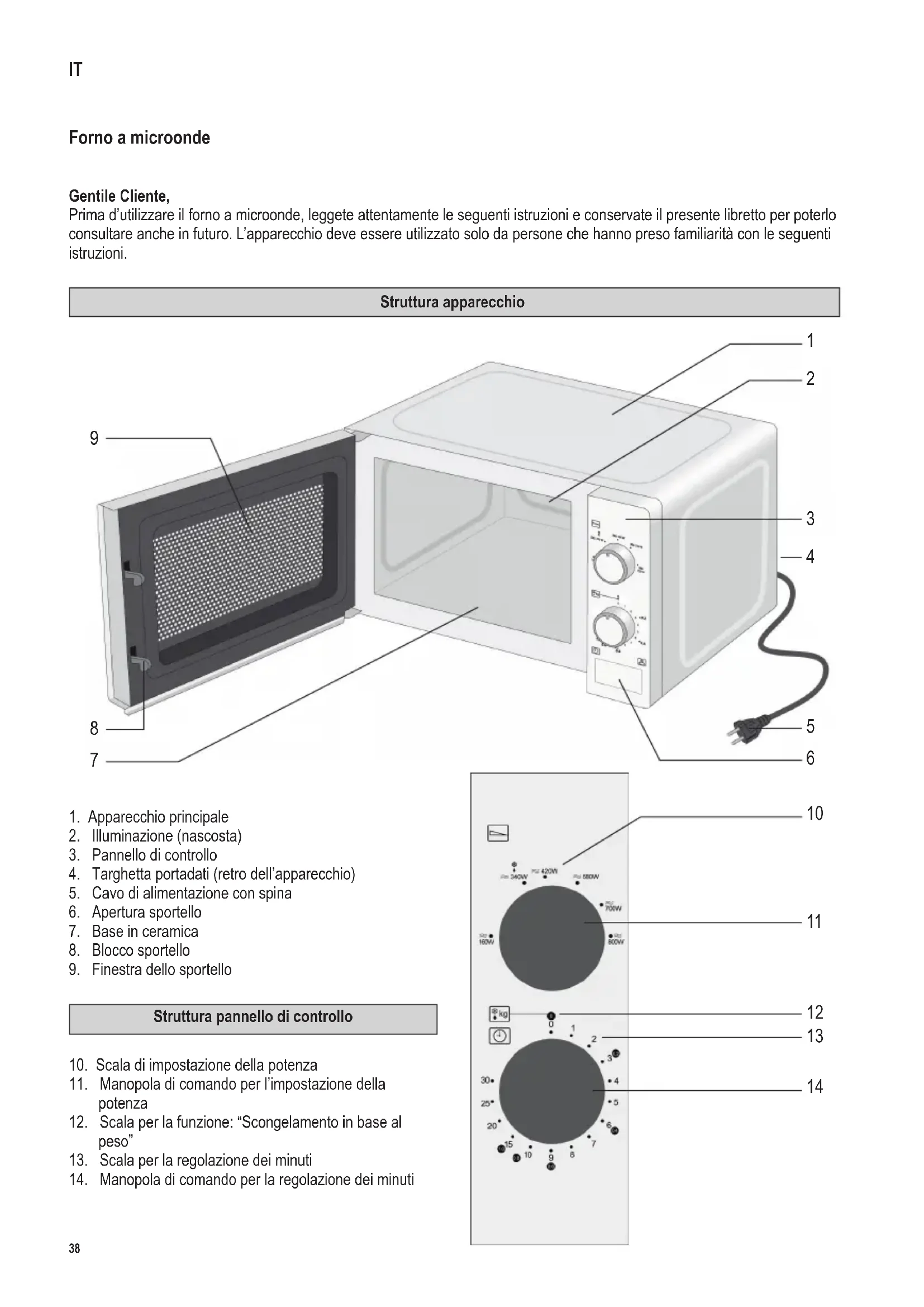 Attenzione: Le superci esterne dell’apparecchio potrebbero riscaldarsi durante l’uso. Esiste anche il rischio di emissione di vapore attraverso le fenditure di aerazione: pericolo di scottature. ∙ Prima del trasporto, innanzitutto lasciate raffreddare bene l’apparecchio. ∙ Evitate che l’apparecchio o il cavo d’alimentazione si trovino a contatto con fonti di calore. ∙ Non lasciate pendere liberamente il cavo di alimentazione e tenetelo lontano dagli elementi riscaldanti. ∙ La mancanza di una corretta pulizia dell’apparecchio potrebbe danneggiare la qualità delle superci e comportare l’eventuale diminuzione del ciclo di vita oltre che potenziali rischi per la sicurezza di chi lo utilizza. Dopo ogni utilizzo, pulite le guarnizioni dello sportello, l’area di cottura con la base in ceramica e le parti adiacenti con un panno umido. Per informazioni più dettagliate su come pulire l’apparecchio, consultate la sezione Pulizia. ∙ Non pulite l’apparecchio utilizzando delle idropulitrici.41 142 x 208 mm ∙ Questo apparecchio è studiato per il solo uso domestico o per impieghi simili, come per esempio - cucine per il personale, negozi, ufci e altri ambienti simili di lavoro, - aziende agricole, - clienti di alberghi, motel e stabilimenti simili, - clienti di pensioni “bed-and-breakfast” (letto & colazione). ∙ Avvertenza! Ogni manutenzione o assistenza che esiga la rimozione del coperchietto di protezione contro i raggi a microonde costituisce un rischio grave per le persone non qualicate. Ciò comprende la sostituzione del cavo di alimentazione speciale o di qualsiasi lampadina interna. L’apparecchio non deve essere aperto, tranne che da un tecnico qualicato. Nel caso in cui l’apparecchio richieda una riparazione, rinviatelo ad uno dei nostri Centri Assistenza Clienti i cui indirizzi si trovano in appendice al presente libretto. ∙ Quando mettete a riscaldare nel forno a microonde delle sostanze liquide, potrebbe succedere che il liquido si riscaldi oltre il punto di ebollizione, senza che sia visibile nessun ribollimento. È importante perciò prestare molta attenzione quando toccate i contenitori, ad esempio per toglierli dal forno. Per ridurre i rischi di trabocco, durante il processo di riscaldamento sarebbe opportuno introdurre nel contenitore un’asta in vetro termoresistente. ∙ Non mettete a riscaldare con il forno a microonde uova nei gusci o uova sode intere: rischierebbero di scoppiare, e il rischio persiste anche dopo che il processo di riscaldamento a microonde si è concluso. ∙ Avvertenza! È altrettanto pericoloso riscaldare con il forno a microonde liquidi o altri cibi solidi sistemati in contenitori chiusi perché potrebbero esplodere. ∙ Prima di mettere a riscaldare biberon o pappe per bambini in barattoli di vetro, agitate e mescolatene bene il contenuto per assicurare una distribuzione uniforme della temperatura. E prima di presentare il cibo al bambino, controllatene sempre la temperatura in modo da evitare dolorose e pericolose scottature. ∙ Quando riscaldate o cuocete cibo contenuto o avvolto in materiali combustibili quali la plastica o la carta, l’involucro rischia di inammarsi. Potrebbe succedere anche che il cibo si secchi o addirittura si inammi se il tempo di cottura è eccessivo. Anche il grasso o l’olio sono sostanze inammabili. È quindi importante sorvegliare l’apparecchio durante il funzionamento. I liquidi molto inammabili come l’alcool ad alta concentrazione, ovviamente non devono mai essere riscaldati. ∙ In caso di emissione di fumo durante il funzionamento, tenete lo sportello chiuso per impedire o soffocare eventuali amme. Spegnete immediatamente l’apparecchio e disinserite la spina dalla presa di corrente.42 142 x 208 mm ∙ Durante la funzione microonde, si riscaldano anche gli utensili e i contenitori da cucina: per non scottarvi quando togliete il cibo dal forno vi raccomandiamo di utilizzare sempre delle presine. ∙ I termometri da forno speciali (come quelli utilizzati nei forni tradizionali) non sono adatti per i forni a microonde. Prima di adoperare l’apparecchio per la prima volta ∙ Dopo la sballatura e prima di collegare alla rete di alimentazione, controllate accuratamente che l’apparecchio e il cavo di alimentazione non presentino nessuna traccia di deterioramento. ∙ Avvertenza! Assicuratevi che lo sportello (oblò d’osservazione, guarnizioni dello sportello e chiusure dello sportello compresi) non sia danneggiato o piegato e richiudete saldamente lo sportello contro il suo supporto. Ciò è importante per impedire l’emissione d’energia microonde durante il funzionamento. Per lo stesso motivo occorrerà esaminare accuratamente la parte esterna dell’apparecchio e l’interno del forno. In caso di danneggiamento, l’apparecchio non deve essere utilizzato nché non sarà stato controllato da un tecnico specializzato. ∙ Eliminate completamente tutti gli imballi esterni e interni. Non rimuovete la targhetta portadati. I materiali utilizzati per l’imballaggio sono riciclabili. ∙ Avvertenza: Tutto il materiale di imballaggio deve essere tenuto fuori della portata dei bambini a causa del rischio potenziale esistente, per esempio di soffocamento. ∙ Dovendo usare l’apparecchio per la prima volta, o dopo un lungo periodo di inattività, pulitelo accuratamente nel modo indicato nella sezione Pulizia. ∙ Avvertenza: non accendete l’apparecchio senza aver inserito nel forno il cibo da riscaldare o da cuocere. L’uso a vuoto dell’apparecchio rischia di danneggiarlo. Apparecchio ISM Questo è un apparecchio ISM del Gruppo 2 Classe B. A questo gruppo appartengono tutti gli apparecchi ISM (utilizzati a scopo industriale, scientico e medico) per i quali viene generata o utilizzata energia d’alta frequenza in forma di radiazioni elettromagnetiche per la lavorazione di materiali, nonché apparecchi ad elettroerosione. Apparecchi della Classe B sono previsti per l’impie