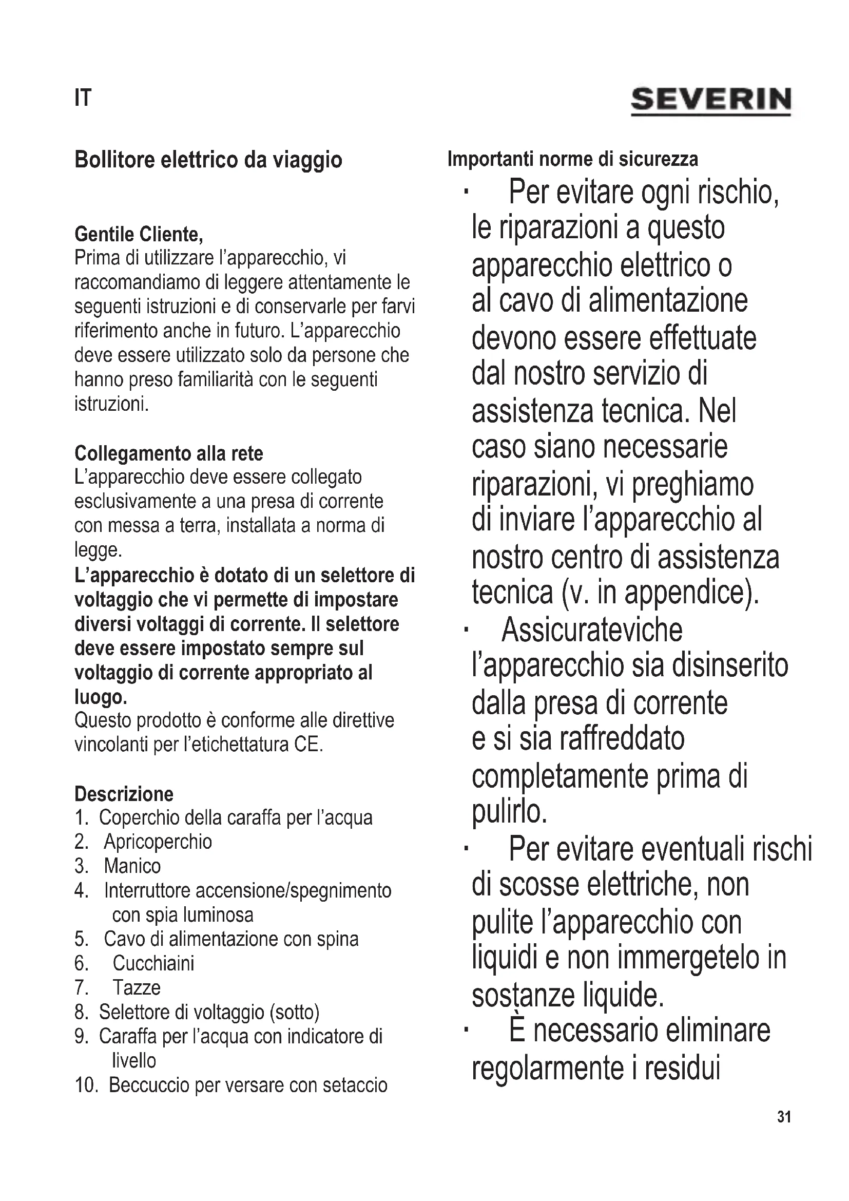 Bollitore elettrico da viaggio Gentile Cliente, Prima di utilizzare l’apparecchio, vi raccomandiamo di leggere attentamente le seguenti istruzioni e di conservarle per farvi riferimento anche in futuro. L’apparecchio deve essere utilizzato solo da persone che hanno preso familiarità con le seguenti istruzioni. Collegamento alla rete L’apparecchio deve essere collegato esclusivamente a una presa di corrente con messa a terra, installata a norma di legge. L’apparecchio è dotato di un selettore di voltaggio che vi permette di impostare diversi voltaggi di corrente. Il selettore deve essere impostato sempre sul voltaggio di corrente appropriato al luogo. Questo prodotto è conforme alle direttive vincolanti per l’etichettatura CE. Descrizione