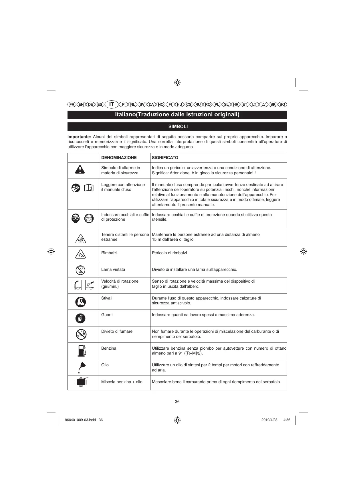 Italiano(Traduzione dalle istruzioni originali) SIMBOLI Importante: Alcuni dei simboli rappresentati di seguito possono comparire sul proprio apparecchio. Imparare a riconoscerli e memorizzarne il significato. Una corretta interpretazione di questi simboli consentirà all'operatore di utilizzare l'apparecchio con maggiore sicurezza e in modo adeguato. DENOMINAZIONE SIGNIFICATO Simbolo di allarme in materia di sicurezza Indica un pericolo, un'avvertenza o una condizione di attenzione. Significa: Attenzione, è in gioco la sicurezza personale!!! Leggere con attenzione il manuale d'uso Il manuale d'uso comprende particolari avvertenze destinate ad attirare l'attenzione dell'operatore su potenziali rischi, nonché informazioni relative al funzionamento e alla manutenzione dell'apparecchio. Per utilizzare l'apparecchio in totale sicurezza e in modo ottimale, leggere attentamente il presente manuale. Indossare occhiali e cuffie Indossare occhiali e cuffie di protezione quando si utilizza questo di protezione utensile. Tenere distanti le persone Mantenere le persone estranee ad una distanza di almeno estranee 15 m dall'area di taglio. Rimbalzi Pericolo di rimbalzi. Lama vietata Divieto di installare una lama sull'apparecchio. Velocità di rotazione (giri/min.) Senso di rotazione e velocità massima del dispositivo di taglio in uscita dall'albero. Stivali Durante l'uso di questo apparecchio, indossare calzature di sicurezza antiscivolo. Guanti Indossare guanti da lavoro spessi a massima aderenza. Divieto di fumare Non fumare durante le operazioni di miscelazione del carburante o di riempimento del serbatoio. Benzina Utilizzare benzina senza piombo per autovetture con numero di ottano almeno pari a 91 ([R+M]/2). Olio Utilizzare un olio di sintesi per 2 tempi per motori con raffreddamento ad aria. Miscela benzina + olio Mescolare bene il carburante prima di ogni riempimento del serbatoio.