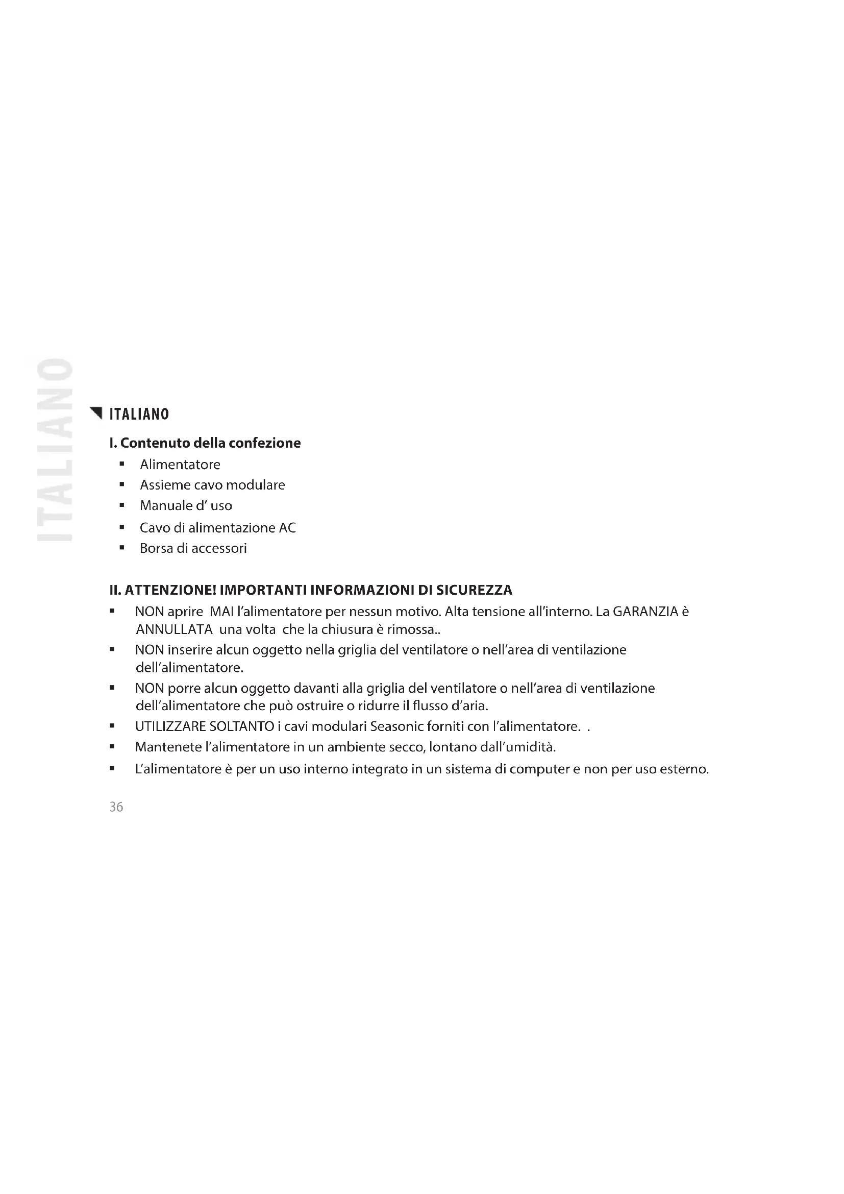 NON aprire MAI l’alimentatore per nessun motivo. Alta tensione all’interno. La GARANZIA è ANNULLATA una volta che la chiusura è rimossa.. NON inserire alcun oggetto nella griglia del ventilatore o nell’area di ventilazione dell’alimentatore. NON porre alcun oggetto davanti alla griglia del ventilatore o nell’area di ventilazione dell’alimentatore che può ostruire o ridurre il usso d’aria. UTILIZZARE SOLTANTO i cavi modulari Seasonic forniti con l’alimentatore. . Mantenete l’alimentatore in un ambiente secco, lontano dall’umidità. L’alimentatore è per un uso interno integrato in un sistema di computer e non per uso esterno. ITALIANO ITALIANO37