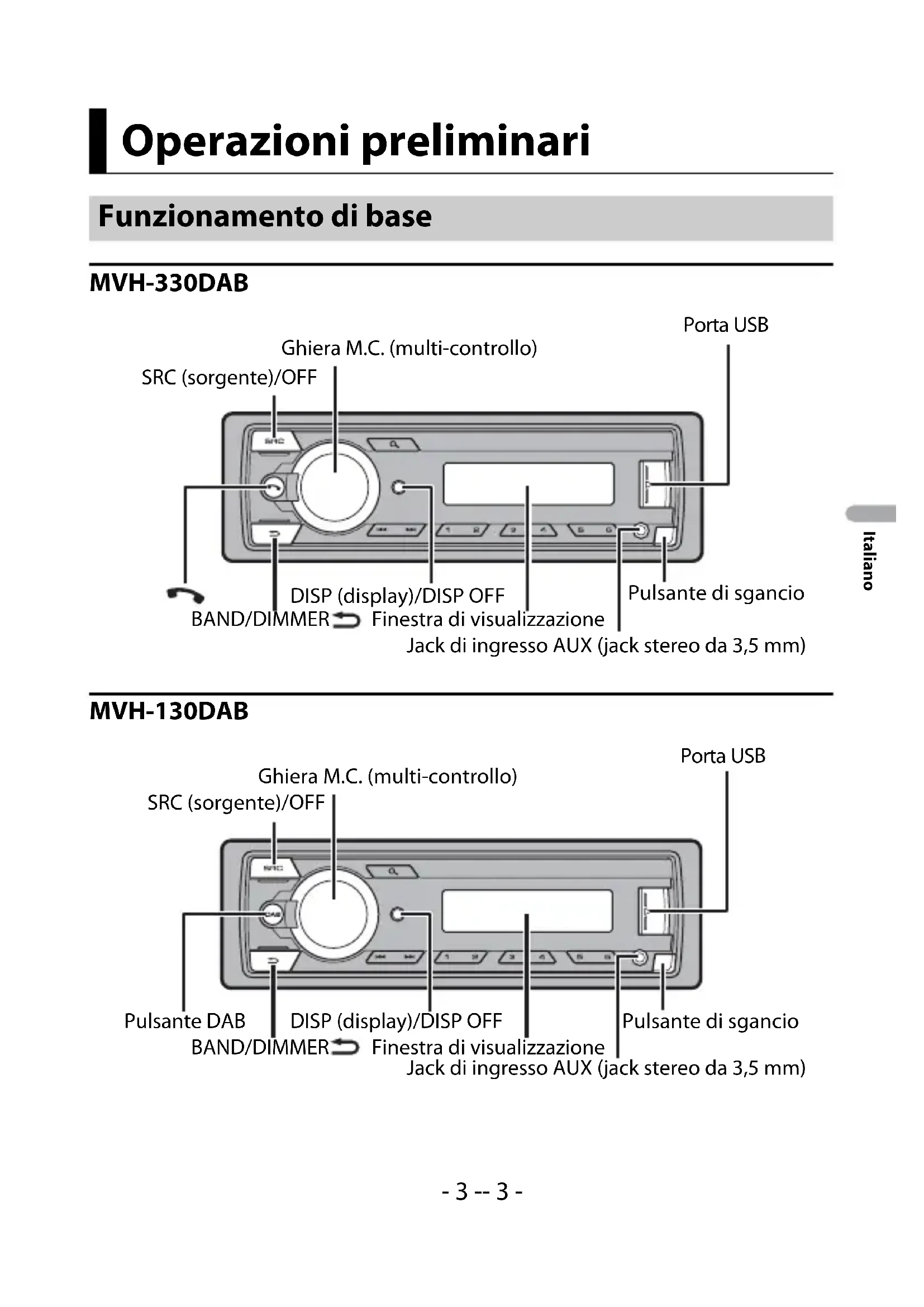 - Nelle seguenti istruzioni, una memoria USB o un lettore audio USB viene denominato “dispositivo USB”. Sommario- 3 -- 3 - Italiano MVH-330DAB MVH-130DAB Operazioni preliminari Funzionamento di base SRC (sorgente)/OFF Porta USB Ghiera M.C. (multi-controllo) BAND/DIMMER Finestra di visualizzazione DISP (display)/DISP OFF Pulsante di sgancio Jack di ingresso AUX (jack stereo da 3,5 mm) SRC (sorgente)/OFF Pulsante di sgancio Finestra di visualizzazione Ghiera M.C. (multi-controllo) BAND/DIMMER DISP (display)/DISP OFF Pulsante DAB Jack di ingresso AUX (jack stereo da 3,5 mm) Porta USB- 4 - Italiano Operazioni frequenti I pulsanti disponibili variano in base all’unità.