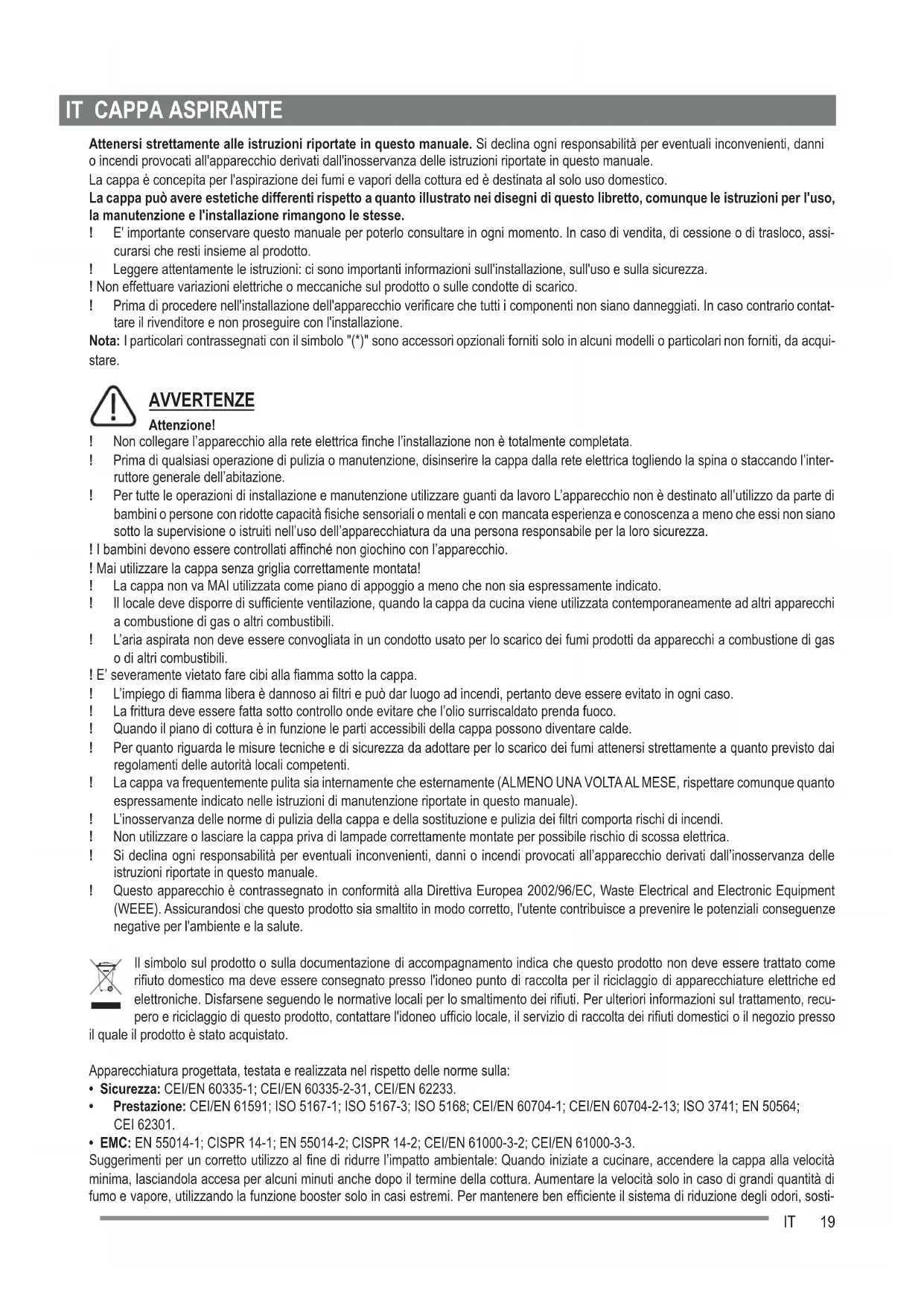 Attenersi strettamente alle istruzioni riportate in questo manuale. Si declina ogni responsabilità per eventuali inconvenienti, danni o incendi provocati all'apparecchio derivati dall'inosservanza delle istruzioni riportate in questo manuale. La cappa è concepita per l'aspirazione dei fumi e vapori della cottura ed è destinata al solo uso domestico. La cappa può avere estetiche differenti rispetto a quanto illustrato nei disegni di questo libretto, comunque le istruzioni per l'uso, la manutenzione e l'installazione rimangono le stesse. ! E' importante conservare questo manuale per poterlo consultare in ogni momento. In caso di vendita, di cessione o di trasloco, assi- curarsi che resti insieme al prodotto. ! Leggere attentamente le istruzioni: ci sono importanti informazioni sull'installazione, sull'uso e sulla sicurezza. ! Non effettuare variazioni elettriche o meccaniche sul prodotto o sulle condotte di scarico. ! Prima di procedere nell'installazione dell'apparecchio verificare che tutti i componenti non siano danneggiati. In caso contrario contat- tare il rivenditore e non proseguire con l'installazione. Nota: I particolari contrassegnati con il simbolo "(*)" sono accessori opzionali forniti solo in alcuni modelli o particolari non forniti, da acqui- AVVERTENZE Attenzione! ! Non collegare l’apparecchio alla rete elettrica finche l’installazione non è totalmente completata. ! Prima di qualsiasi operazione di pulizia o manutenzione, disinserire la cappa dalla rete elettrica togliendo la spina o staccando l’inter- ruttore generale dell’abitazione. ! Per tutte le operazioni di installazione e manutenzione utilizzare guanti da lavoro L’apparecchio non è destinato all’utilizzo da parte di bambini o persone con ridotte capacità fisiche sensoriali o mentali e con mancata esperienza e conoscenza a meno che essi non siano sotto la supervisione o istruiti nell’uso dell’apparecchiatura da una persona responsabile per la loro sicurezza. ! I bambini devono essere controllati affinché non giochino con l’apparecchio. ! Mai utilizzare la cappa senza griglia correttamente montata! ! La cappa non va MAI utilizzata come piano di appoggio a meno che non sia espressamente indicato. ! Il locale deve disporre di sufficiente ventilazione, quando la cappa da cucina viene utilizzata contemporaneamente ad altri apparecchi a combustione di gas o altri combustibili. ! L’aria aspirata non deve essere convogliata in un condotto usato per lo scarico dei fumi prodotti da apparecchi a combustione di gas o di altri combustibili. ! E’ severamente vietato fare cibi alla fiamma sotto la cappa. ! L’impiego di fiamma libera è dannoso ai filtri e può dar luogo ad incendi, pertanto deve essere evitato in ogni caso. ! La frittura deve essere fatta sotto controllo onde evitare che l’olio surriscaldato prenda fuoco. ! Quando il piano di cottura è in funzione le parti accessibili della cappa possono diventare calde. ! Per quanto riguarda le misure tecniche e di sicurezza da adottare per lo scarico dei fumi attenersi strettamente a quanto previsto dai regolamenti delle autorità locali competenti. ! La cappa va frequentemente pulita sia internamente che esternamente (ALMENO UNA VOLTA AL MESE, rispettare comunque quanto espressamente indicato nelle istruzioni di manutenzione riportate in questo manuale). ! L’inosservanza delle norme di pulizia della cappa e della sostituzione e pulizia dei filtri comporta rischi di incendi. ! Non utilizzare o lasciare la cappa priva di lampade correttamente montate per possibile rischio di scossa elettrica. ! Si declina ogni responsabilità per eventuali inconvenienti, danni o incendi provocati all’apparecchio derivati dall’inosservanza delle istruzioni riportate in questo manuale. ! Questo apparecchio è contrassegnato in conformità alla Direttiva Europea 2002/96/EC, Waste Electrical and Electronic Equipment (WEEE). Assicurandosi che questo prodotto sia smaltito in modo corretto, l'utente contribuisce a prevenire le potenziali conseguenze negative per l'ambiente e la salute. Il simbolo sul prodotto o sulla documentazione di accompagnamento indica che questo prodotto non deve essere trattato come rifiuto domestico ma deve essere consegnato presso l'idoneo punto di raccolta per il riciclaggio di apparecchiature elettriche ed elettroniche. Disfarsene seguendo le normative locali per lo smaltimento dei rifiuti. Per ulteriori informazioni sul trattamento, recu- pero e riciclaggio di questo prodotto, contattare l'idoneo ufficio locale, il servizio di raccolta dei rifiuti domestici o il negozio presso il quale il prodotto è stato acquistato. Apparecchiatura progettata, testata e realizzata nel rispetto delle norme sulla:
