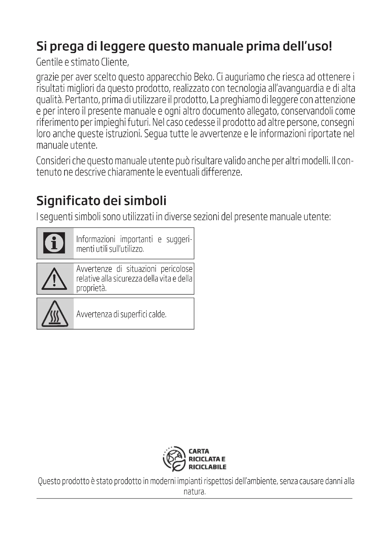 - Transportez l'appareil dans une position nor- male. Évitez de le pencher vers l'avant ou vers l'arrière.Si prega di leggere questo manuale prima dell’uso! Gentile e stimato Cliente, grazie per aver scelto questo apparecchio Beko. Ci auguriamo che riesca ad ottenere i risultati migliori da questo prodotto, realizzato con tecnologia all’avanguardia e di alta qualità. Pertanto, prima di utilizzare il prodotto, La preghiamo di leggere con attenzione e per intero il presente manuale e ogni altro documento allegato, conservandoli come riferimento per impieghi futuri. Nel caso cedesse il prodotto ad altre persone, consegni loro anche queste istruzioni. Segua tutte le avvertenze e le informazioni riportate nel manuale utente. Consideri che questo manuale utente può risultare valido anche per altri modelli. Il con- tenuto ne descrive chiaramente le eventuali differenze. Significato dei simboli I seguenti simboli sono utilizzati in diverse sezioni del presente manuale utente: