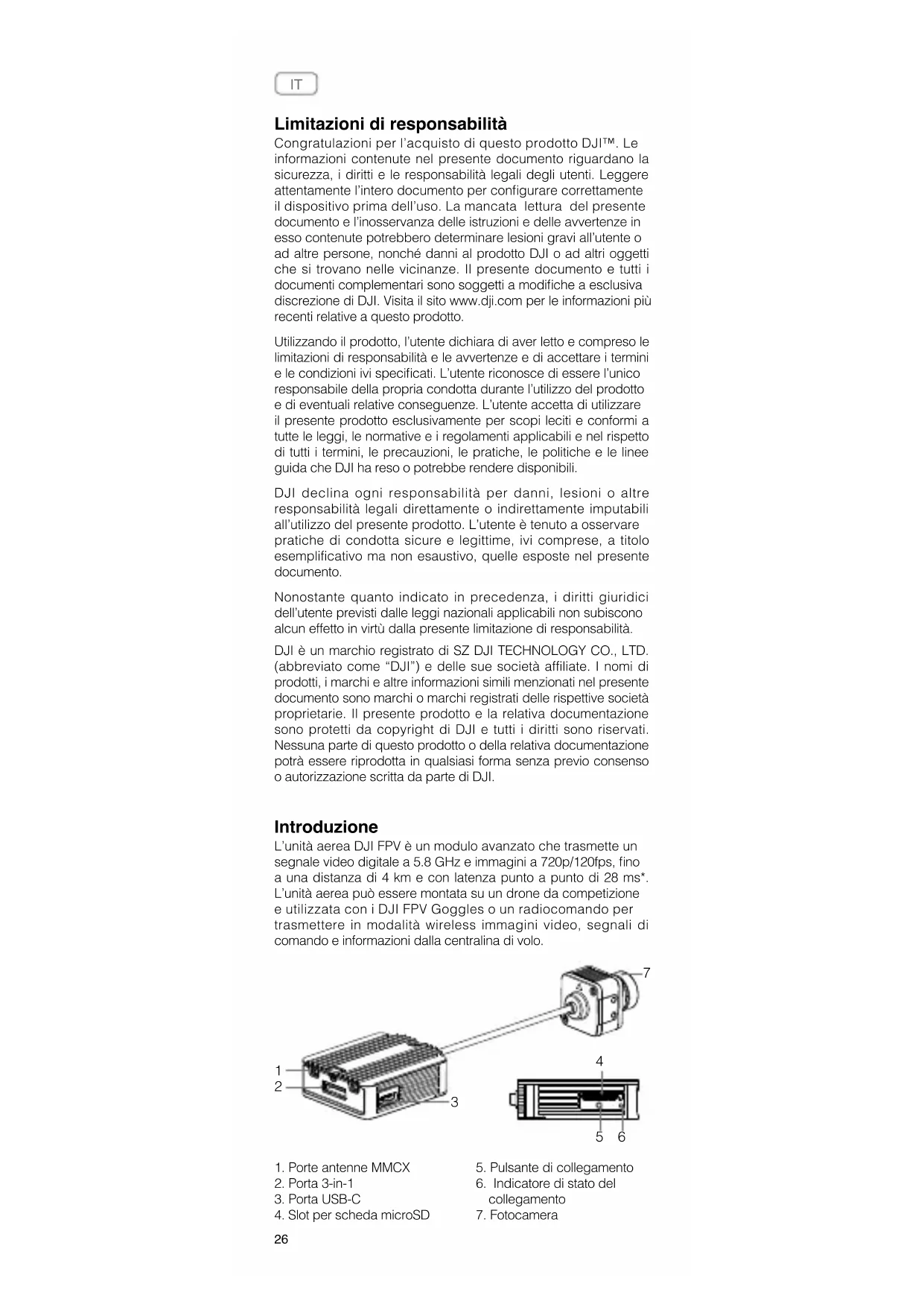 Limitazioni di responsabilità Congratulazioni per l’acquisto di questo prodotto DJI™. Le informazioni contenute nel presente documento riguardano la sicurezza, i diritti e le responsabilità legali degli utenti. Leggere attentamente l’intero documento per congurare correttamente il dispositivo prima dell’uso. La mancata lettura del presente documento e l’inosservanza delle istruzioni e delle avvertenze in esso contenute potrebbero determinare lesioni gravi all’utente o ad altre persone, nonché danni al prodotto DJI o ad altri oggetti che si trovano nelle vicinanze. Il presente documento e tutti i documenti complementari sono soggetti a modiche a esclusiva discrezione di DJI. Visita il sito www.dji.com per le informazioni più recenti relative a questo prodotto. Utilizzando il prodotto, l’utente dichiara di aver letto e compreso le limitazioni di responsabilità e le avvertenze e di accettare i termini e le condizioni ivi specicati. L’utente riconosce di essere l’unico responsabile della propria condotta durante l’utilizzo del prodotto e di eventuali relative conseguenze. L’utente accetta di utilizzare il presente prodotto esclusivamente per scopi leciti e conformi a tutte le leggi, le normative e i regolamenti applicabili e nel rispetto di tutti i termini, le precauzioni, le pratiche, le politiche e le linee guida che DJI ha reso o potrebbe rendere disponibili. DJI declina ogni responsabilità per danni, lesioni o altre responsabilità legali direttamente o indirettamente imputabili all’utilizzo del presente prodotto. L’utente è tenuto a osservare pratiche di condotta sicure e legittime, ivi comprese, a titolo esemplificativo ma non esaustivo, quelle esposte nel presente documento. Nonostante quanto indicato in precedenza, i diritti giuridici dell’utente previsti dalle leggi nazionali applicabili non subiscono alcun effetto in virtù dalla presente limitazione di responsabilità. DJI è un marchio registrato di SZ DJI TECHNOLOGY CO., LTD. (abbreviato come “DJI”) e delle sue società affiliate. I nomi di prodotti, i marchi e altre informazioni simili menzionati nel presente documento sono marchi o marchi registrati delle rispettive società proprietarie. Il presente prodotto e la relativa documentazione sono protetti da copyright di DJI e tutti i diritti sono riservati. Nessuna parte di questo prodotto o della relativa documentazione potrà essere riprodotta in qualsiasi forma senza previo consenso o autorizzazione scritta da parte di DJI. Introduzione L’unità aerea DJI FPV è un modulo avanzato che trasmette un segnale video digitale a 5.8 GHz e immagini a 720p/120fps, no a una distanza di 4 km e con latenza punto a punto di 28 ms*. L’unità aerea può essere montata su un drone da competizione e utilizzata con i DJI FPV Goggles o un radiocomando per trasmettere in modalità wireless immagini video, segnali di comando e informazioni dalla centralina di volo.