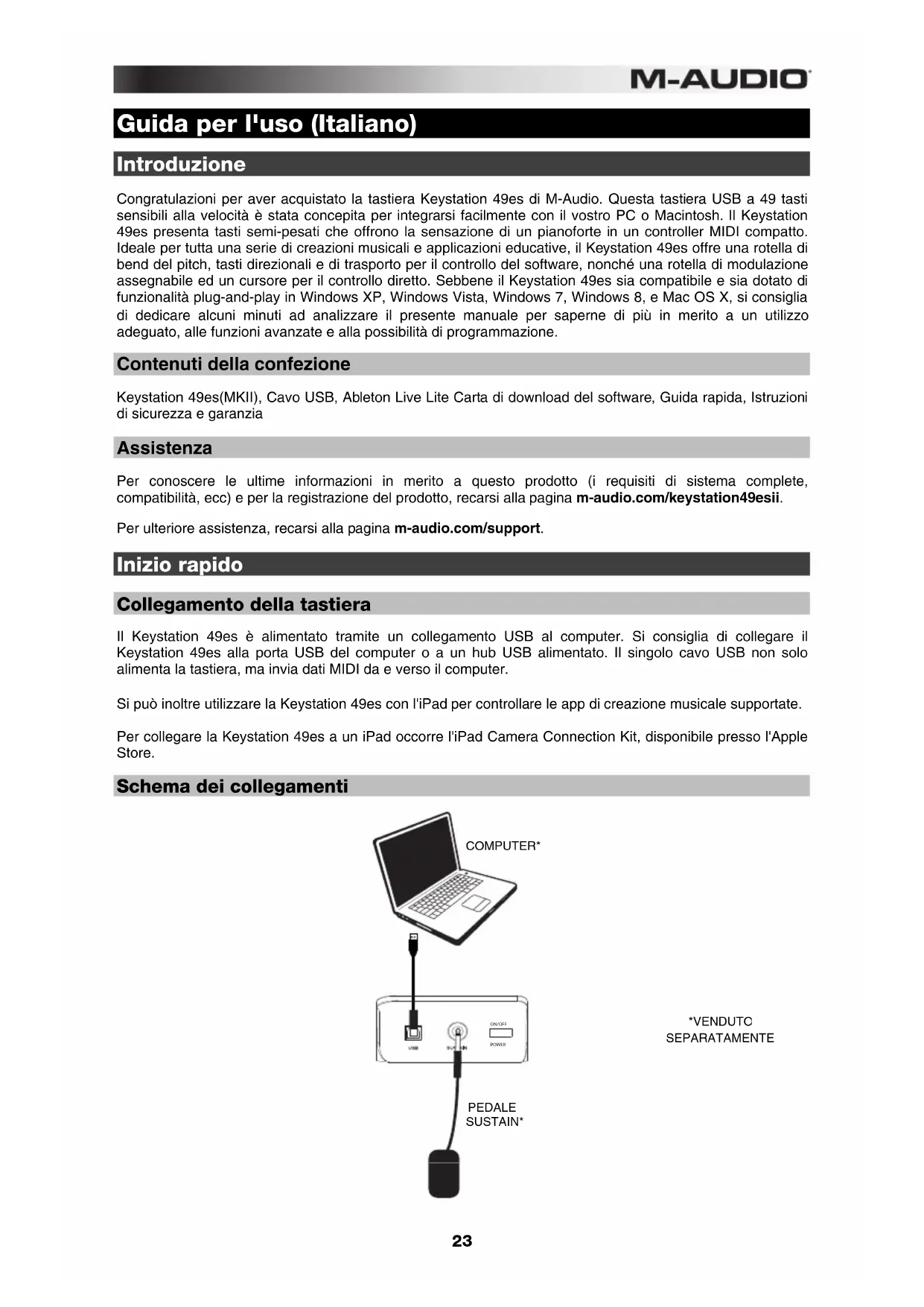 Contenuti della confezione Keystation 49es(MKII), Cavo USB, Ableton Live Lite Carta di download del software, Guida rapida, Istruzioni di sicurezza e garanzia Assistenza Per conoscere le ultime informazioni in merito a questo prodotto (i requisiti di sistema complete, compatibilità, ecc) e per la registrazione del prodotto, recarsi alla pagina m-audio.com/keystation49esii. Per ulteriore assistenza, recarsi alla pagina m-audio.com/support. Inizio rapido Collegamento della tastiera Il Keystation 49es è alimentato tramite un collegamento USB al computer. Si consiglia di collegare il Keystation 49es alla porta USB del computer o a un hub USB alimentato. Il singolo cavo USB non solo alimenta la tastiera, ma invia dati MIDI da e verso il computer. Si può inoltre utilizzare la Keystation 49es con l'iPad per controllare le app di creazione musicale supportate. Per collegare la Keystation 49es a un iPad occorre l'iPad Camera Connection Kit, disponibile presso l'Apple Store.
