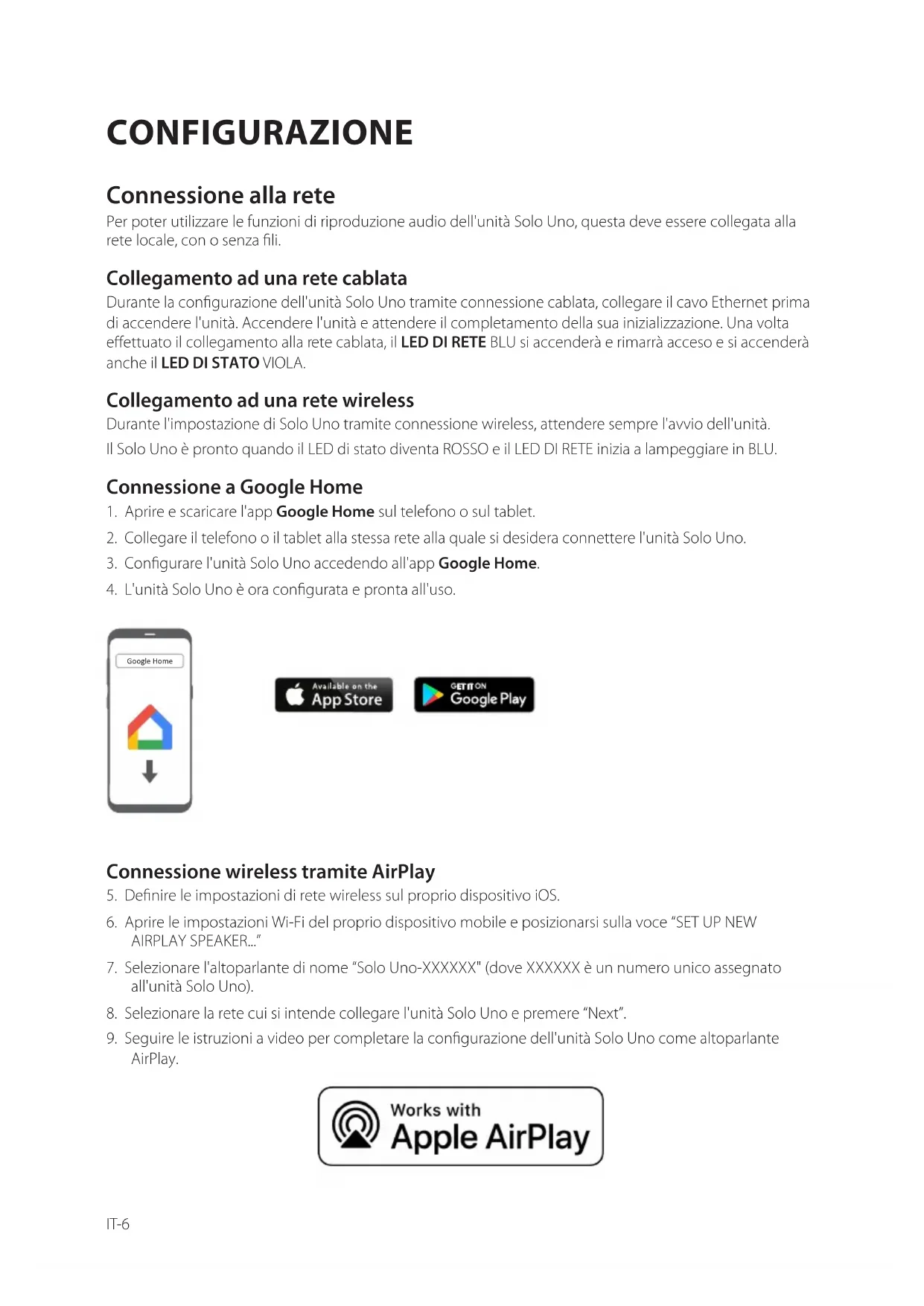 CONFIGURAZIONE Connessione alla rete Per poter utilizzare le funzioni di riproduzione audio dell'unità Solo Uno, questa deve essere collegata alla rete locale, con o senza li. Collegamento ad una rete cablata Durante la congurazione dell'unità Solo Uno tramite connessione cablata, collegare il cavo Ethernet prima di accendere l'unità. Accendere l'unità e attendere il completamento della sua inizializzazione. Una volta eettuato il collegamento alla rete cablata, il LED DI RETE BLU si accenderà e rimarrà acceso e si accenderà anche il LED DI STATO VIOLA. Collegamento ad una rete wireless Durante l'impostazione di Solo Uno tramite connessione wireless, attendere sempre l'avvio dell'unità. IlSolo Uno è pronto quando il LED di stato diventa ROSSO e il LED DI RETE inizia a lampeggiare in BLU. Connessione a Google Home