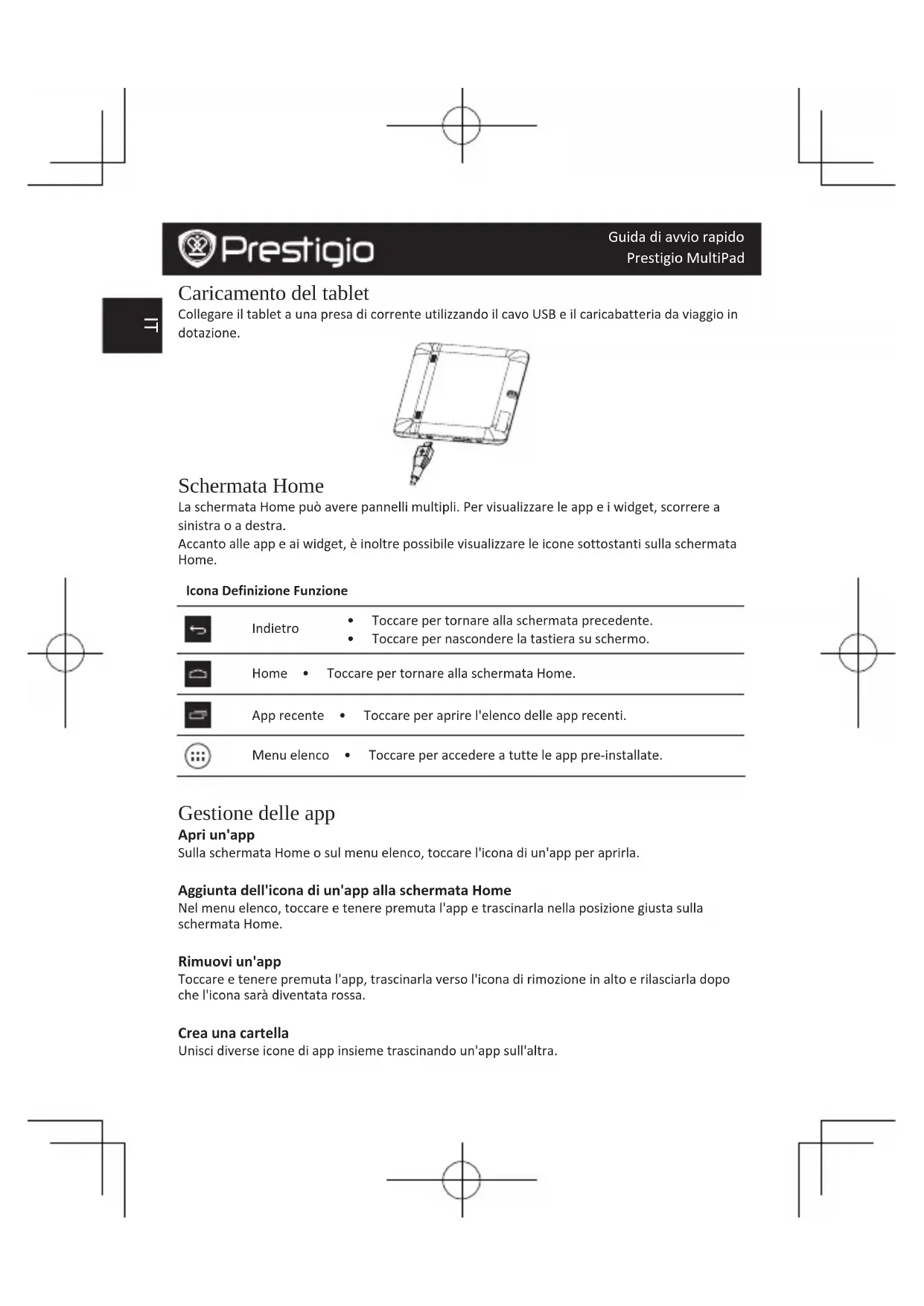 NanoSIM MicroSIM StandardSIM 3.Premereetenerepremutoilpulsantediaccensioneperaccendereiltablet.IT Guida di avvio rapido Prestigio MultiPad Caricamento del tablet CollegareiltabletaunapresadicorrenteutilizzandoilcavoUSBeilcaricabatteriadaviaggioin dotazione. Schermata Home LaschermataHomepuòaverepannellimultipli.Pervisualizzareleappeiwidget,scorrerea sinistraoadestra. Accantoalleappeaiwidget,èinoltrepossibilevisualizzareleiconesottostantisullaschermata Home. Icona Definizione Funzione Indietro