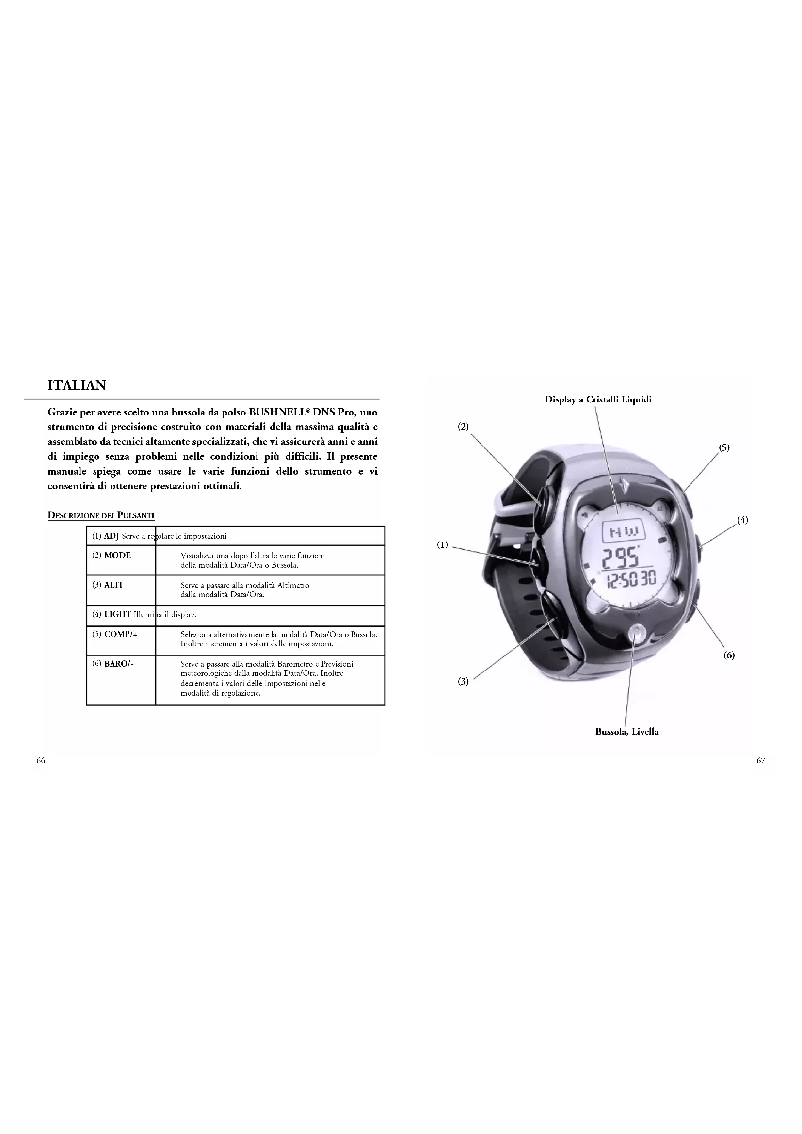 (1) ADJ Serve a regolare le impostazioni (2) MODE Visualizza una dopo l’altra le varie funzioni della modalità Data/Ora o Bussola. (3) ALTI Serve a passare alla modalità Altimetro dalla modalità Data/Ora. (4) LIGHT Illumina il display. (5) COMP/+ Seleziona alternativamente la modalità Data/Ora o Bussola. Inoltre incrementa i valori delle impostazioni. (6) BARO/- Serve a passare alla modalità Barometro e Previsioni meteorologiche dalla modalità Data/Ora. Inoltre decrementa i valori delle impostazioni nelle modalità di regolazione.