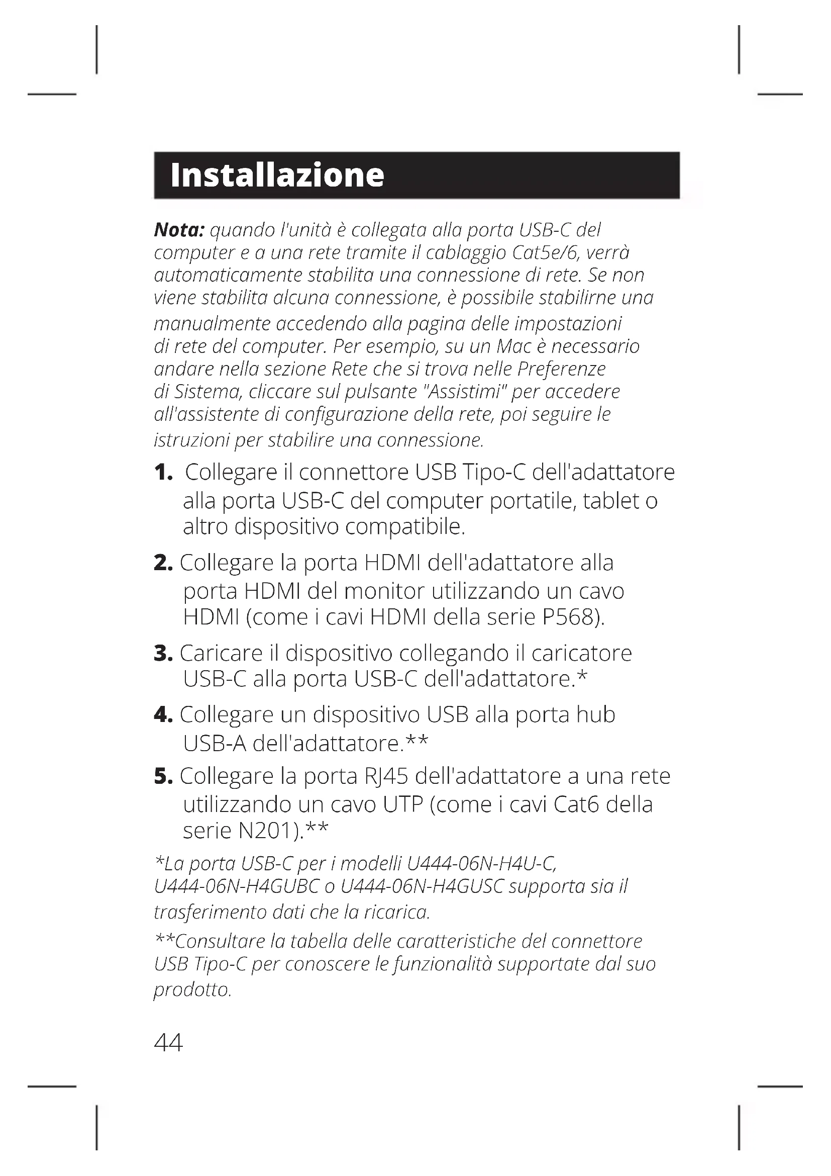 utilizzando un cavo UTP (come i cavi Cat6 della serie N201).** *La porta USB-C per i modelli U444-06N-H4U-C, U444-06N-H4GUBC o U444-06N-H4GUSC supporta sia il trasferimento dati che la ricarica. **Consultare la tabella delle caratteristiche del connettore USB Tipo-C per conoscere le funzionalità supportate dal suo prodotto.45 Modelli U444-06N-H4-C U444-06N-H4B-C U444-06N-H4U-C U444-06N-H4UB-C Connettori di ingresso USB USB-C (maschio) Supporto per la ricarica della porta USB-C