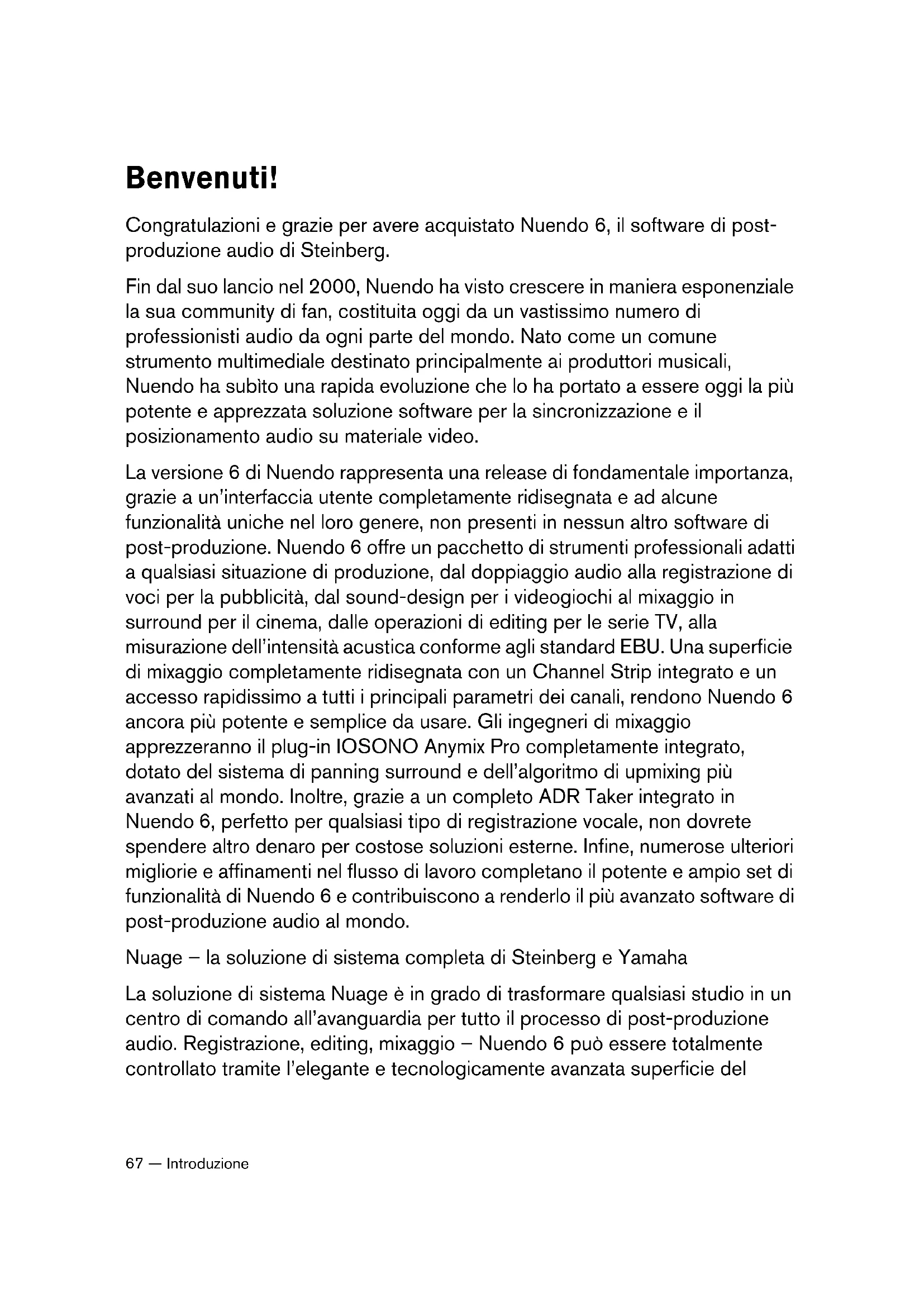 Introduzione Quick_Start_Guide_DeEnEsFrIt.book Page 66 Monday, November 12, 2012 2:12 PM67 — Introduzione Benvenuti! Congratulazioni e grazie per avere acquistato Nuendo 6, il software di post- produzione audio di Steinberg. Fin dal suo lancio nel 2000, Nuendo ha visto crescere in maniera esponenziale la sua community di fan, costituita oggi da un vastissimo numero di professionisti audio da ogni parte del mondo. Nato come un comune strumento multimediale destinato principalmente ai produttori musicali, Nuendo ha subìto una rapida evoluzione che lo ha portato a essere oggi la più potente e apprezzata soluzione software per la sincronizzazione e il posizionamento audio su materiale video. La versione 6 di Nuendo rappresenta una release di fondamentale importanza, grazie a un’interfaccia utente completamente ridisegnata e ad alcune funzionalità uniche nel loro genere, non presenti in nessun altro software di post-produzione. Nuendo 6 offre un pacchetto di strumenti professionali adatti a qualsiasi situazione di produzione, dal doppiaggio audio alla registrazione di voci per la pubblicità, dal sound-design per i videogiochi al mixaggio in surround per il cinema, dalle operazioni di editing per le serie TV, alla misurazione dell’intensità acustica conforme agli standard EBU. Una superficie di mixaggio completamente ridisegnata con un Channel Strip integrato e un accesso rapidissimo a tutti i principali parametri dei canali, rendono Nuendo 6 ancora più potente e semplice da usare. Gli ingegneri di mixaggio apprezzeranno il plug-in IOSONO Anymix Pro completamente integrato, dotato del sistema di panning surround e dell’algoritmo di upmixing più avanzati al mondo. Inoltre, grazie a un completo ADR Taker integrato in Nuendo 6, perfetto per qualsiasi tipo di registrazione vocale, non dovrete spendere altro denaro per costose soluzioni esterne. Infine, numerose ulteriori migliorie e affinamenti nel flusso di lavoro completano il potente e ampio set di funzionalità di Nuendo 6 e contribuiscono a renderlo il più avanzato software di post-produzione audio al mondo. Nuage – la soluzione di sistema completa di Steinberg e Yamaha La soluzione di sistema Nuage è in grado di trasformare qualsiasi studio in un centro di comando all’avanguardia per tutto il processo di post-produzione audio. Registrazione, editing, mixaggio – Nuendo 6 può essere totalmente controllato tramite l’elegante e tecnologicamente avanzata superficie del Quick_Start_Guide_DeEnEsFrIt.book Page 67 Monday, November 12, 2012 2:12 PMIntroduzione — 68 ITALIANO controller hardware di Nuage. Inoltre, una serie di interfacce di ingresso e uscita analogiche e digitali, unite a delle opzioni hardware aggiuntive come il sincronizzatore Nuendo SyncStation, contribuiscono a creare un ambiente di studio moderno, in grado di accelerare drasticamente il flusso di lavoro nell’ambito della produzione audio. Non dimenticate di registravi su MySteinberg e ottenere così l’accesso a tutti i nostri servizi aggiuntivi. Inoltre, saremmo onorati di avervi come nuovi membri della community di Nuendo. Il forum online di Nuendo è raggiungibile all’indirizzo web www.steinberg.net. A presto! Il vostro Team Nuendo di Steinberg Informazioni sulla documentazione e sulla sezione di aiuto La documentazione di Nuendo è divisa in varie sezioni, come indicato in seguito. I documenti sono disponibili in formato Adobe Acrobat (estensione .pdf) ed è possibile accedervi come segue: