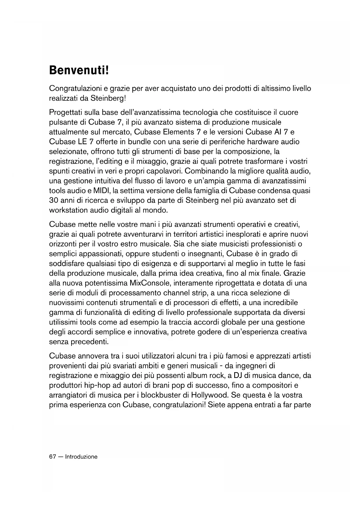 Introduzione Quick_Start_Guide_DeEnEsFrIt.book Page 66 Tuesday, April 23, 2013 10:53 AM67 — Introduzione Benvenuti! Congratulazioni e grazie per aver acquistato uno dei prodotti di altissimo livello realizzati da Steinberg! Progettati sulla base dell’avanzatissima tecnologia che costituisce il cuore pulsante di Cubase 7, il più avanzato sistema di produzione musicale attualmente sul mercato, Cubase Elements 7 e le versioni Cubase AI 7 e Cubase LE 7 offerte in bundle con una serie di periferiche hardware audio selezionate, offrono tutti gli strumenti di base per la composizione, la registrazione, l’editing e il mixaggio, grazie ai quali potrete trasformare i vostri spunti creativi in veri e propri capolavori. Combinando la migliore qualità audio, una gestione intuitiva del flusso di lavoro e un’ampia gamma di avanzatissimi tools audio e MIDI, la settima versione della famiglia di Cubase condensa quasi 30 anni di ricerca e sviluppo da parte di Steinberg nel più avanzato set di workstation audio digitali al mondo. Cubase mette nelle vostre mani i più avanzati strumenti operativi e creativi, grazie ai quali potrete avventurarvi in territori artistici inesplorati e aprire nuovi orizzonti per il vostro estro musicale. Sia che siate musicisti professionisti o semplici appassionati, oppure studenti o insegnanti, Cubase è in grado di soddisfare qualsiasi tipo di esigenza e di supportarvi al meglio in tutte le fasi della produzione musicale, dalla prima idea creativa, fino al mix finale. Grazie alla nuova potentissima MixConsole, interamente riprogettata e dotata di una serie di moduli di processamento channel strip, a una ricca selezione di nuovissimi contenuti strumentali e di processori di effetti, a una incredibile gamma di funzionalità di editing di livello professionale supportata da diversi utilissimi tools come ad esempio la traccia accordi globale per una gestione degli accordi semplice e innovativa, potrete godere di un’esperienza creativa senza precedenti. Cubase annovera tra i suoi utilizzatori alcuni tra i più famosi e apprezzati artisti provenienti dai più svariati ambiti e generi musicali - da ingegneri di registrazione e mixaggio dei più possenti album rock, a DJ di musica dance, da produttori hip-hop ad autori di brani pop di successo, fino a compositori e arrangiatori di musica per i blockbuster di Hollywood. Se questa è la vostra prima esperienza con Cubase, congratulazioni! Siete appena entrati a far parte Quick_Start_Guide_DeEnEsFrIt.book Page 67 Tuesday, April 23, 2013 10:53 AMIntroduzione — 68 ITALIANO di una vastissima community di professionisti e appassionati del mondo musicale. Date uno sguardo alla community mondiale ufficiale di Cubase al sito web http://www.steinberg.net/forum, dove potrete trovare trucchi, suggerimenti e una grande quantità di altre utili informazioni. Nel caso in cui stiate utilizzando Cubase LE 7 o AI 7, assicuratevi di provare le incredibili aggiunte a Cubase Elements 7, semplicemente inserendo un codice di attivazione di prova e senza la necessità di alcuna nuova installazione! Non dimenticate di registrare la vostra versione di Cubase nella sezione MySteinberg, così da avere accesso al supporto online e ad altri esclusivi servizi aggiuntivi. Vi auguriamo di trovare la migliore ispirazione musicale mentre lavorerete con la vostra nuovissima DAW Cubase. A presto! Il vostro Team Cubase di Steinberg Informazioni sulla documentazione e sulla sezione di aiuto La documentazione di Cubase è divisa in varie sezioni, come indicato di seguito. I documenti sono disponibili in formato Adobe Acrobat (estensione .pdf) ed è possibile accedervi come segue: