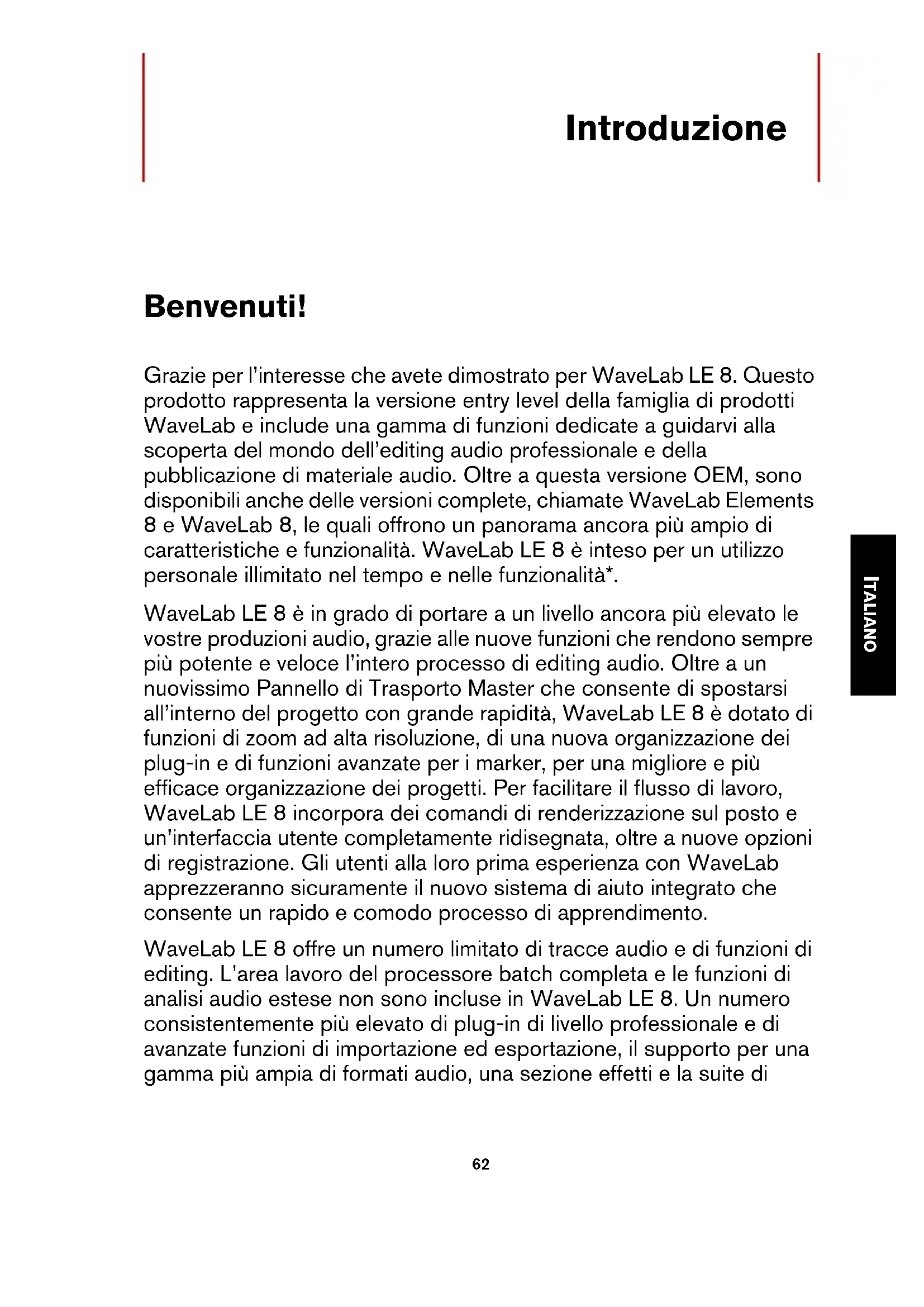 Configuration de votre système 57ItalianoCristina Bachmann, Heiko Bischoff, Christina Kaboth, Insa Mingers, SabinePfeifer, BenjaminSchütte Traduzione: Filippo Manfredi Il documento in pdf offre un accesso facilitato per utenti non vedenti. Si noti che a causa della complessità del documento e dell’elevato numero di immagini in esso presenti non è stato possibile includere delle descrizioni testuali delle stesse. Le informazioni contenute in questo manuale sono soggette a variazioni senza preavviso e non rappresentano un obbligo da parte di Steinberg Media Technologies GmbH. Il software descritto in questo manuale è soggetto ad un Contratto di Licenza e non può essere copiato su altri supporti multimediali, tranne quelli specificamente consentiti dal Contratto di Licenza. Nessuna parte di questa pubblicazione può essere copiata, riprodotta o in altro modo trasmessa o registrata, per qualsiasi motivo, senza un consenso scritto da parte di Steinberg Media Technologies GmbH. I licenziatari registrati del prodotto descritto di seguito, hanno diritto a stampare una copia del presente documento per uso personale. Tutti i nomi dei prodotti e delle case costruttrici sono marchi registrati (™ o ®) dei ris pettivi proprietari. Per maggiori informazioni, visitare il sito web www.steinberg.net/trademarks. Data di pubblicazione: 18 giugno 2013 © Steinberg Media Technologies GmbH, 2013. Tutti i diritti riservati.60 ITALIANO Indice 62 Introduzione 62 Benvenuti! 64 Informazioni sulla documentazione e sulla sezione di aiuto 65 Convenzioni tipografiche 66 Come contattare Steinberg 68 Requisiti di sistema e installazione 68 Requisiti di sistema 69 Installare il programma 70 Registrazione e attivazione delle licenze 72 Installazione dell’hardware 75 Configurare il proprio sistema6162 ITALIANO Introduzione Benvenuti! Grazie per l’interesse che avete dimostrato per WaveLab LE 8. Questo prodotto rappresenta la versione entry level della famiglia di prodotti WaveLab e include una gamma di funzioni dedicate a guidarvi alla scoperta del mondo dell’editing audio professionale e della pubblicazione di materiale audio. Oltre a questa versione OEM, sono disponibili anche delle versioni complete, chiamate WaveLab Elements 8 e WaveLab 8, le quali offrono un panorama ancora più ampio di caratteristiche e funzionalità. WaveLab LE 8 è inteso per un utilizzo personale illimitato nel tempo e nelle funzionalità*. WaveLab LE 8 è in grado di portare a un livello ancora più elevato le vostre produzioni audio, grazie alle nuove funzioni che rendono sempre più potente e veloce l’intero processo di editing audio. Oltre a un nuovissimo Pannello di Trasporto Master che consente di spostarsi all’interno del progetto con grande rapidità, WaveLab LE 8 è dotato di funzioni di zoom ad alta risoluzione, di una nuova organizzazione dei plug-in e di funzioni avanzate per i marker, per una migliore e più efficace organizzazione dei progetti. Per facilitare il flusso di lavoro, WaveLab LE 8 incorpora dei comandi di renderizzazione sul posto e un’interfaccia utente completamente ridisegnata, oltre a nuove opzioni di registrazione. Gli utenti alla loro prima esperienza con WaveLab apprezzeranno sicuramente il nuovo sistema di aiuto integrato che consente un rapido e comodo processo di apprendimento. WaveLab LE 8 offre un numero limitato di tracce audio e di funzioni di editing. L’area lavoro del processore batch completa e le funzioni di analisi audio estese non sono incluse in WaveLab LE 8. Un numero consistentemente più elevato di plug-in di livello professionale e di avanzate funzioni di importazione ed esportazione, il supporto per una gamma più ampia di formati audio, una sezione effetti e la suite diIntroduzione Benvenuti!