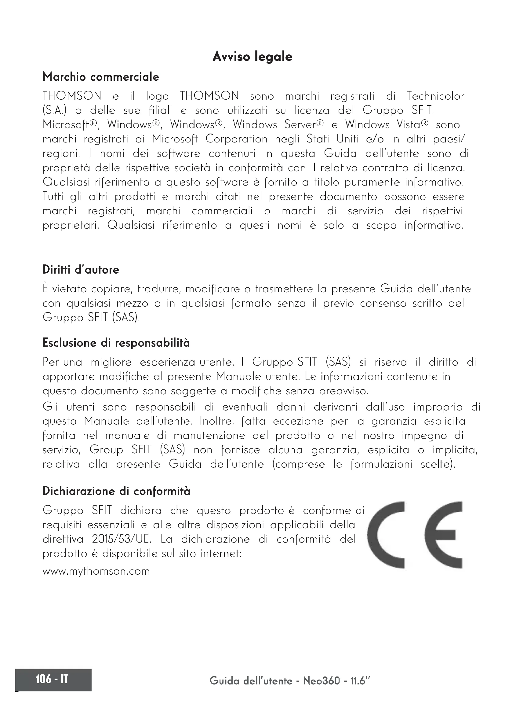 Guida dell’utente - Neo360 - 11.6’’ mythomson.com Avviso legale Marchio commerciale THOMSON e il logo THOMSON sono marchi registrati di Technicolor (S.A.) o delle sue liali e sono utilizzati su licenza del Gruppo SFIT. Microsoft®, Windows®, Windows®, Windows Server® e Windows Vista® sono marchi registrati di Microsoft Corporation negli Stati Uniti e/o in altri paesi/ regioni. I nomi dei software contenuti in questa Guida dell’utente sono di proprietà delle rispettive società in conformità con il relativo contratto di licenza. Qualsiasi riferimento a questo software è fornito a titolo puramente informativo. Tutti gli altri prodotti e marchi citati nel presente documento possono essere marchi registrati, marchi commerciali o marchi di servizio dei rispettivi proprietari. Qualsiasi riferimento a questi nomi è solo a scopo informativo. Diritti d’autore È vietato copiare, tradurre, modicare o trasmettere la presente Guida dell’utente con qualsiasi mezzo o in qualsiasi formato senza il previo consenso scritto del Gruppo SFIT (SAS). Esclusione di responsabilità Per una migliore esperienza utente, il Gruppo SFIT (SAS) si riserva il diritto di apportare modiche al presente Manuale utente. Le informazioni contenute in questo documento sono soggette a modiche senza preavviso. Gli utenti sono responsabili di eventuali danni derivanti dall’uso improprio di questo Manuale dell’utente. Inoltre, fatta eccezione per la garanzia esplicita fornita nel manuale di manutenzione del prodotto o nel nostro impegno di servizio, Group SFIT (SAS) non fornisce alcuna garanzia, esplicita o implicita, relativa alla presente Guida dell’utente (comprese le formulazioni scelte). Dichiarazione di conformità Gruppo SFIT dichiara che questo prodotto è conforme ai requisiti essenziali e alle altre disposizioni applicabili della direttiva 2015/53/UE. La dichiarazione di conformità del prodotto è disponibile sul sito internet: www.mythomson.comIT - 107 mythomson.com - Importanti indicazioni di sicurezza - Questa unità deve essere utilizzata in un ambiente con una temperatura ambiente compresa tra 5°C (41°F) e 35°C (95°F). Non esporre l’apparecchio alla pioggia o all’umidità e tenerlo lontano da liquidi. In caso di spruzzi d’acqua o altri liquidi sull’unità, spegnere immediatamente l’unità e attendere che sia completamente asciutta prima di riaccenderla. Non esporre l’apparecchio direttamente alla radiazione solare. Non utilizzare solventi forti, detergenti liquidi o altri prodotti chimici sulla supercie dell’unità o in prossimità di essa per evitare la corrosione o il deterioramento della supercie dell’unità. Non esporre la fotocamera a un ambiente polveroso. Non utilizzare l’unità durante una fuga di gas. Non esporre il dispositivo a forti campi magnetici o elettrici. È possibile far passare il dispositivo attraverso i rilevatori di raggi X dell’aeroporto. Tuttavia, si raccomanda di non far passare il dispositivo attraverso i portali di rilevamento magnetico e di non esporlo a rivelatori portatili. Non mettere niente, non disporre nessun oggetto sul dispositivo. Non appoggiare l’unità su una supercie irregolare o instabile. Assicurarsi di proteggere l’unità da cadute o qualsiasi altro impatto che possa danneggiarla. Non lasciare l’apparecchio acceso o caricato sulle ginocchia o su qualsiasi altra parte del corpo per evitare il rischio di lesioni dovute al calore. Spegnere l’apparecchio prima di trasportarlo o coprirlo con un materiale che non consente una circolazione ottimale dell’aria. Non utilizzare cavi di alimentazione, accessori o altri dispositivi danneggiati con l’apparecchio. Si raccomanda l’uso esclusivo degli accessori (alimentatore, cavi, ecc.) forniti con l’apparecchio.108 - IT Guida dell’utente - Neo360 - 11.6’’ mythomson.com Utilizzare solo le batterie originali. La sostituzione della batteria con una batteria errata può causare un rischio di esplosione. Non smontare, modicare o riparare l’apparecchio da solo, in quanto ciò potrebbe invalidare la garanzia. Si prega di eseguire regolarmente il backup dei contenuti importanti per evitare la perdita di dati. La nostra azienda non si assume alcuna responsabilità per la perdita o la rimozione degli elementi contenuti nel dispositivo a causa di un uso improprio dell’hardware o del software, della mancanza di manutenzione o di qualsiasi altro evento accidentale. A pieno volume, l’ascolto prolungato del dispositivo audio portatile può danneggiare l’udito dell’utente. Questo prodotto è stato progettato per consentire un corretto riciclaggio di parti e componenti. Il simbolo di un bidone barrato indica che l’apparecchio non deve essere smaltito insieme ai riuti urbani. Consultare le normative locali per lo smaltimento dei dispositivi elettronici. Il simbolo di un bidone barrato indica che la batteria non deve essere smaltita insieme ai riuti urbani. Consultare le normative locali per lo smaltimento delle batterie.IT - 109 mythomson.com Vista frontale - Presentazione del dispositivo -