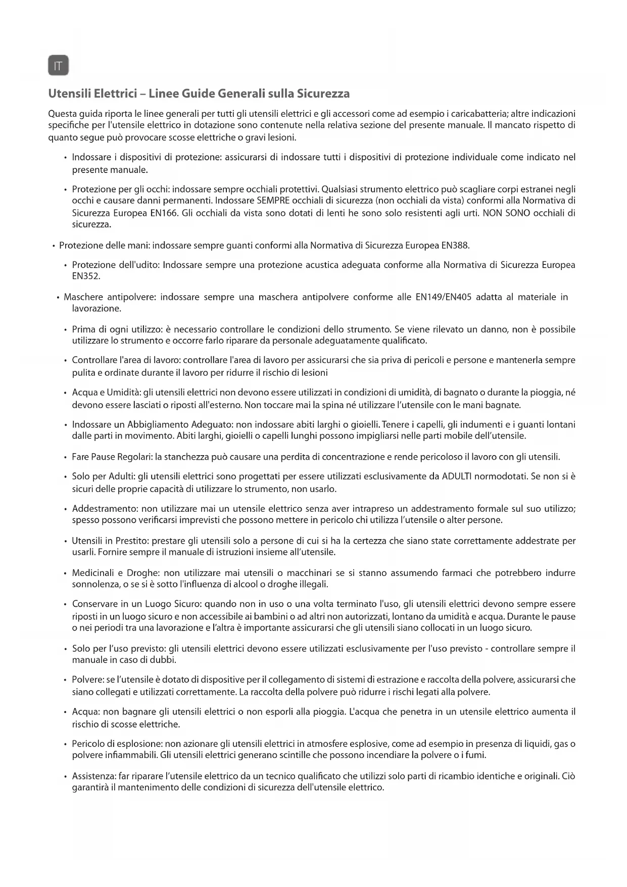 - Solo per l’uso previsto: gli utensili elettrici devono essere utilizzati esclusivamente per l'uso previsto - controllare sempre il manuale in caso di dubbi.