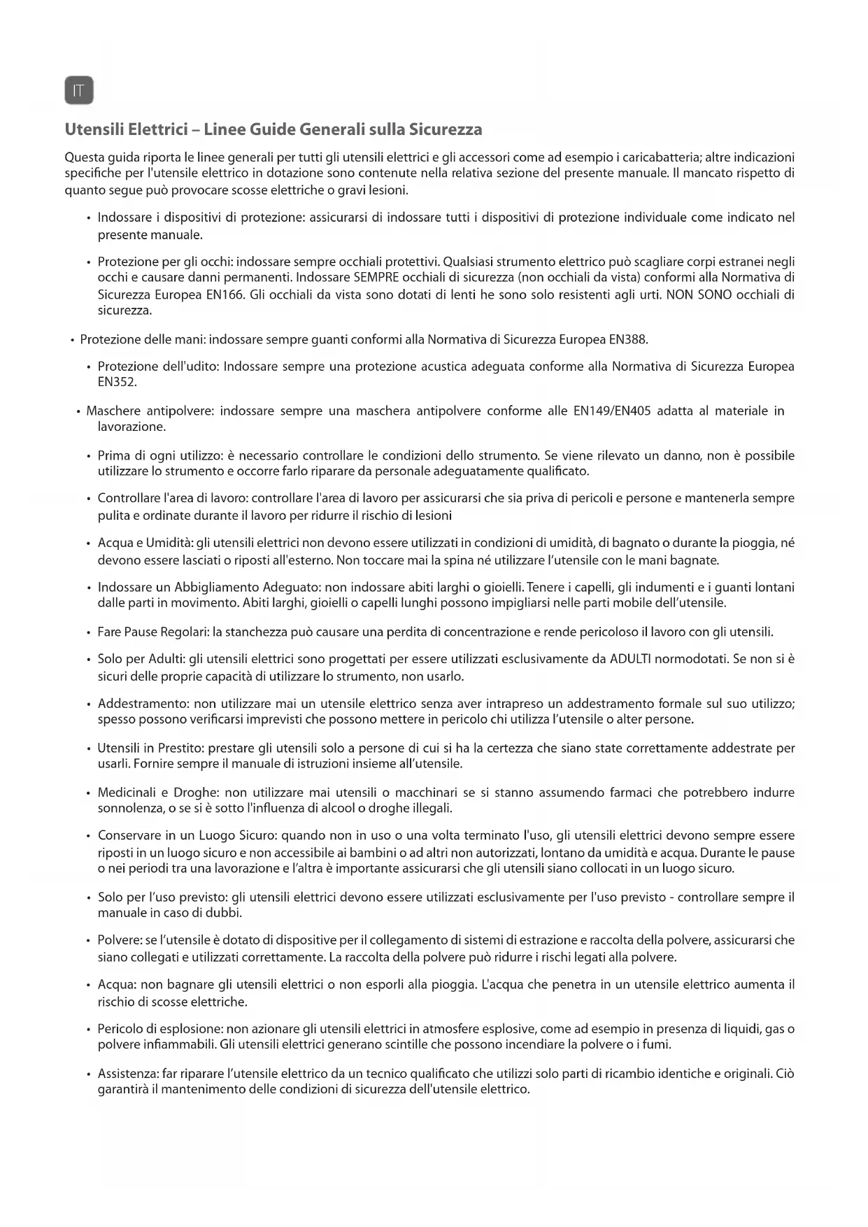 - Solo per l’uso previsto: gli utensili elettrici devono essere utilizzati esclusivamente per l'uso previsto - controllare sempre il manuale in caso di dubbi.