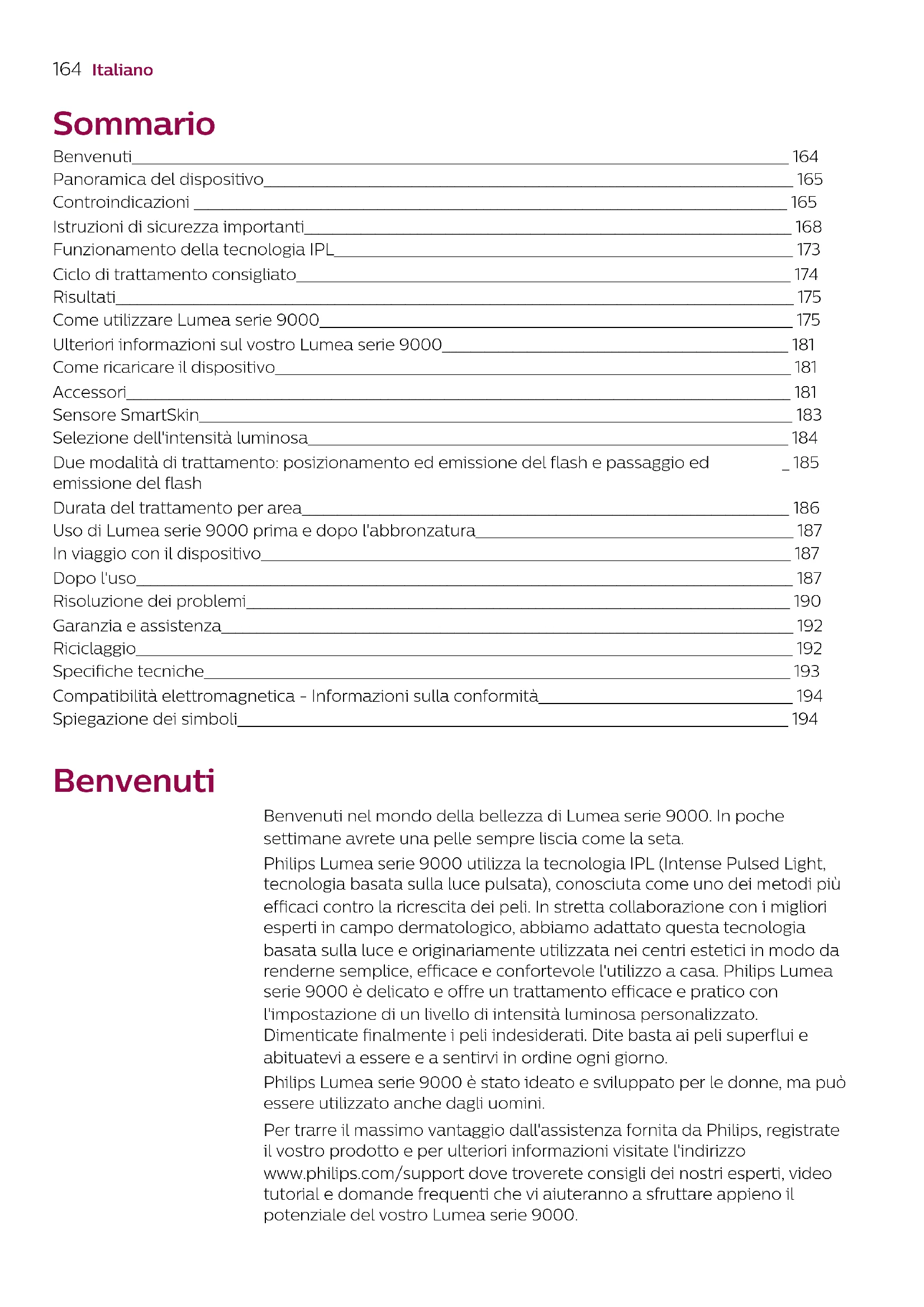 Italiano Sommario Benvenuti_____________________________________________________________________________________________ 164 Panoramica del dispositivo___________________________________________________________________________ 165 Controindicazioni ____________________________________________________________________________________ 165 Istruzioni di sicurezza importanti_____________________________________________________________________ 168 Funzionamento della tecnologia IPL_________________________________________________________________ 173 Ciclo di trattamento consigliato______________________________________________________________________ 174 Risultati________________________________________________________________________________________________ 175 Come utilizzare Lumea serie 9000___________________________________________________________________ 175 Ulteriori informazioni sul vostro Lumea serie 9000_________________________________________________ 181 Come ricaricare il dispositivo_________________________________________________________________________ 181 Accessori______________________________________________________________________________________________ 181 Sensore SmartSkin____________________________________________________________________________________ 183 Selezione dell'intensità luminosa____________________________________________________________________ 184 Due modalità di trattamento: posizionamento ed emissione del flash e passaggio ed emissione del flash _ 185 Durata del trattamento per area_____________________________________________________________________ 186 Uso di Lumea serie 9000 prima e dopo l'abbronzatura_____________________________________________ 187 In viaggio con il dispositivo___________________________________________________________________________ 187 Dopo l'uso_____________________________________________________________________________________________ 187 Risoluzione dei problemi_____________________________________________________________________________ 190 Garanzia e assistenza_________________________________________________________________________________ 192 Riciclaggio_____________________________________________________________________________________________ 192 Specifiche tecniche___________________________________________________________________________________ 193 Compatibilità elettromagnetica - Informazioni sulla conformità____________________________________ 194 Spiegazione dei simboli______________________________________________________________________________ 194 Benvenuti Benvenuti nel mondo della bellezza di Lumea serie 9000. In poche settimane avrete una pelle sempre liscia come la seta. Philips Lumea serie 9000 utilizza la tecnologia IPL (Intense Pulsed Light, tecnologia basata sulla luce pulsata), conosciuta come uno dei metodi più efficaci contro la ricrescita dei peli. In stretta collaborazione con i migliori esperti in campo dermatologico, abbiamo adattato questa tecnologia basata sulla luce e originariamente utilizzata nei centri estetici in modo da renderne semplice, efficace e confortevole l'utilizzo a casa. Philips Lumea serie 9000 è delicato e offre un trattamento efficace e pratico con l'impostazione di un livello di intensità luminosa personalizzato. Dimenticate finalmente i peli indesiderati. Dite basta ai peli superflui e abituatevi a essere e a sentirvi in ordine ogni giorno. Philips Lumea serie 9000 è stato ideato e sviluppato per le donne, ma può essere utilizzato anche dagli uomini. Per trarre il massimo vantaggio dall'assistenza fornita da Philips, registrate il vostro prodotto e per ulteriori informazioni visitate l'indirizzo www.philips.com/support dove troverete consigli dei nostri esperti, video tutorial e domande frequenti che vi aiuteranno a sfruttare appieno il potenziale del vostro Lumea serie 9000.165 Italiano Nota: conservate sempre queste istruzioni con il prodotto. Panoramica del dispositivo 1 Finestra di emissione della luce con filtro UV integrato 2 Accessori a Accessorio corpo b Accessorio viso c Accessorio zona bikini (BRI957, BRI958) d Accessorio ascellare (BRI957, BRI958) e Accessorio di precisione (BRI955) 3 Sensore SmartSkin 4 Sistema di sicurezza integrato 5 Riflettore all'interno dell'accessorio 6 Contatti elettrici 7 Apertura per contatti elettrici 8 Pulsante per l'emissione flash 9 Pulsante on/off 10 Pulsante di conferma 11 Pulsanti di selezione 12 Spie di intensità 13 Pulsante di impostazione consigliata 14 Spia di "luce pronta" 15 Fori di ventilazione 16 Presa dispositivo 17 Adattatore 18 Spinotto 19 Custodia elegante (non illustrato) 20 Panno per la pulizia (non illustrato) Controindicazioni Condizioni Non utilizzate il dispositivo: