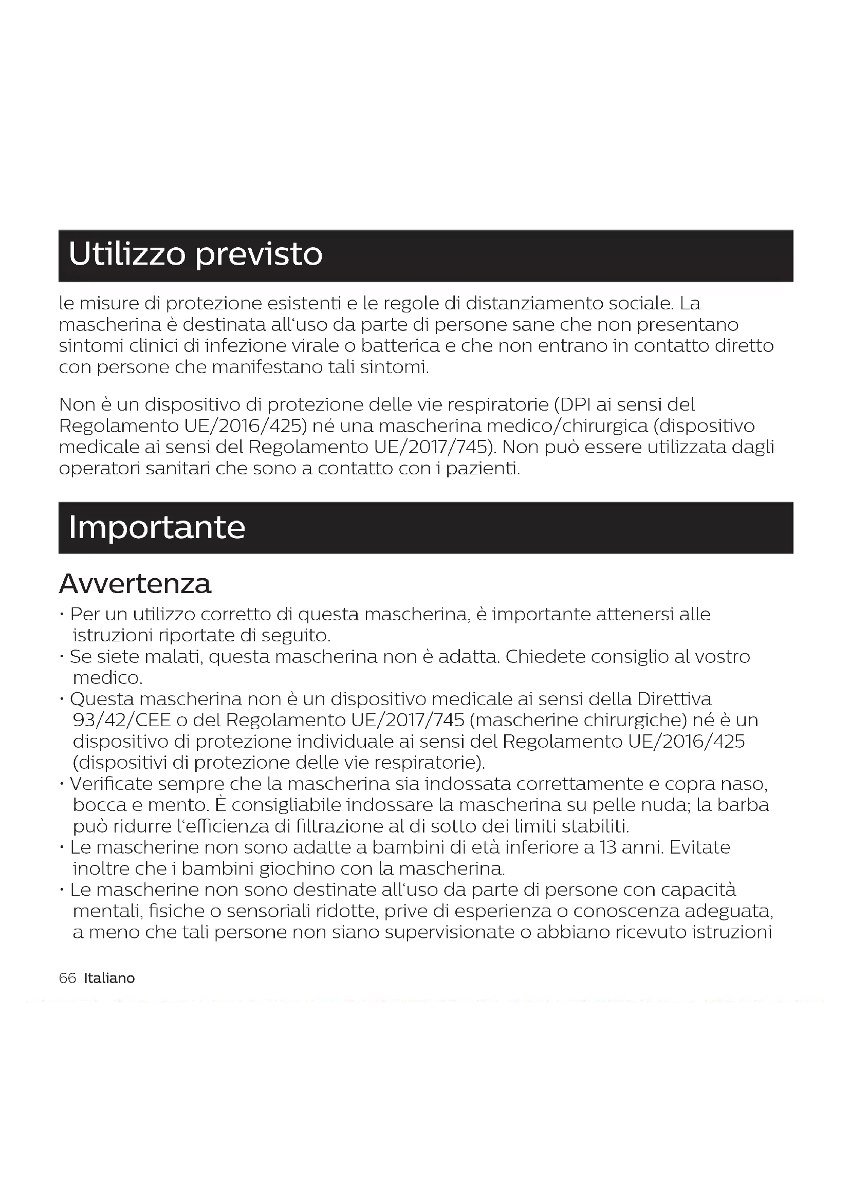 - Questa mascherina non è un dispositivo medicale ai sensi della Direttiva 93/42/CEE o del Regolamento UE/2017/745 (mascherine chirurgiche) né è un dispositivo di protezione individuale ai sensi del Regolamento UE/2016/425 (dispositivi di protezione delle vie respiratorie).