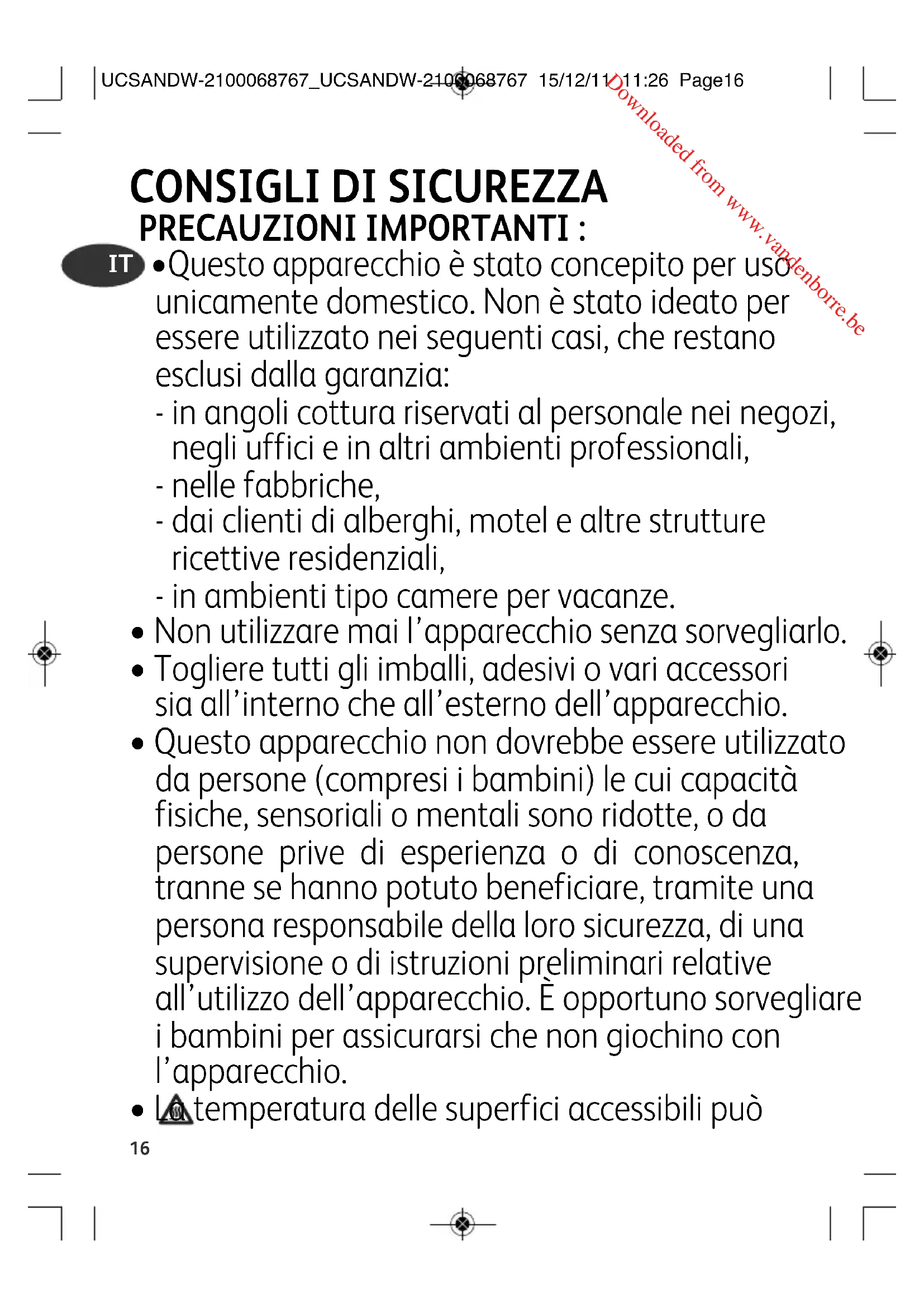 UCSANDW-2100068767_UCSANDW-2100068767 15/12/11 11:26 Page16 Downloaded from www.vandenborre.be17 essere elevata quando l’apparecchio è in funzione.
