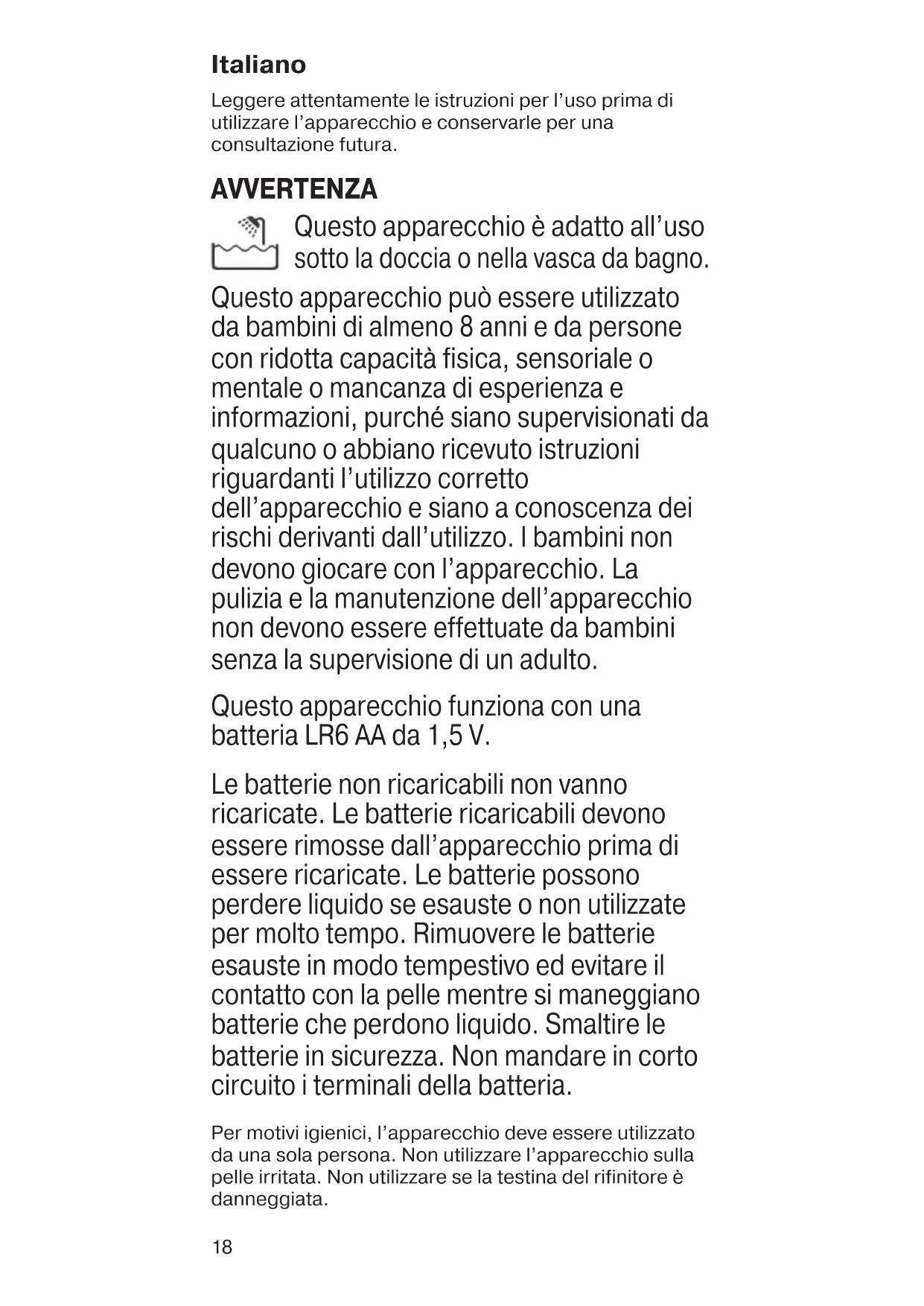 Questo apparecchio può essere utilizzato da bambini di almeno 8 anni e da persone con ridotta capacità fisica, sensoriale o mentale o mancanza di esperienza e informazioni, purché siano supervisionati da qualcuno o abbiano ricevuto istruzioni riguardanti l’utilizzo corretto dell’apparecchio e siano a conoscenza dei rischi derivanti dall’utilizzo. I bambini non devono giocare con l’apparecchio. La pulizia e la manutenzione dell’apparecchio non devono essere effettuate da bambini senza la supervisione di un adulto. Questo apparecchio funziona con una batteria LR6 AA da 1,5V. Le batterie non ricaricabili non vanno ricaricate. Le batterie ricaricabili devono essere rimosse dall’apparecchio prima di essere ricaricate. Le batterie possono perdere liquido se esauste o non utilizzate per molto tempo. Rimuovere le batterie esauste in modo tempestivo ed evitare il contatto con la pelle mentre si maneggiano batterie che perdono liquido. Smaltire le batterie in sicurezza. Non mandare in corto circuito i terminali della batteria. Per motivi igienici, l’apparecchio deve essere utilizzato da una sola persona. Non utilizzare l’apparecchio sulla pelle irritata. Non utilizzare se la testina del rifinitore è danneggiata. 91050339_Body_Styler_BS_1000_EURO.indd 1891050339_Body_Styler_BS_1000_EURO.indd 18 19.02.20 13:0919.02.20 13:0919 A Modalità d’uso Ruotare l’interruttore (3) in posizione... “I” per accendere. “O” per spegnere. B Per radere, mantenere il dispositivo in posizione verticale e muoverlo in direzione opposta alla crescita dei peli. È possibile posizionare il pettine rifinitore (1) per tagliare i peli fino a 4 mm di lunghezza. C Per modellare, mantenere il dispositivo in piano. D Pulizia e manutenzione Utilizzare la spazzolina di pulizia (4) per rimuovere i peli. Accendere il dispositivo per sciacquare la testina del rifinitore (2) con acqua corrente. Per un risciacquo accurato delle parti interne, spegnere il dispositivo e aprire la testina del rifinitore premendo contro i denti. Per aiutare a mantenere alte le prestazioni del dispositivo, lubrificare il rifinitore dopo la pulizia o l’utilizzo sotto l’acqua. Applicare una goccia di olio lubrificante sul rifinitore, quindi accenderlo per pochi secondi per garantire una distribuzione uniforme dell’olio. E Sostituzione della batteria Ruotare l’interruttore (3) sulla posizione ▼ e aprire il vano batterie. Sostituire le batterie facendo attenzione a rispettare le polarità. Chiudere il copri-interruttore come mostrato e bloccarlo riportandolo in posizione “O”. Smaltimento Questo prodotto contiene batterie e/o rifiuti elettrici riciclabili. Il simbolo del cassonetto barrato riportato sull’apparecchiatura o sulla sua confezione indica che il prodotto alla fine della propria vita utile deve essere raccolto separatamente dagli altri rifiuti. L’utente dovrà, pertanto, conferire l’apparecchiatura giunta a fine vita agli idonei centri comunali di raccolta differenziata dei rifiuti elettrotecnici ed elettronici. In alternativa alla gestione autonoma è possibile consegnare l’apparecchiatura che si desidera smaltire al rivenditore, al momento dell’acquisto di una nuova apparecchiatura di tipo equivalente. Presso i rivenditori di prodotti elettronici con superficie di vendita di almeno 400 m