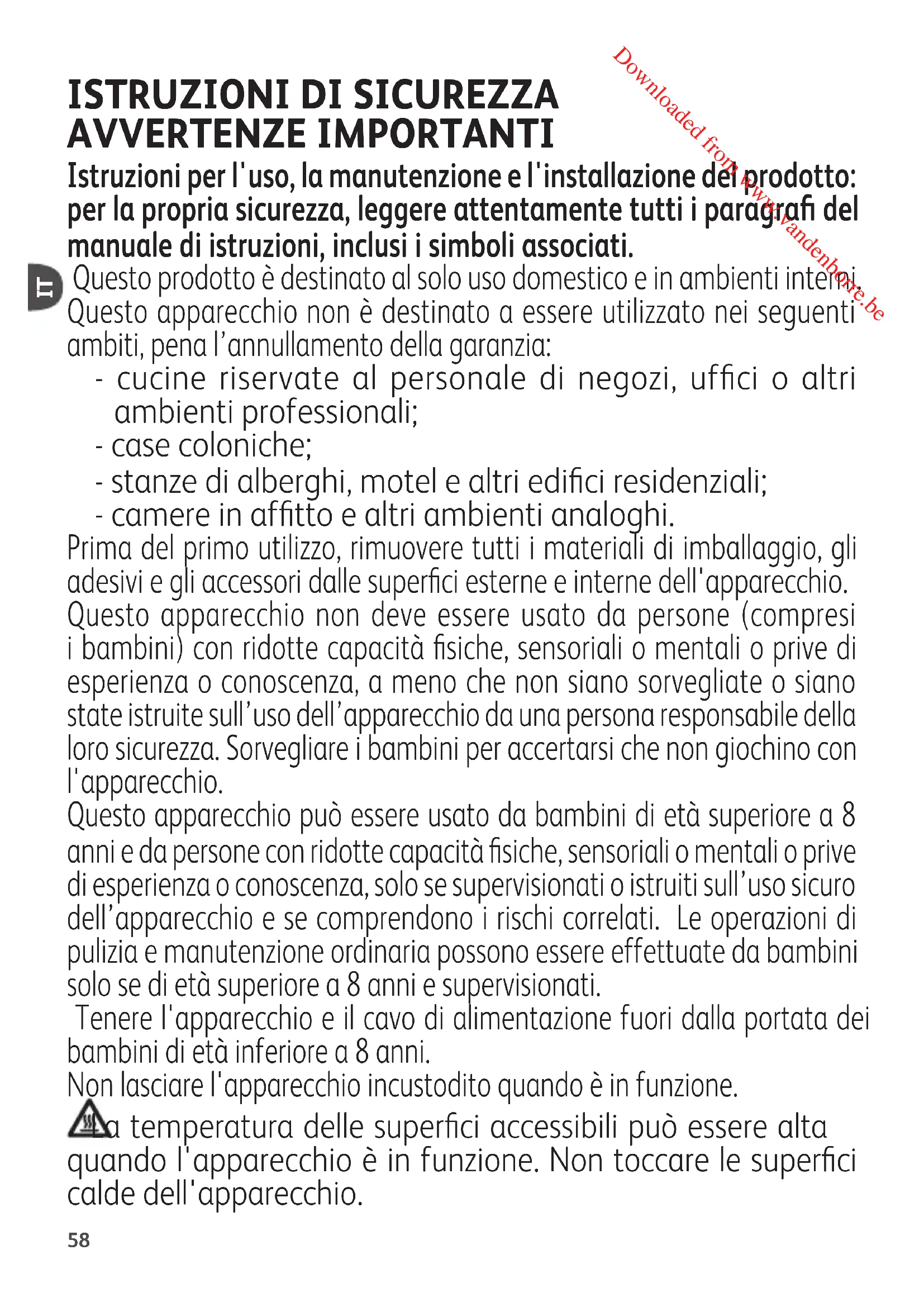 AVVERTENZE IMPORTANTI Istruzioni per l'uso, la manutenzione e l'installazione del prodotto: per la propria sicurezza, leggere attentamente tutti i paragrafi del manuale di istruzioni, inclusi i simboli associati. Questo prodotto è destinato al solo uso domestico e in ambienti interni. Questo apparecchio non è destinato a essere utilizzato nei seguenti ambiti, pena l’annullamento della garanzia: - cucine riservate al personale di negozi, uffici o altri ambienti professionali; - case coloniche; - stanze di alberghi, motel e altri edifici residenziali; - camere in affitto e altri ambienti analoghi. Prima del primo utilizzo, rimuovere tutti i materiali di imballaggio, gli adesivi e gli accessori dalle superfici esterne e interne dell'apparecchio. Questo apparecchio non deve essere usato da persone (compresi i bambini) con ridotte capacità fisiche, sensoriali o mentali o prive di esperienza o conoscenza, a meno che non siano sorvegliate o siano state istruite sull’uso dell’apparecchio da una persona responsabile della loro sicurezza. Sorvegliare i bambini per accertarsi che non giochino con l'apparecchio. Questo apparecchio può essere usato da bambini di età superiore a 8 anni e da persone con ridotte capacità fisiche, sensoriali o mentali o prive di esperienza o conoscenza, solo se supervisionati o istruiti sull’uso sicuro dell’apparecchio e se comprendono i rischi correlati. Le operazioni di pulizia e manutenzione ordinaria possono essere effettuate da bambini solo se di età superiore a 8 anni e supervisionati. Tenere l'apparecchio e il cavo di alimentazione fuori dalla portata dei bambini di età inferiore a 8 anni. Non lasciare l'apparecchio incustodito quando è in funzione. La temperatura delle superfici accessibili può essere alta quando l'apparecchio è in funzione. Non toccare le superfici calde dell'apparecchio. Downloaded from www.vandenborre.be59